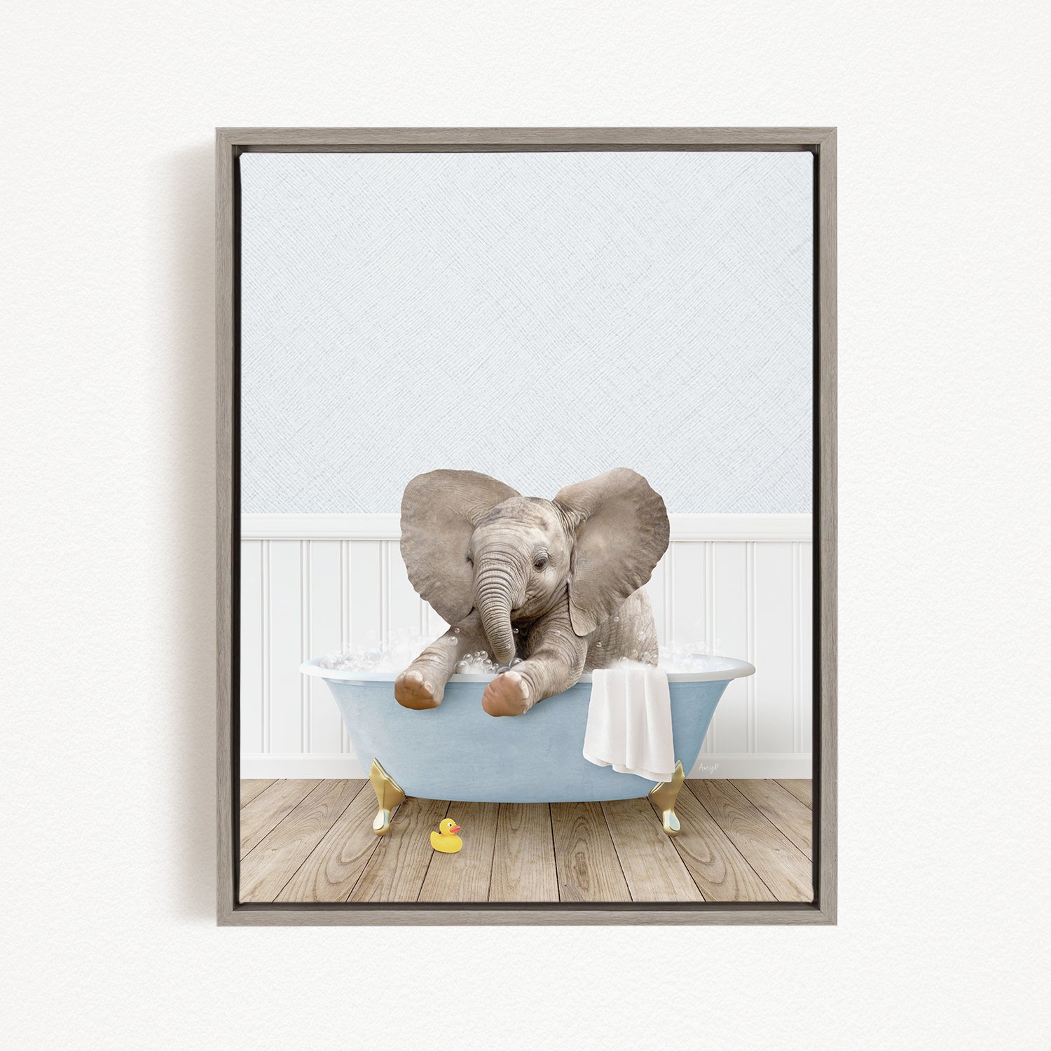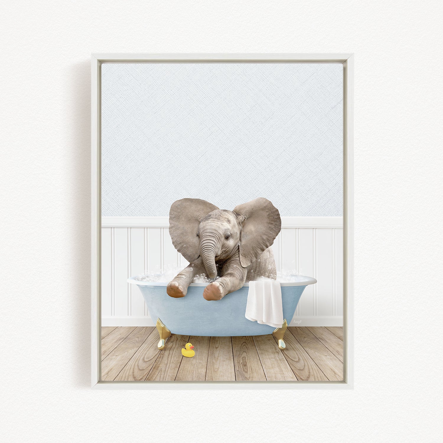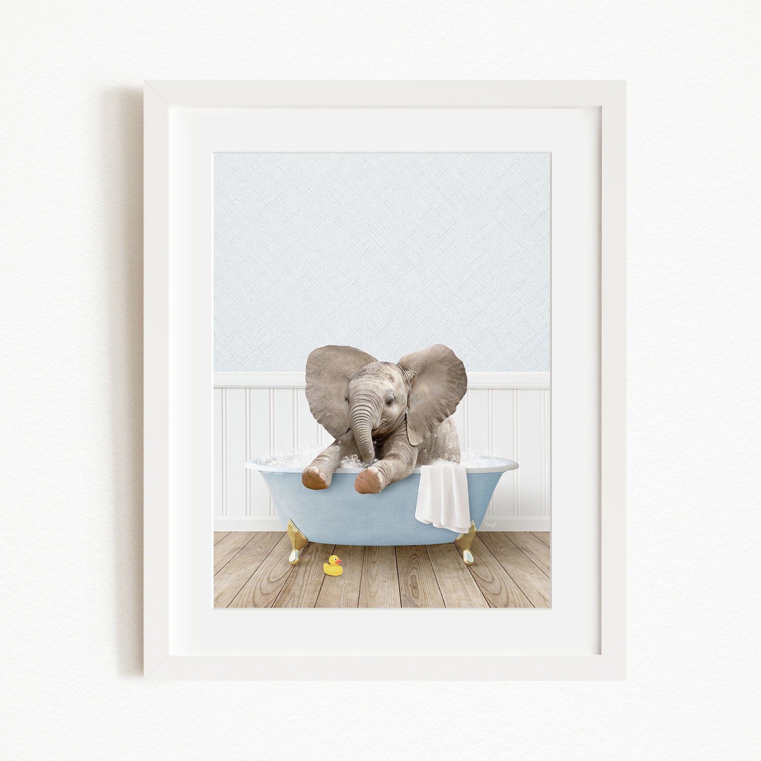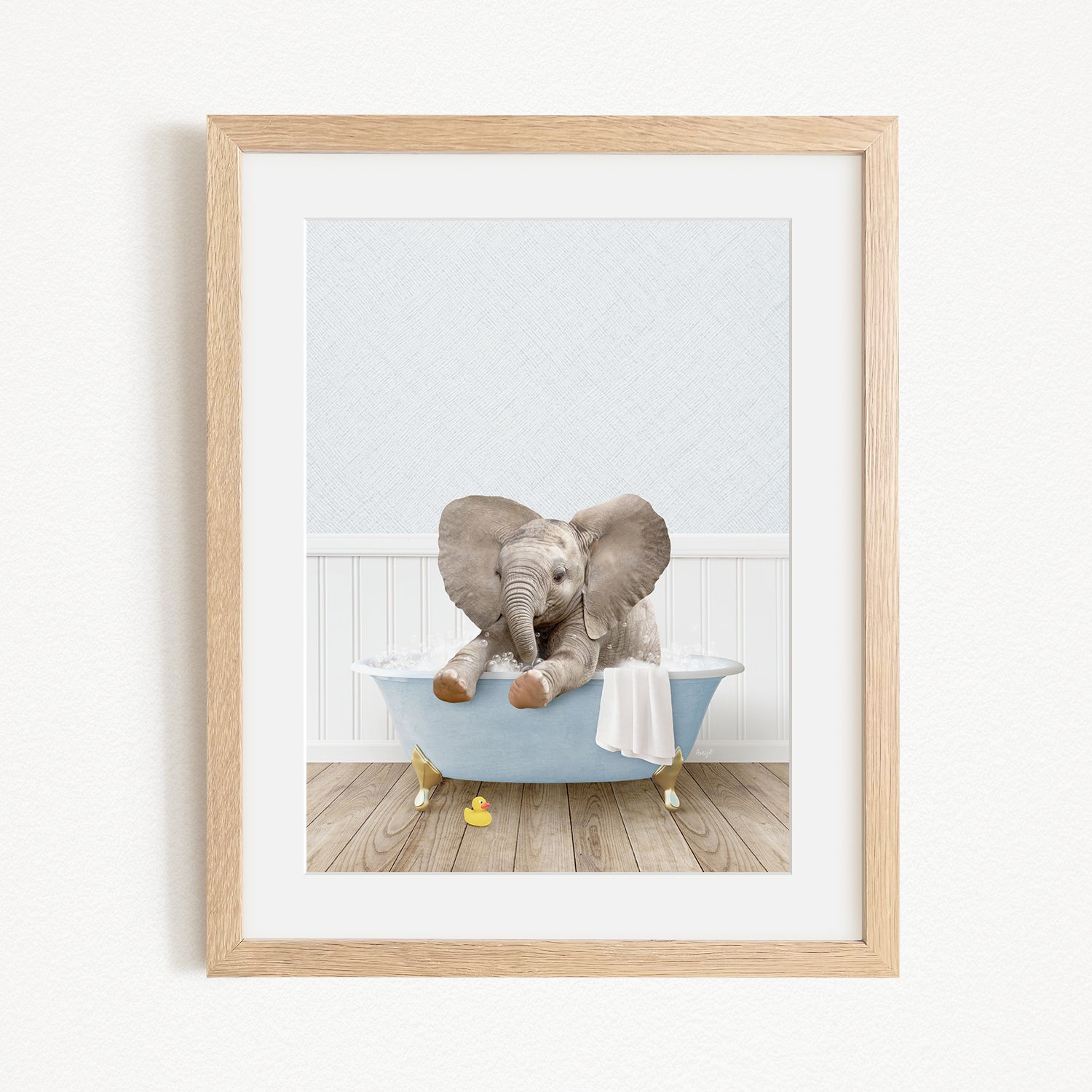 A baby elephant sitting in a blue bathtub, surrounded by yellow rubber duckies, in a wooden frame.