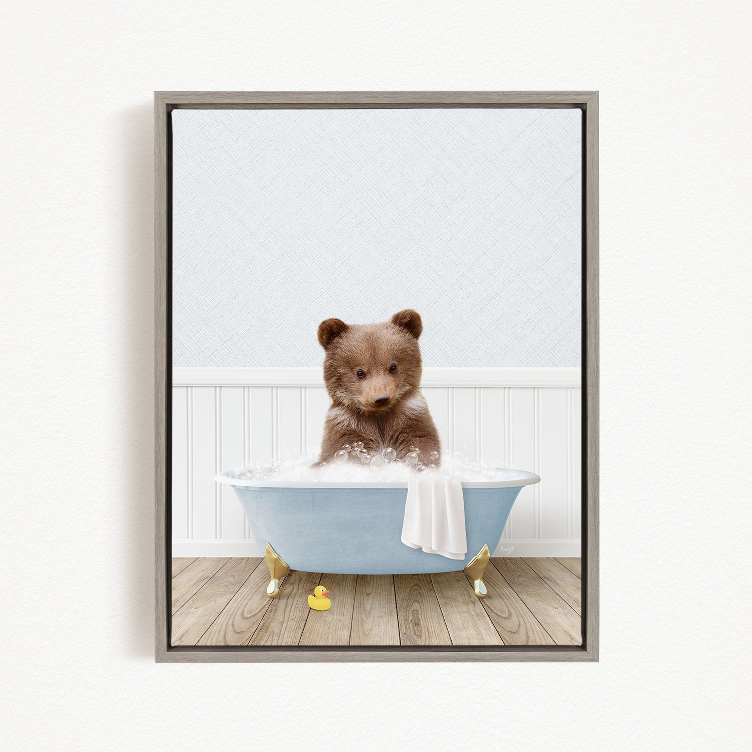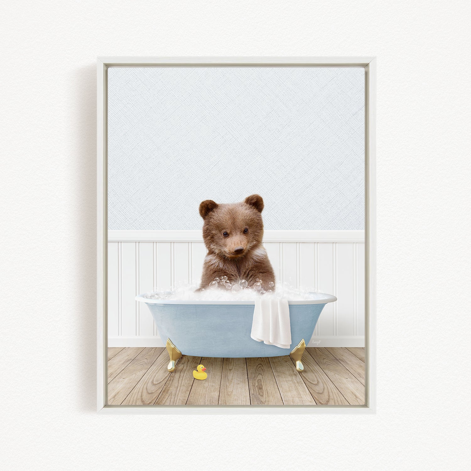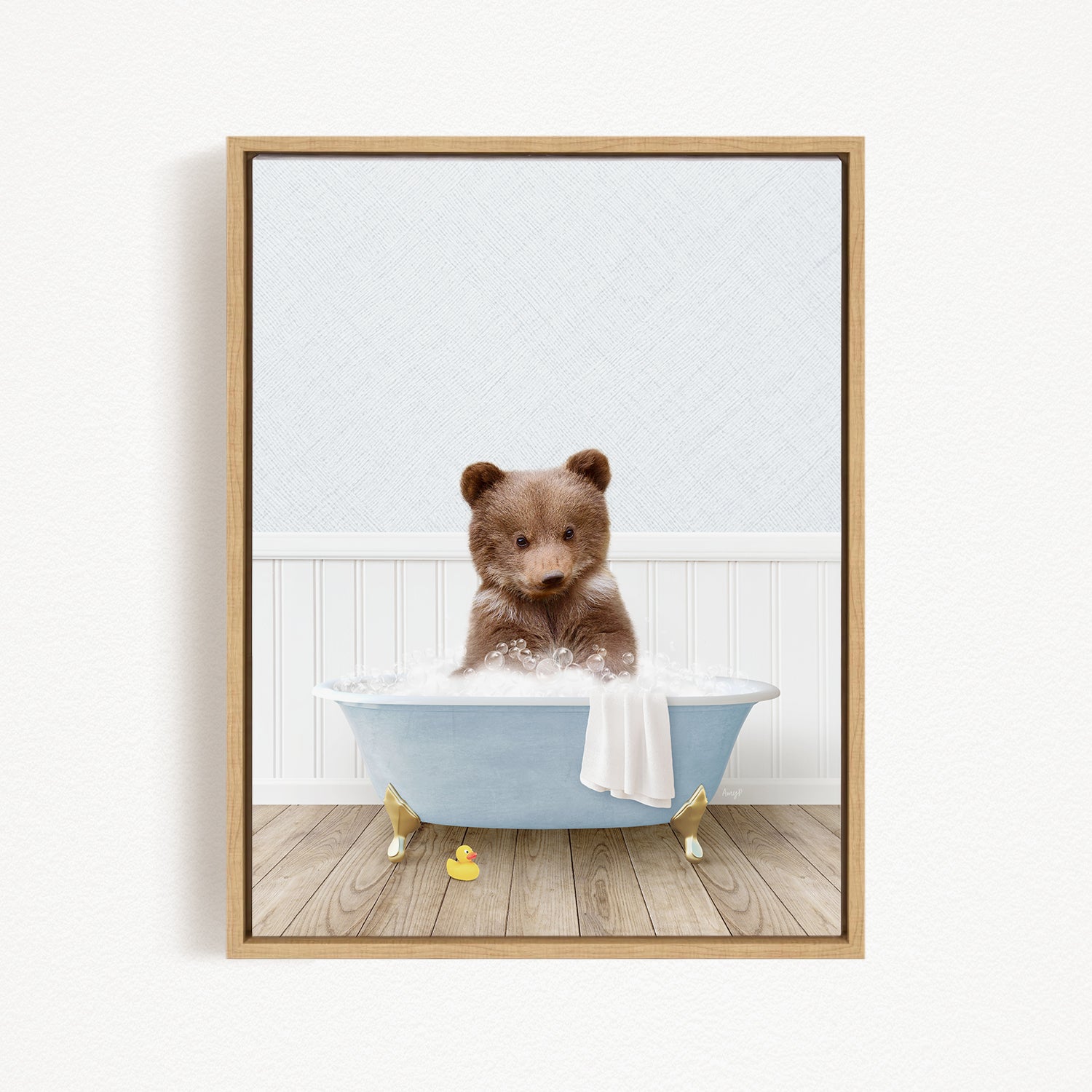 A brown bear sitting in a blue bathtub filled with bubbles, surrounded by yellow rubber duckies.
