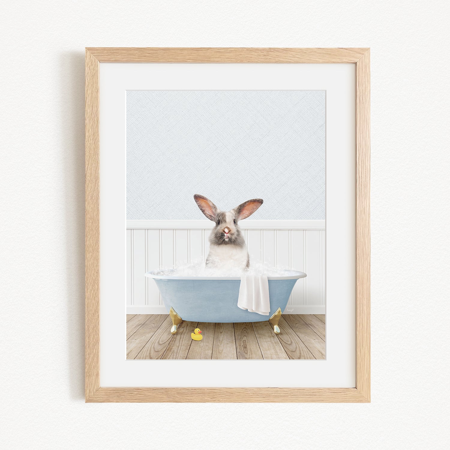 A rabbit sitting in a blue bathtub filled with bubbles, surrounded by yellow rubber duckies.