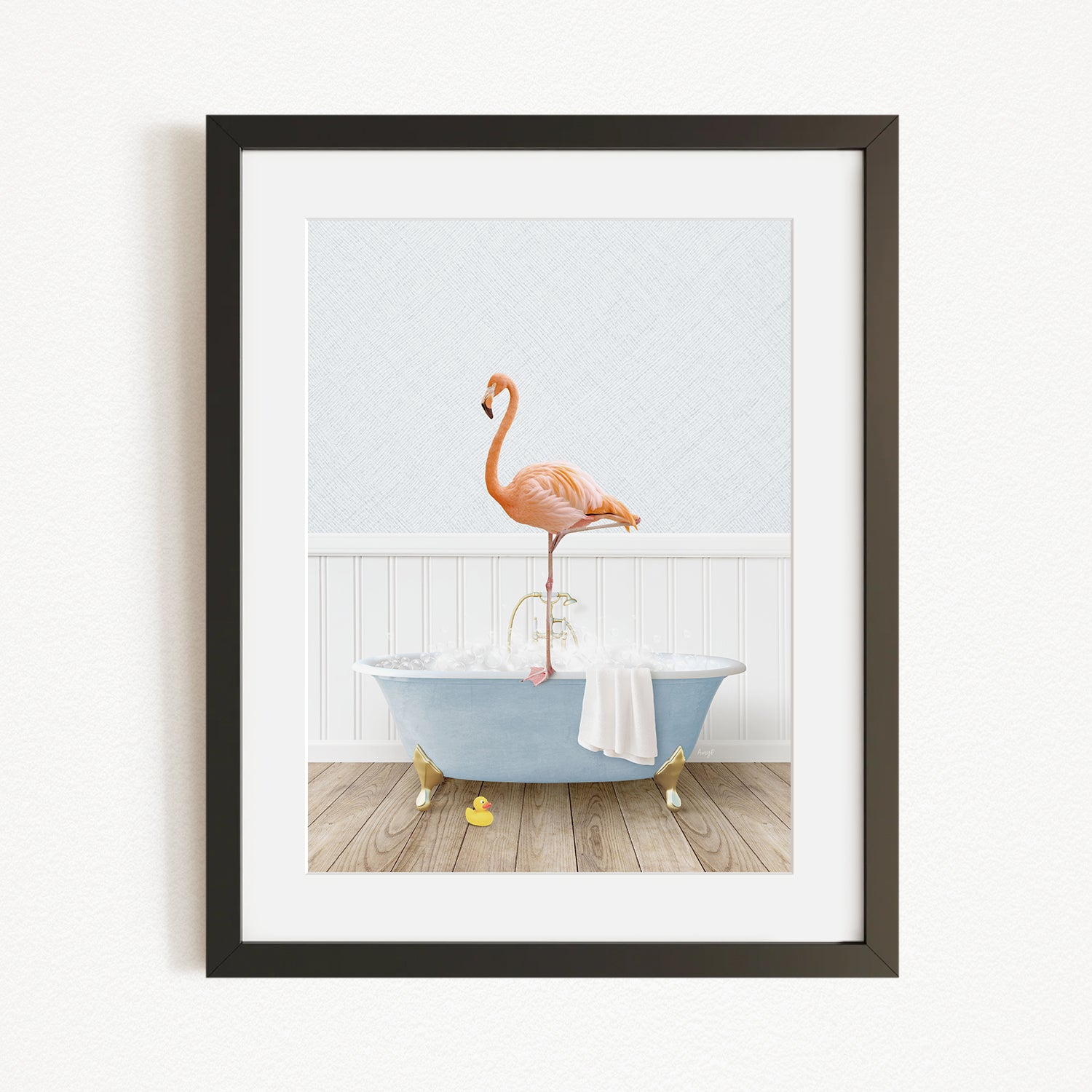 A framed image depicting a pink flamingo standing on the edge of a blue bathtub filled with water, with a white towel and yellow rubber duckies nearby.