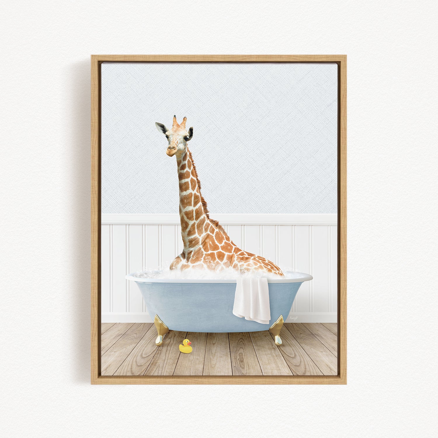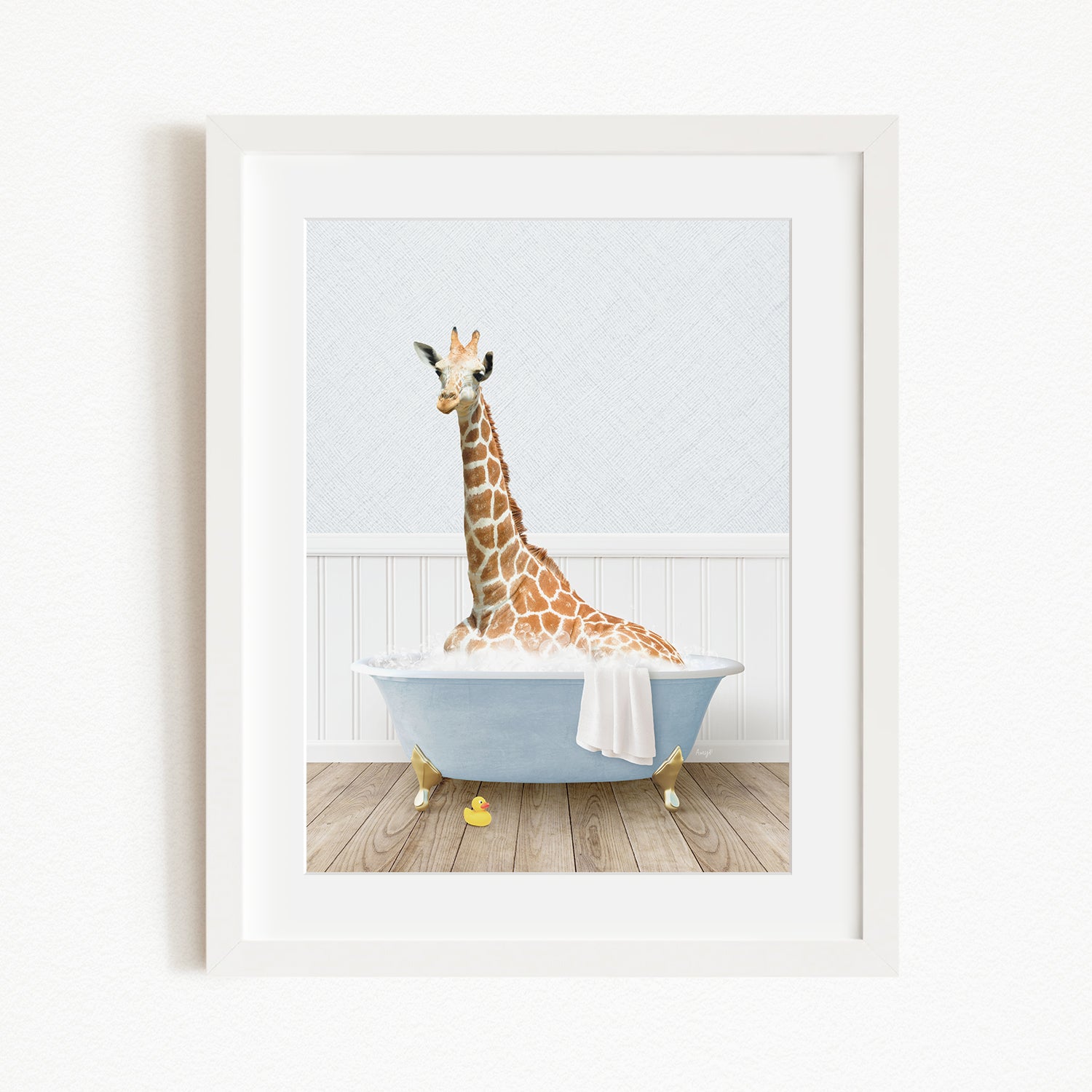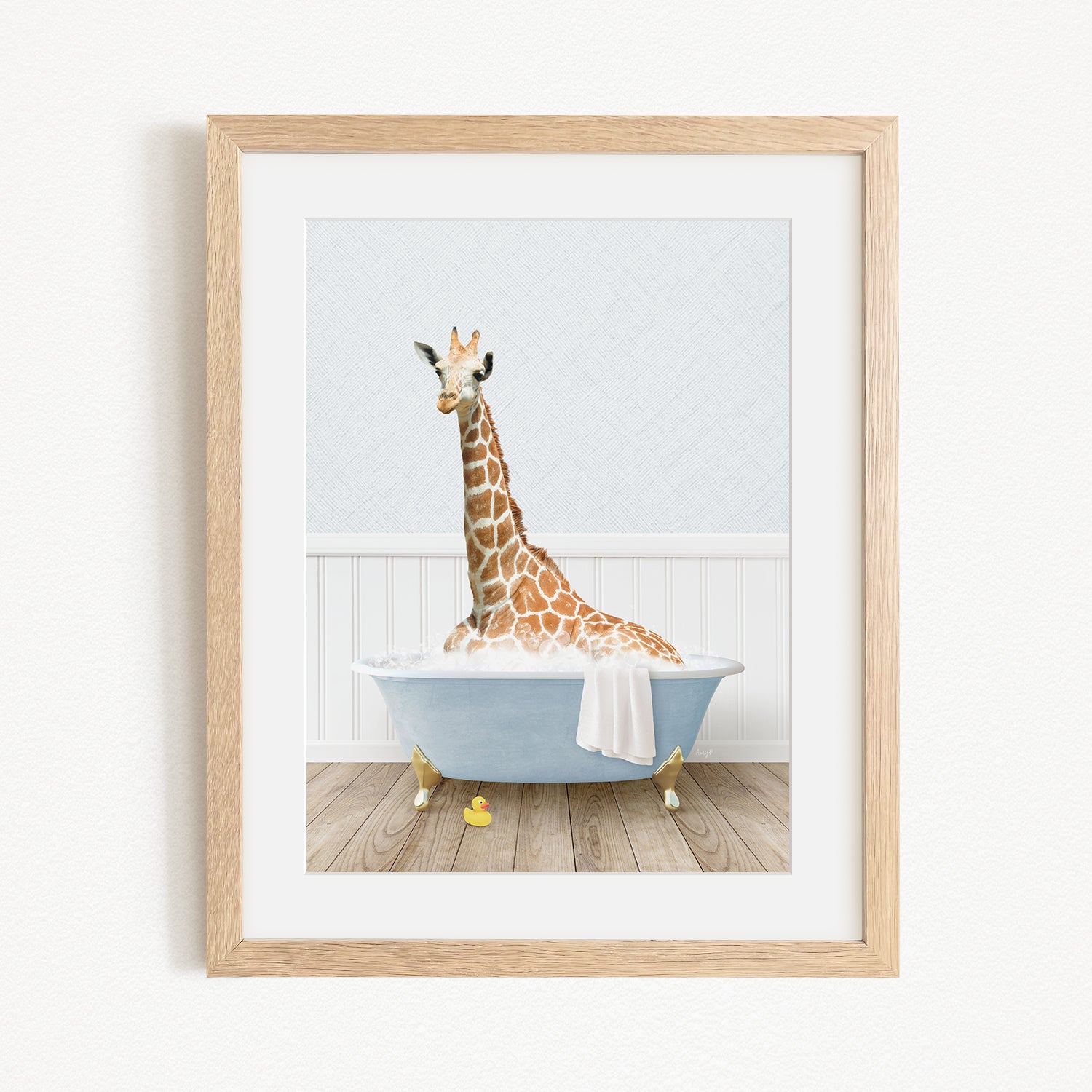 A giraffe sitting in a blue bathtub filled with water, surrounded by yellow rubber duckies.