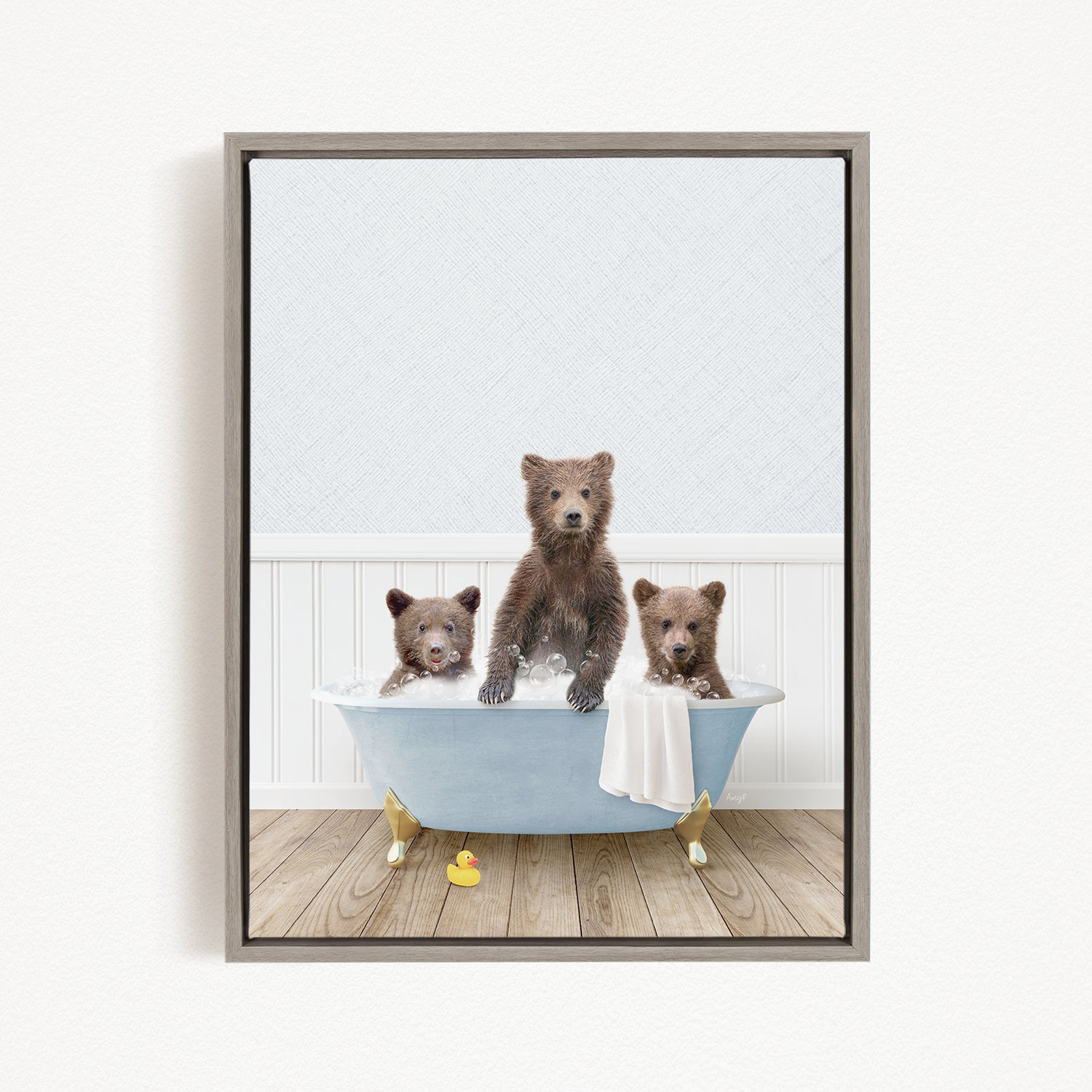 A framed image depicting three adorable brown bears sitting in a blue bathtub, with a towel and rubber duck nearby.