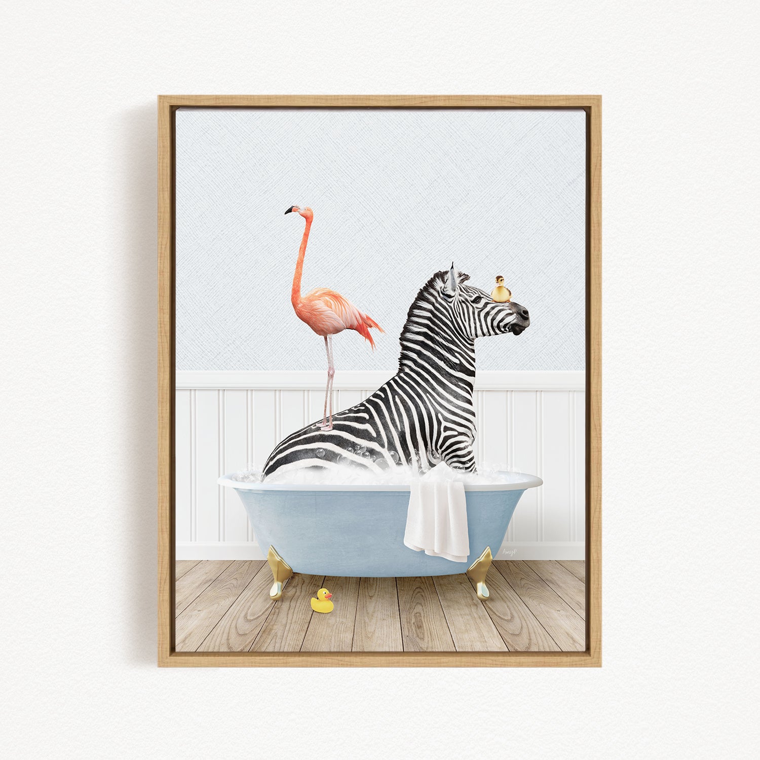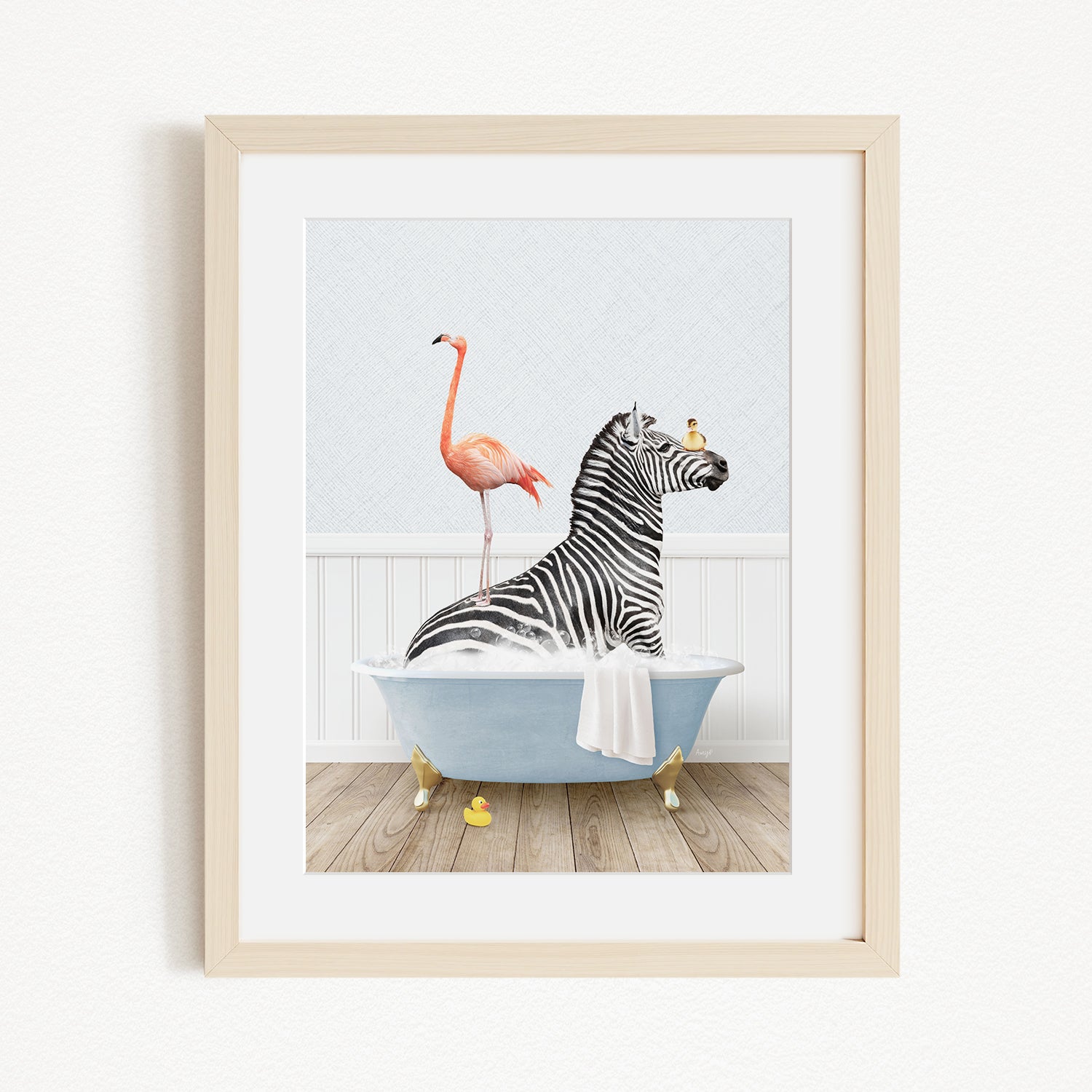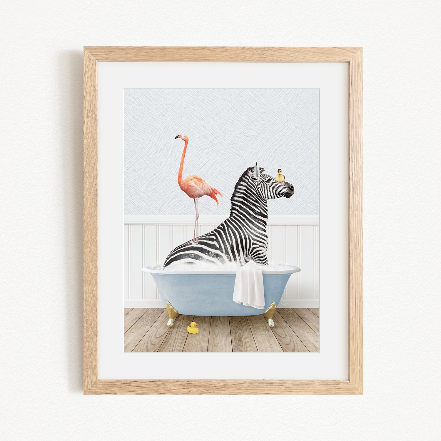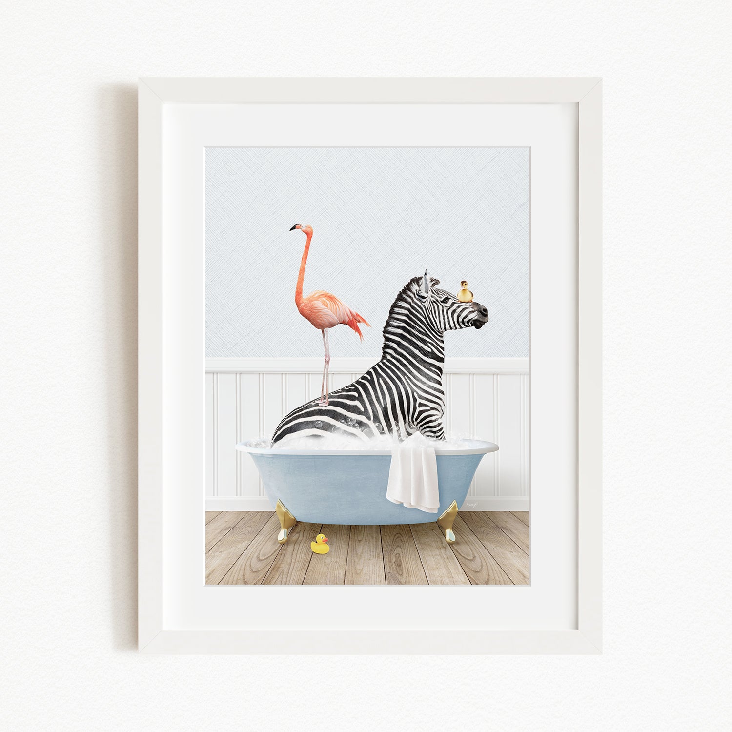 A framed illustration depicting a zebra sitting in a bathtub, with a flamingo standing on its back and a bird perched on its head.