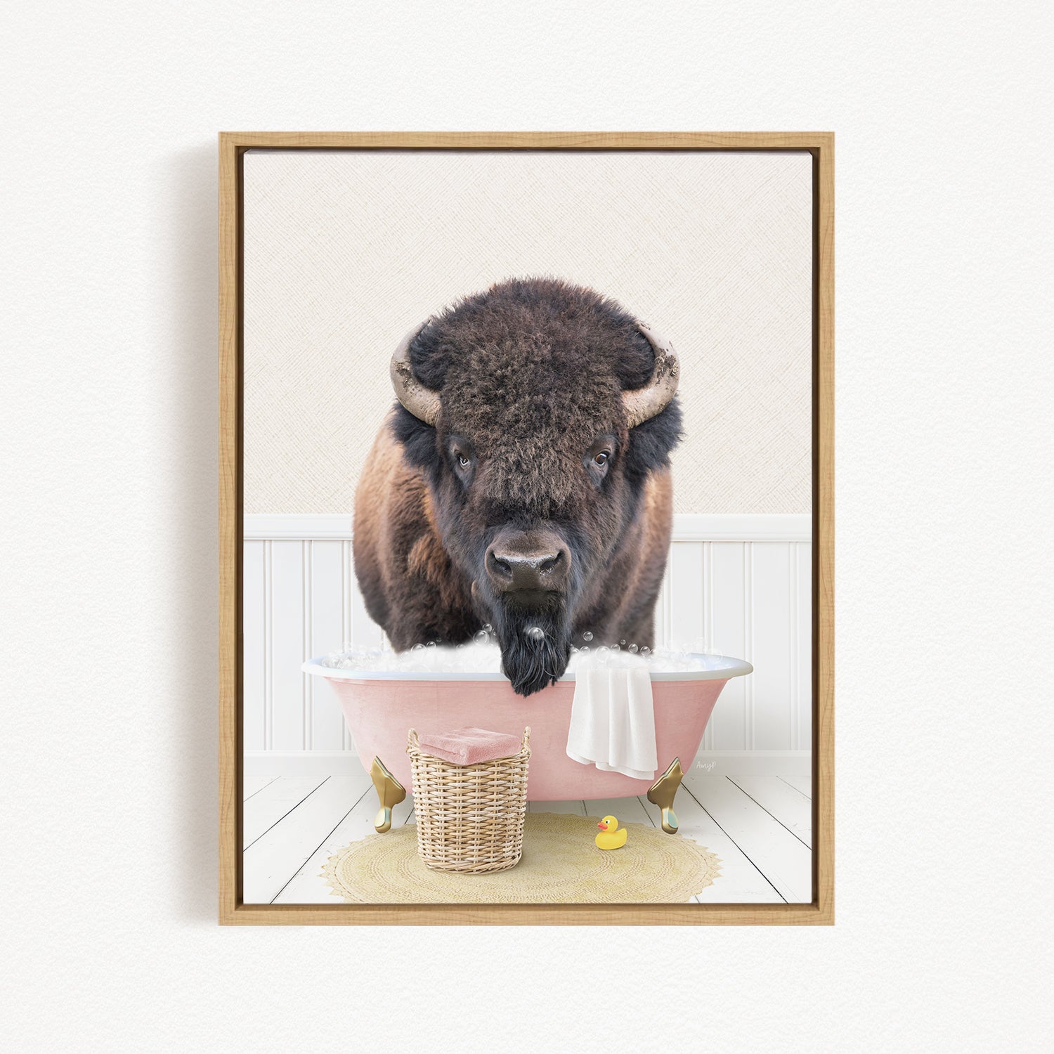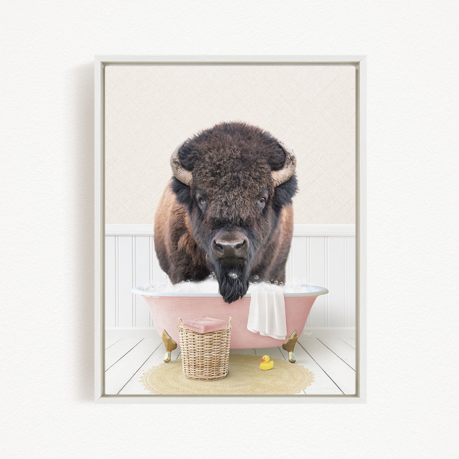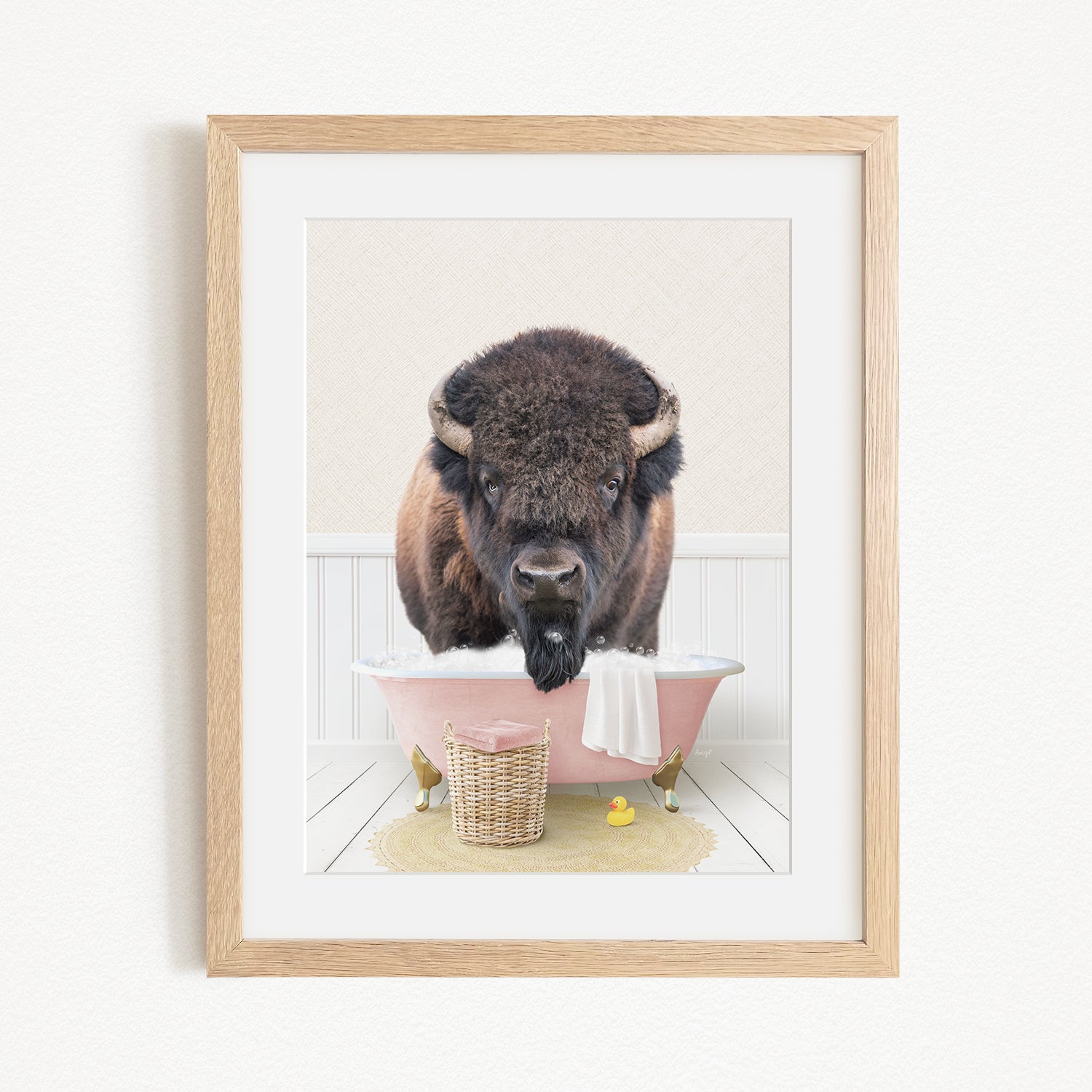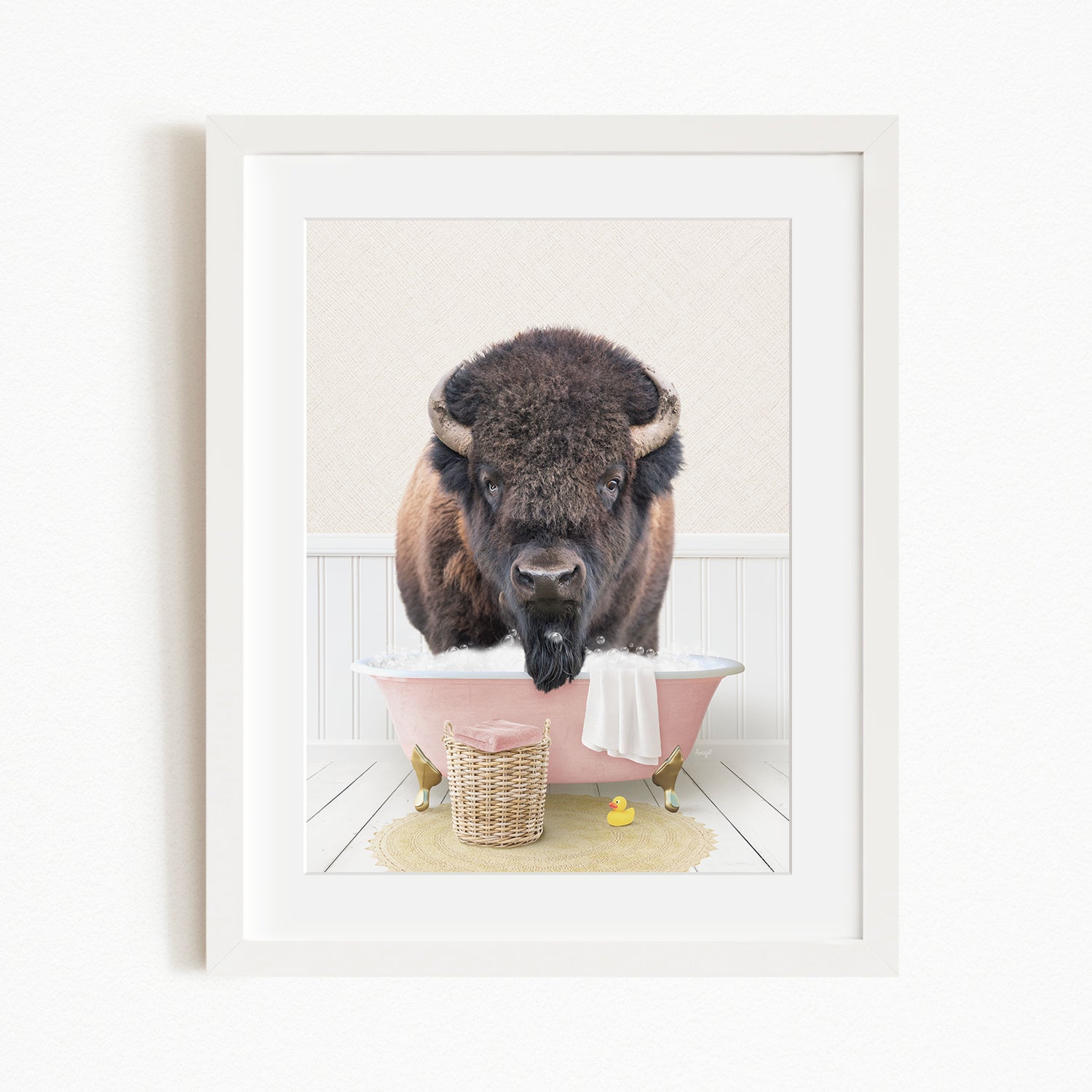 A buffalo with a long, shaggy mane is sitting in a pink bathtub, surrounded by a yellow rubber duck and a wicker basket.