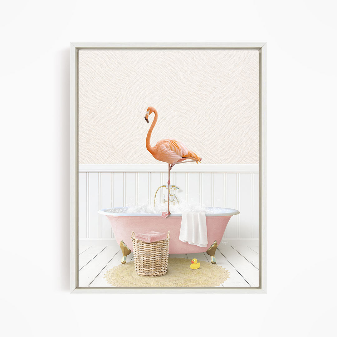 A pink flamingo stands on the edge of a pink bathtub filled with bubbles, surrounded by a yellow rubber duck and a wicker basket.