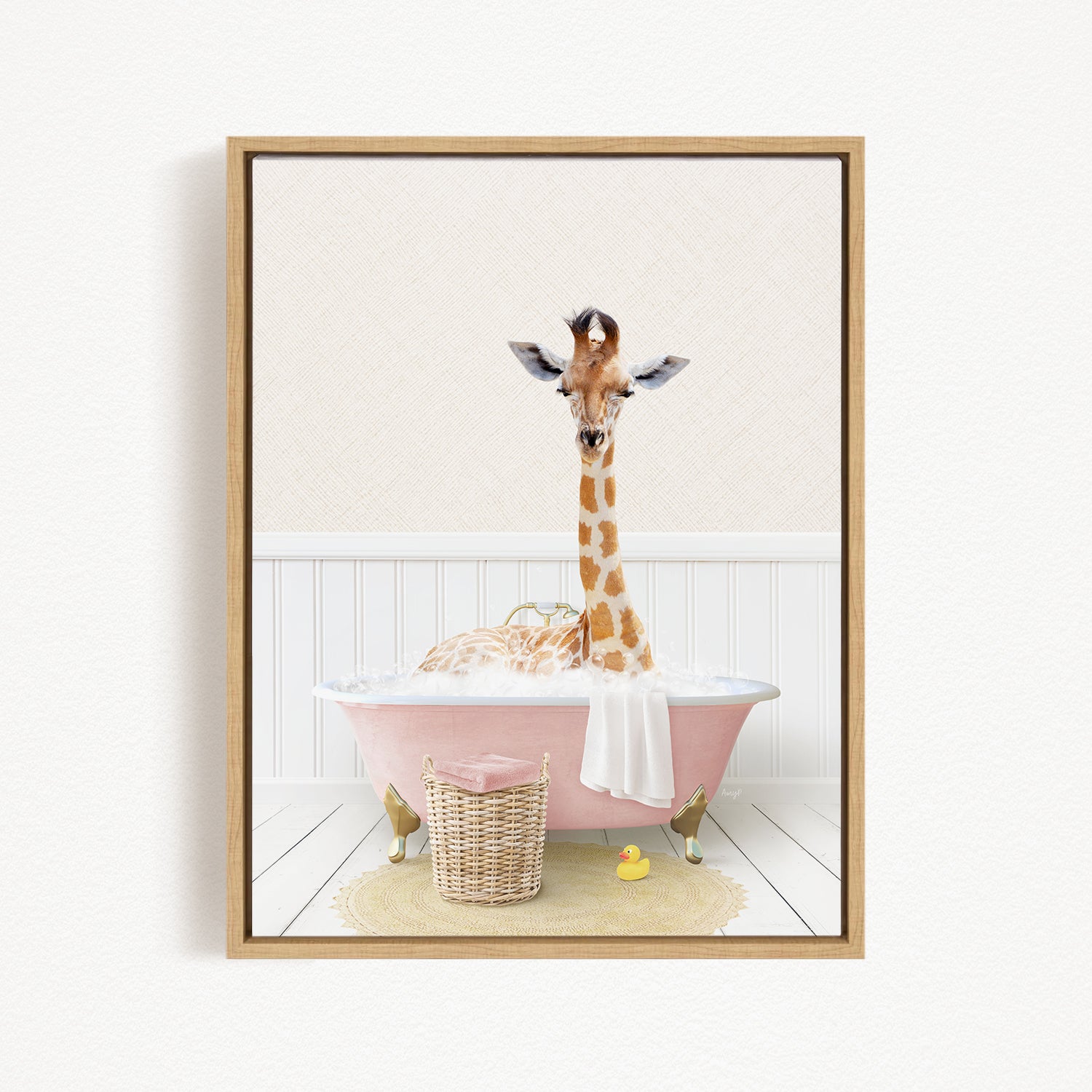 A giraffe standing in a pink bathtub filled with bubbles, surrounded by a yellow rubber duck and a basket.