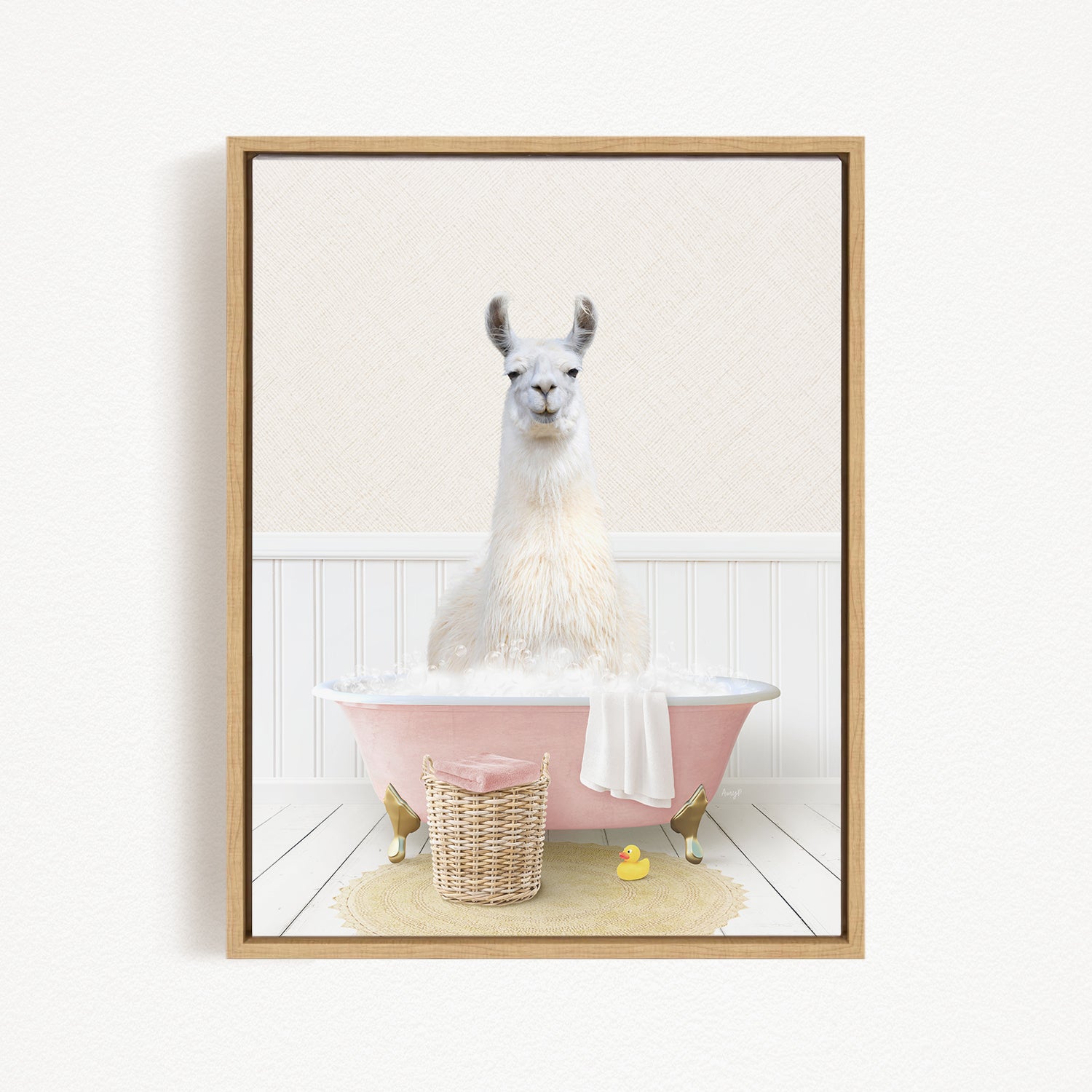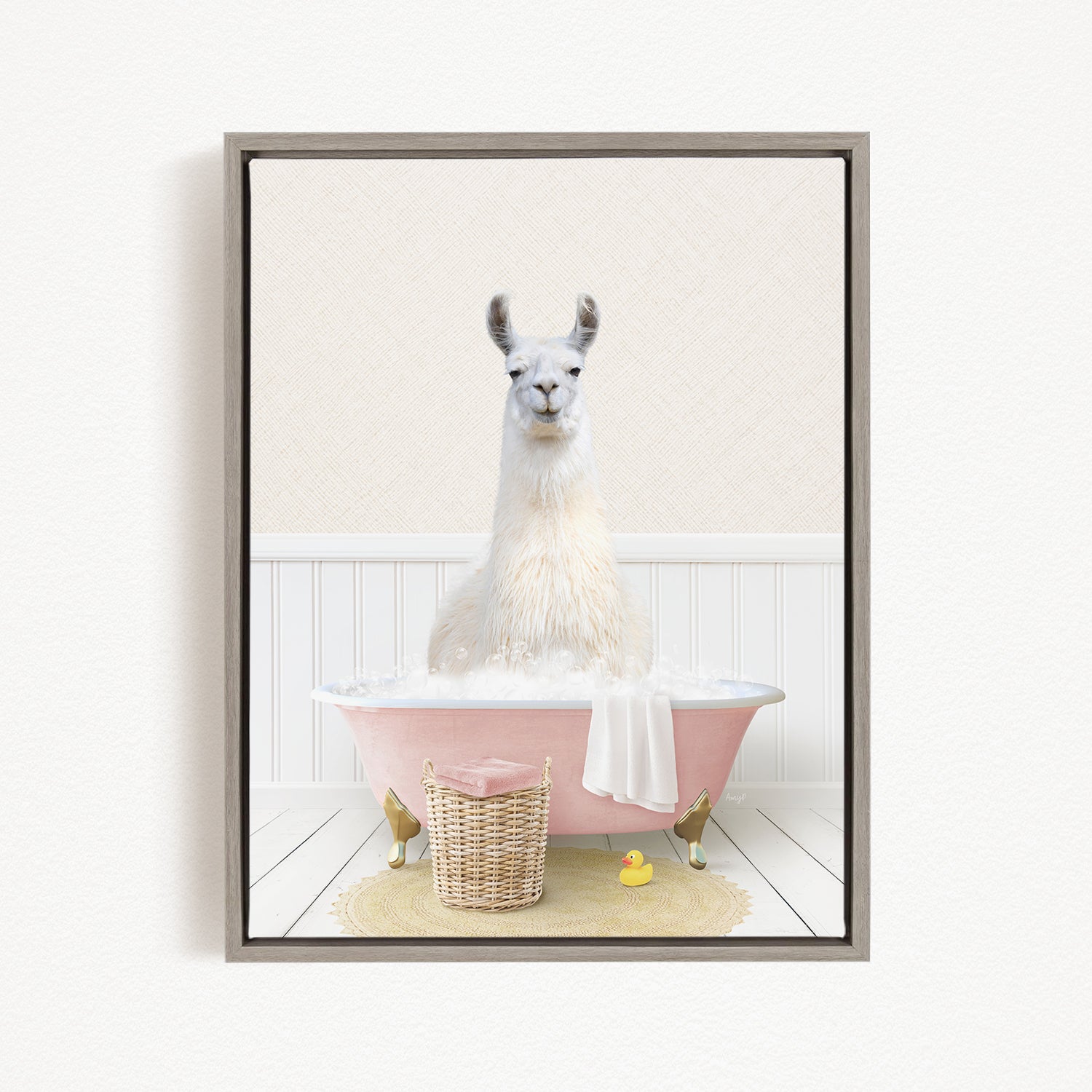 A white llama sitting in a pink bathtub filled with water, surrounded by a yellow rubber duck and a wicker basket.