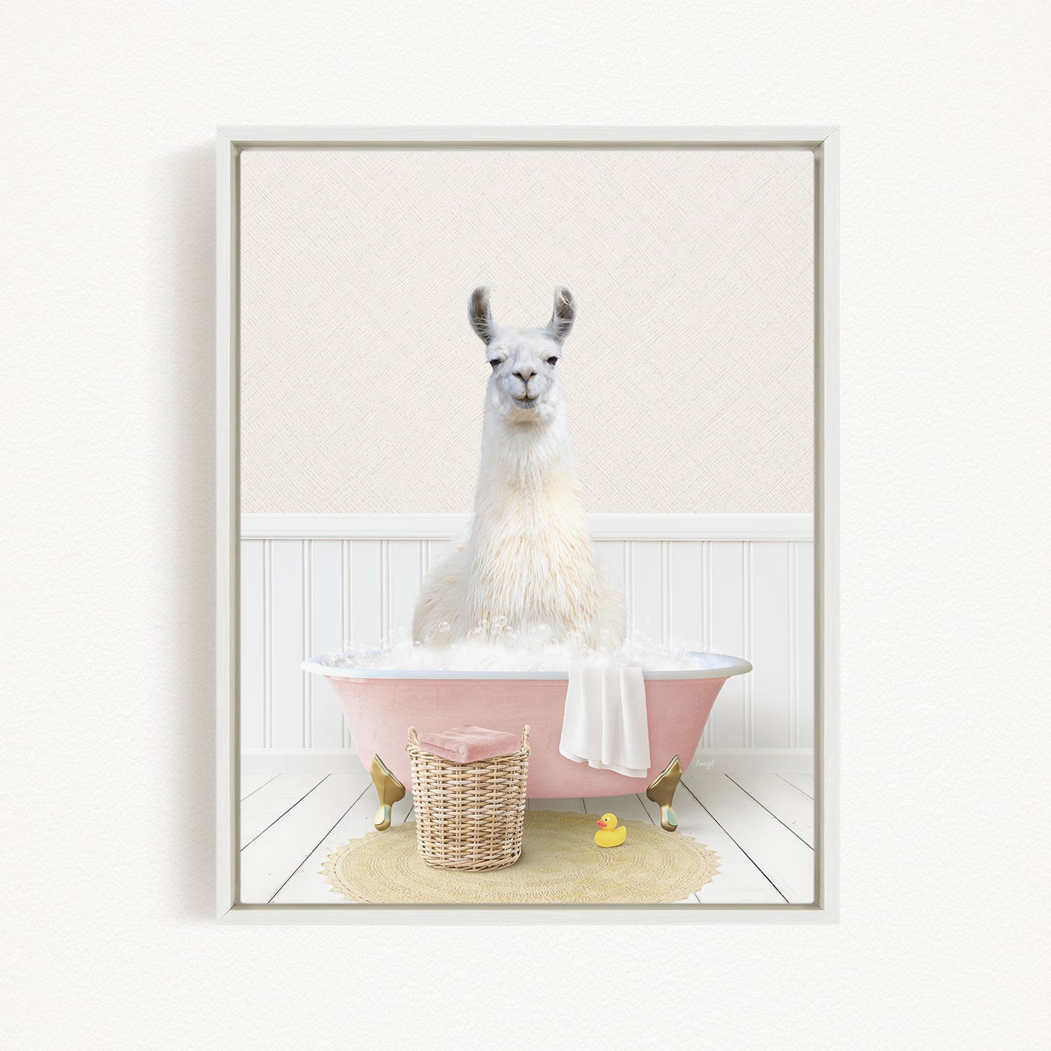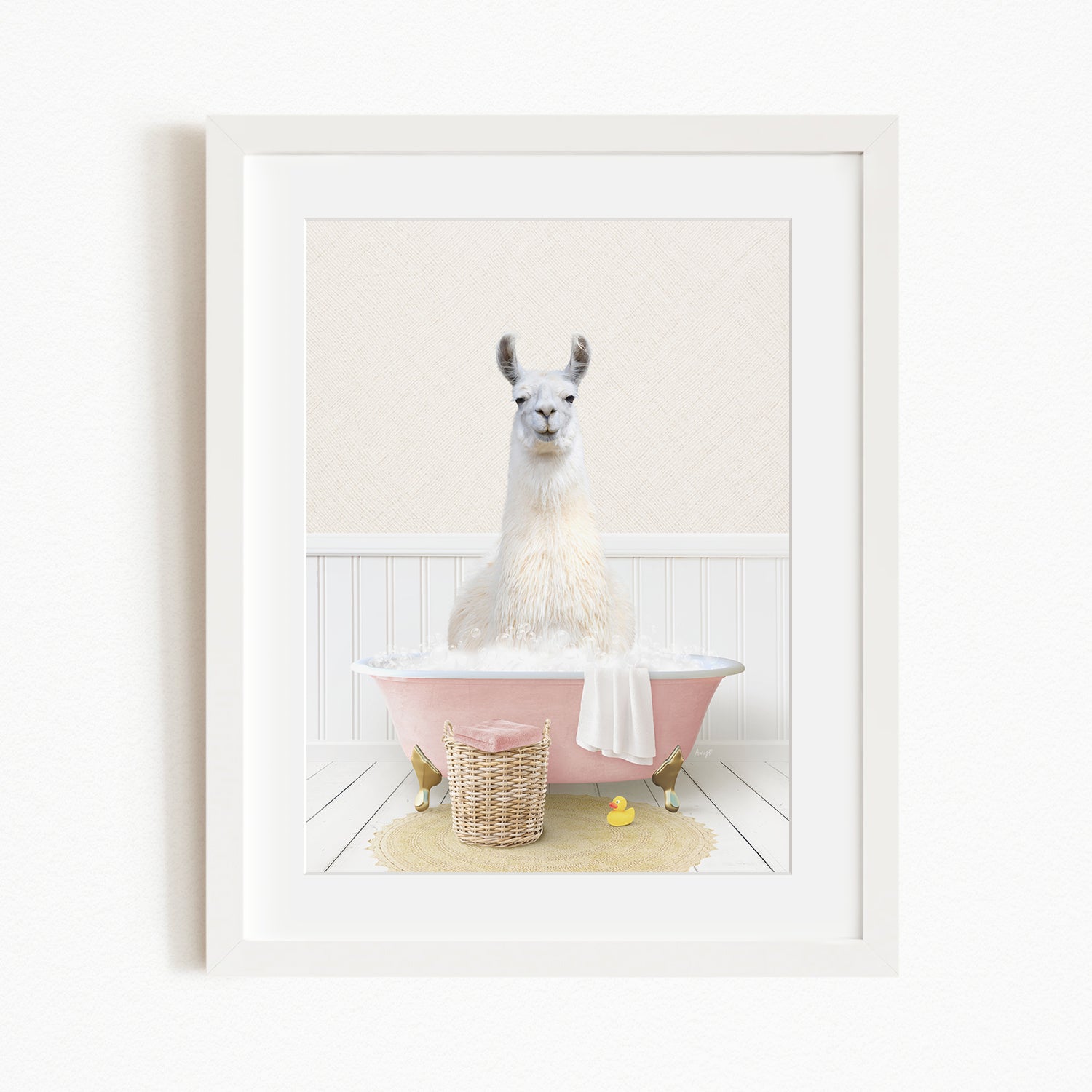 A white llama sitting in a pink bathtub filled with bubbles, surrounded by a yellow rubber duck and a wicker basket.