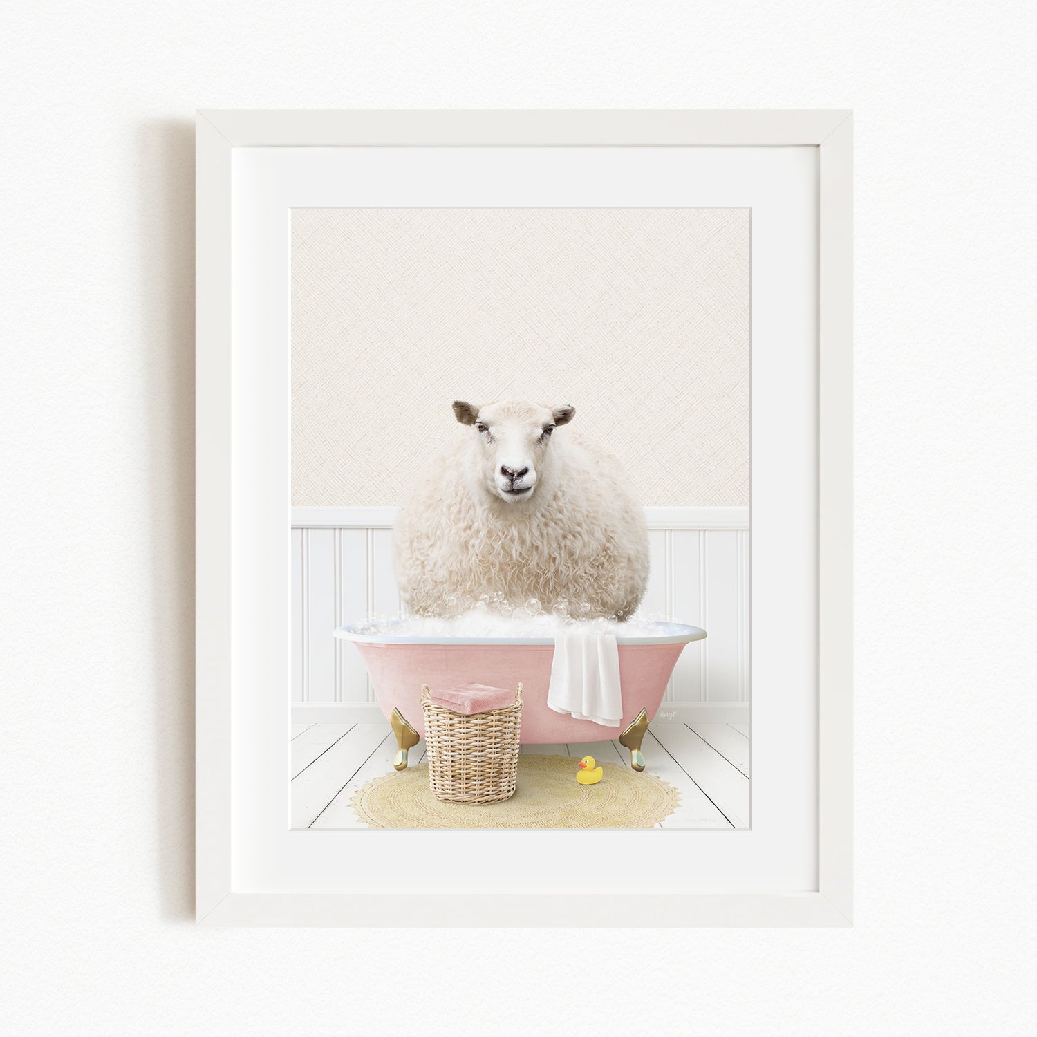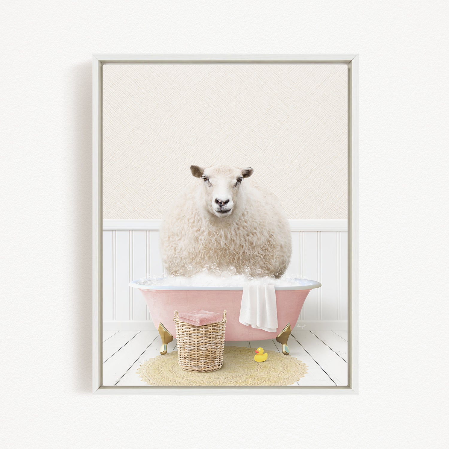 A fluffy white sheep sits in a pink bathtub, surrounded by a yellow rubber duck and a wicker basket.