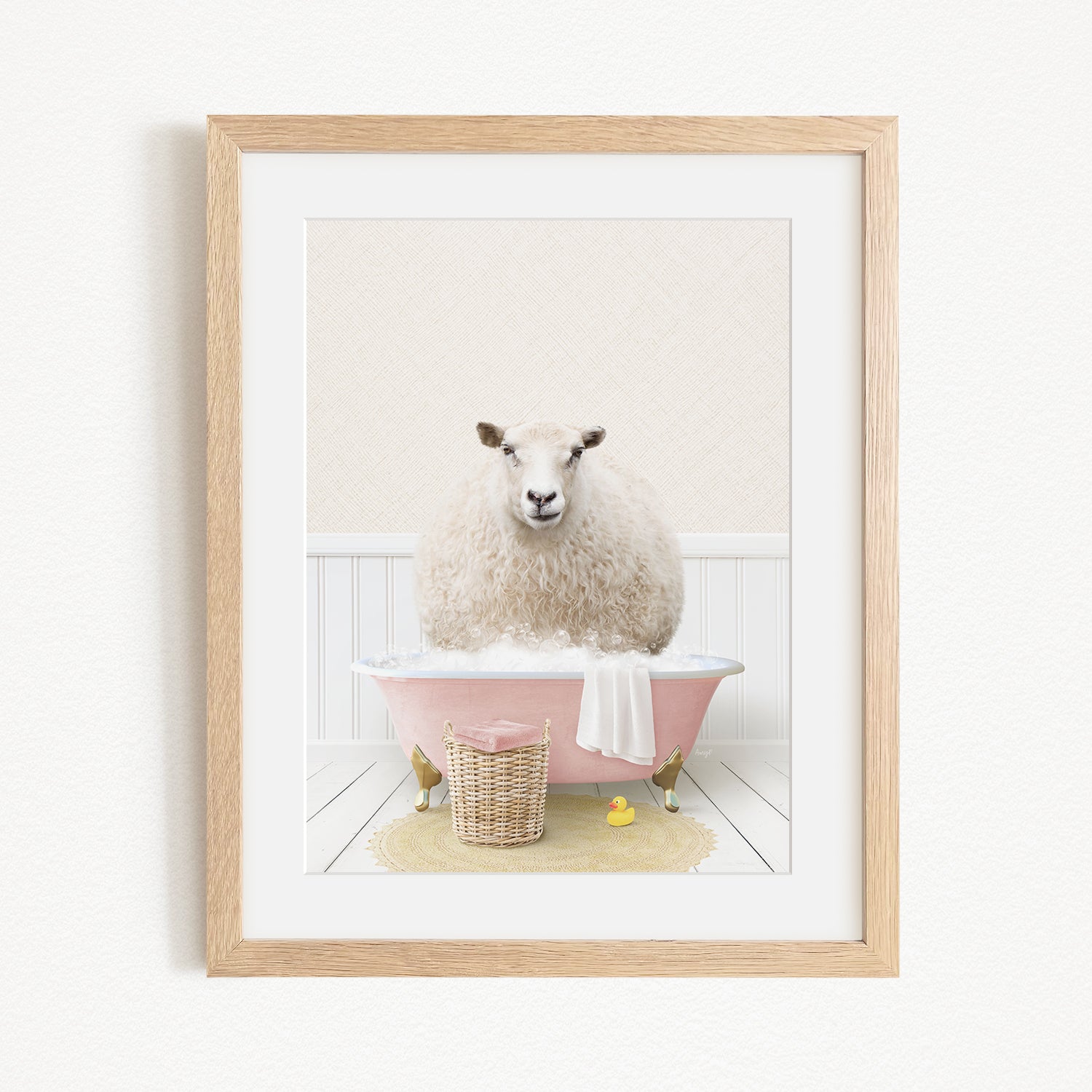 A fluffy white sheep sits in a pink bathtub filled with bubbles, surrounded by a yellow rubber duck and a wicker basket.
