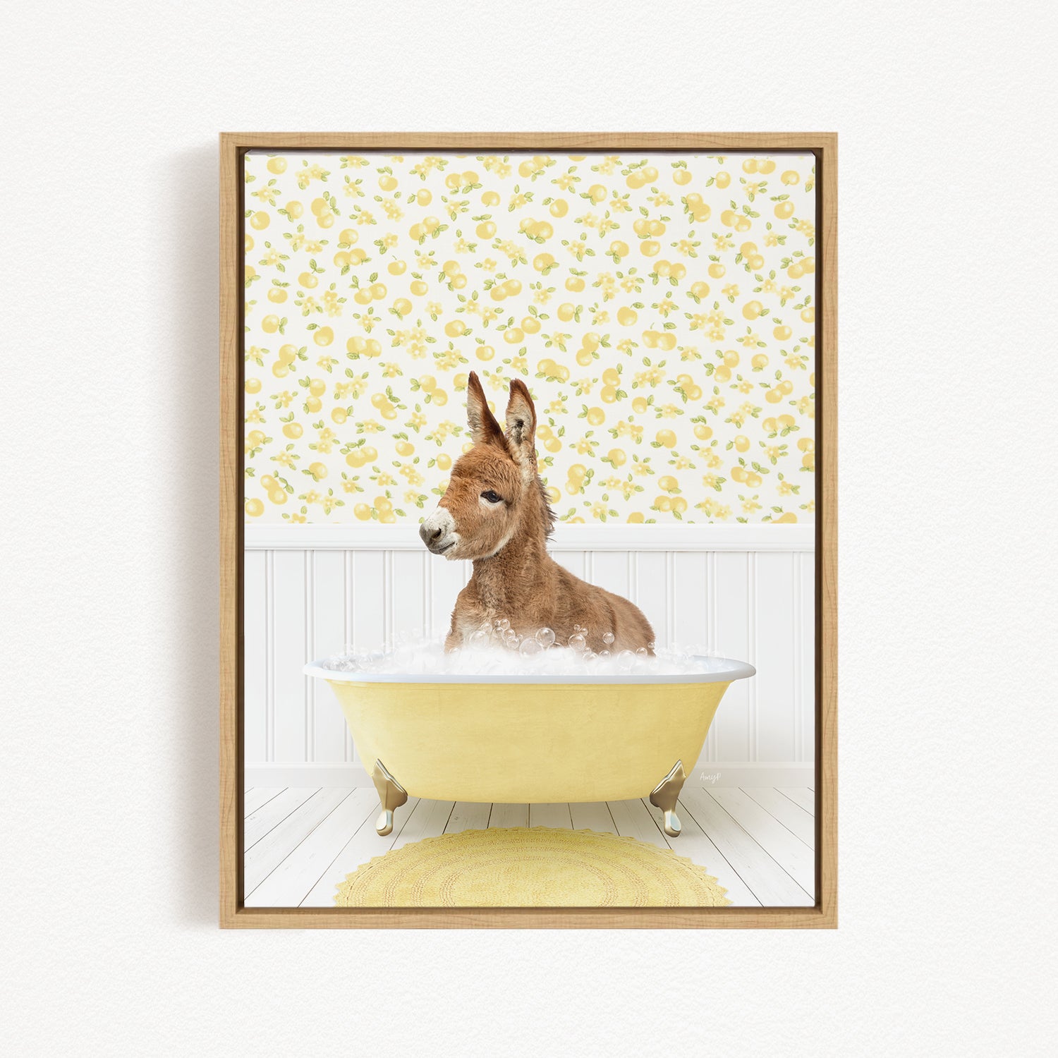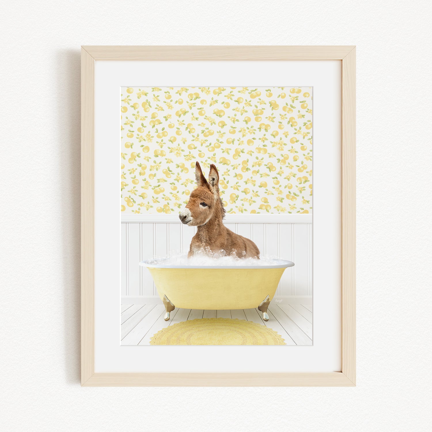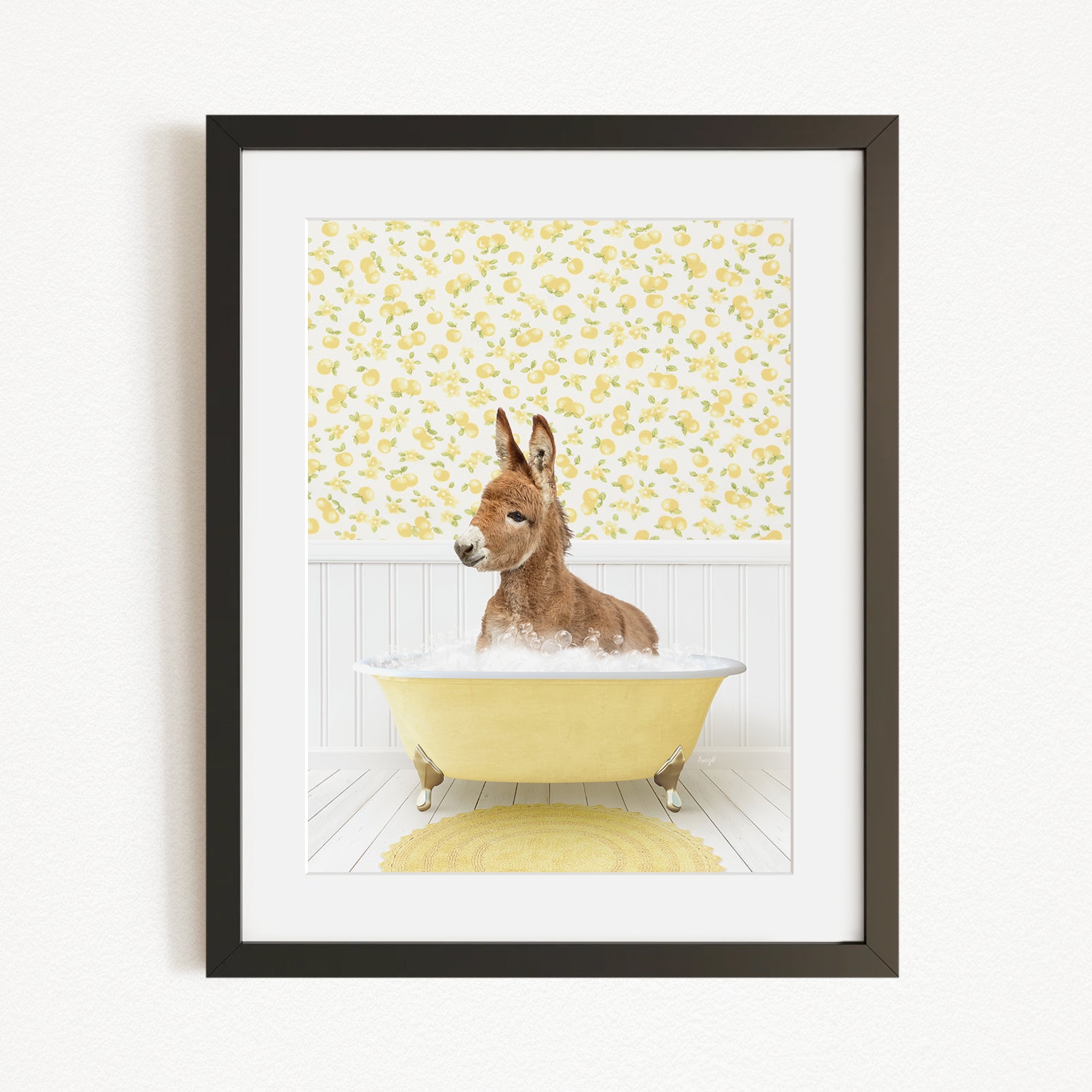 A donkey is sitting in a yellow bathtub filled with bubbles, surrounded by a yellow floral wallpaper.