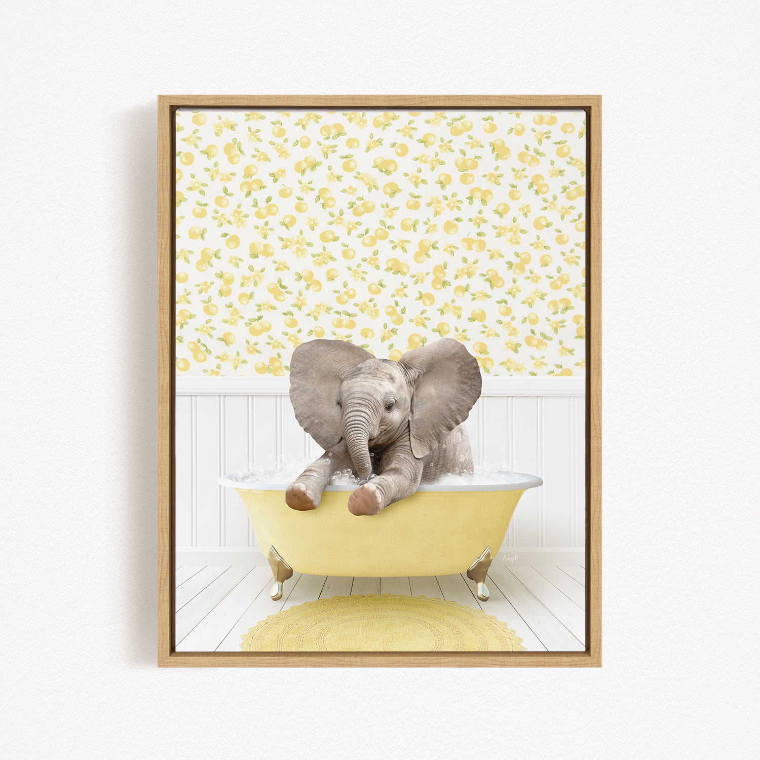 A baby elephant sitting in a yellow bathtub, surrounded by a yellow floral pattern on the wall behind it.