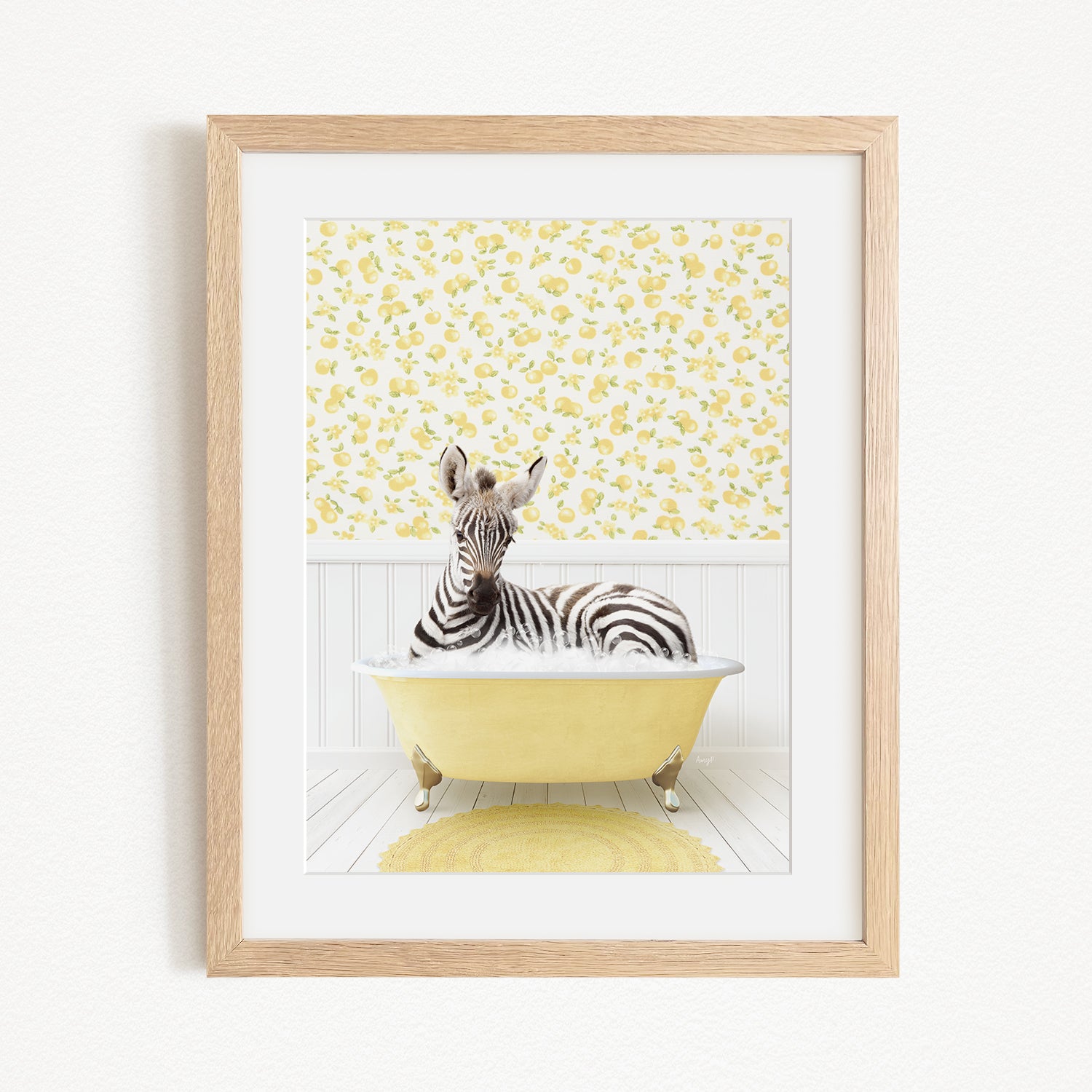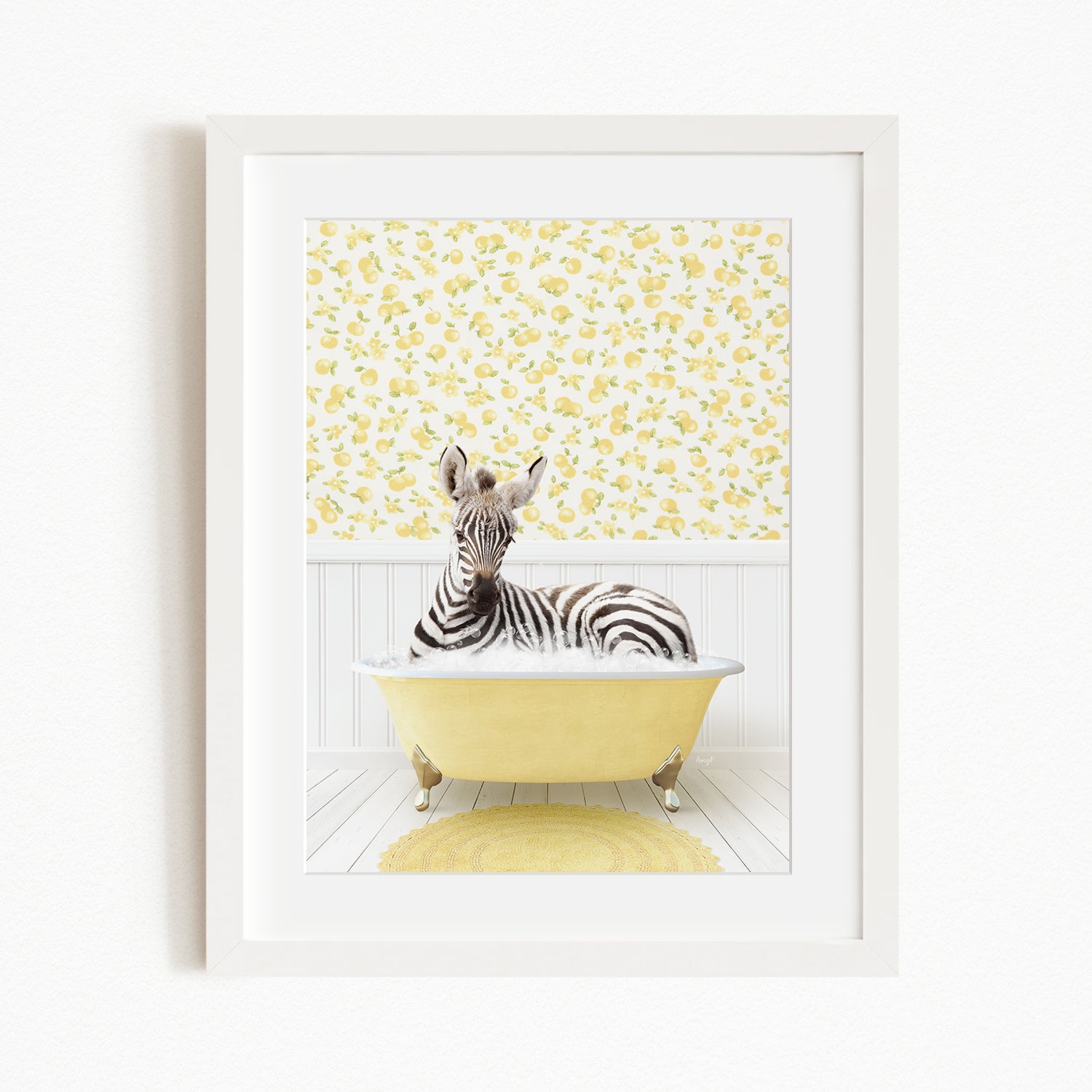 A zebra is sitting in a yellow bathtub, surrounded by a yellow and white floral pattern on the wall behind it.