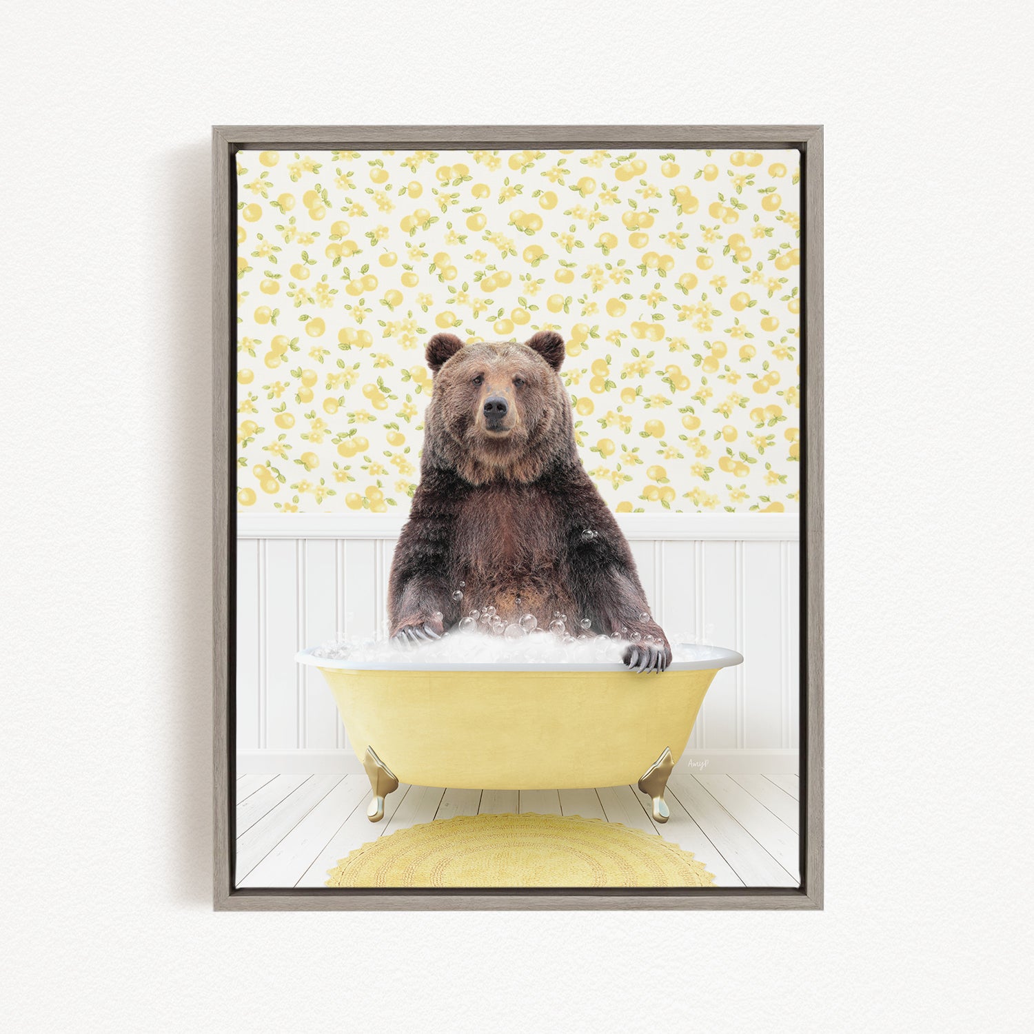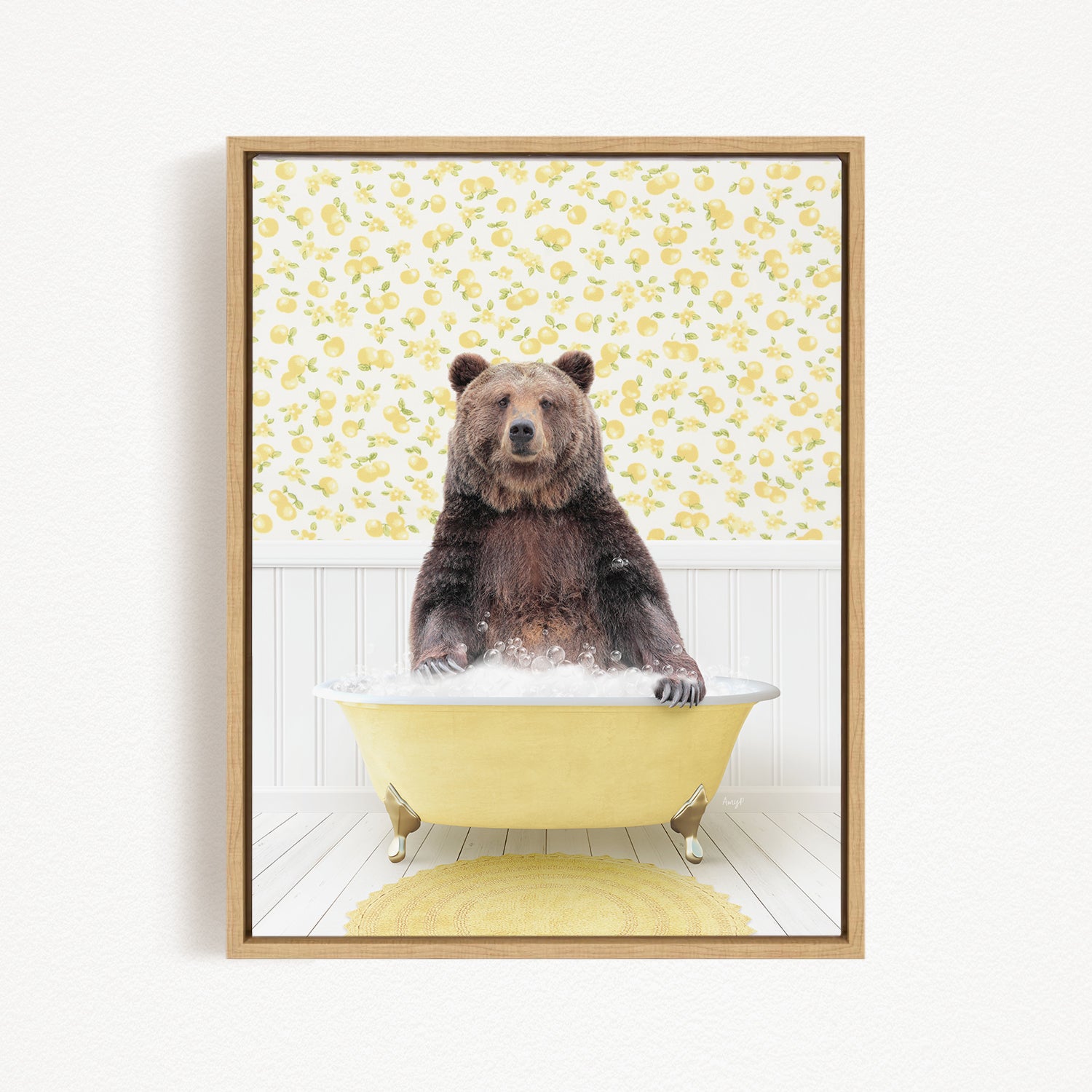 A brown bear sitting in a yellow bathtub, surrounded by a yellow floral pattern on the wall behind it.