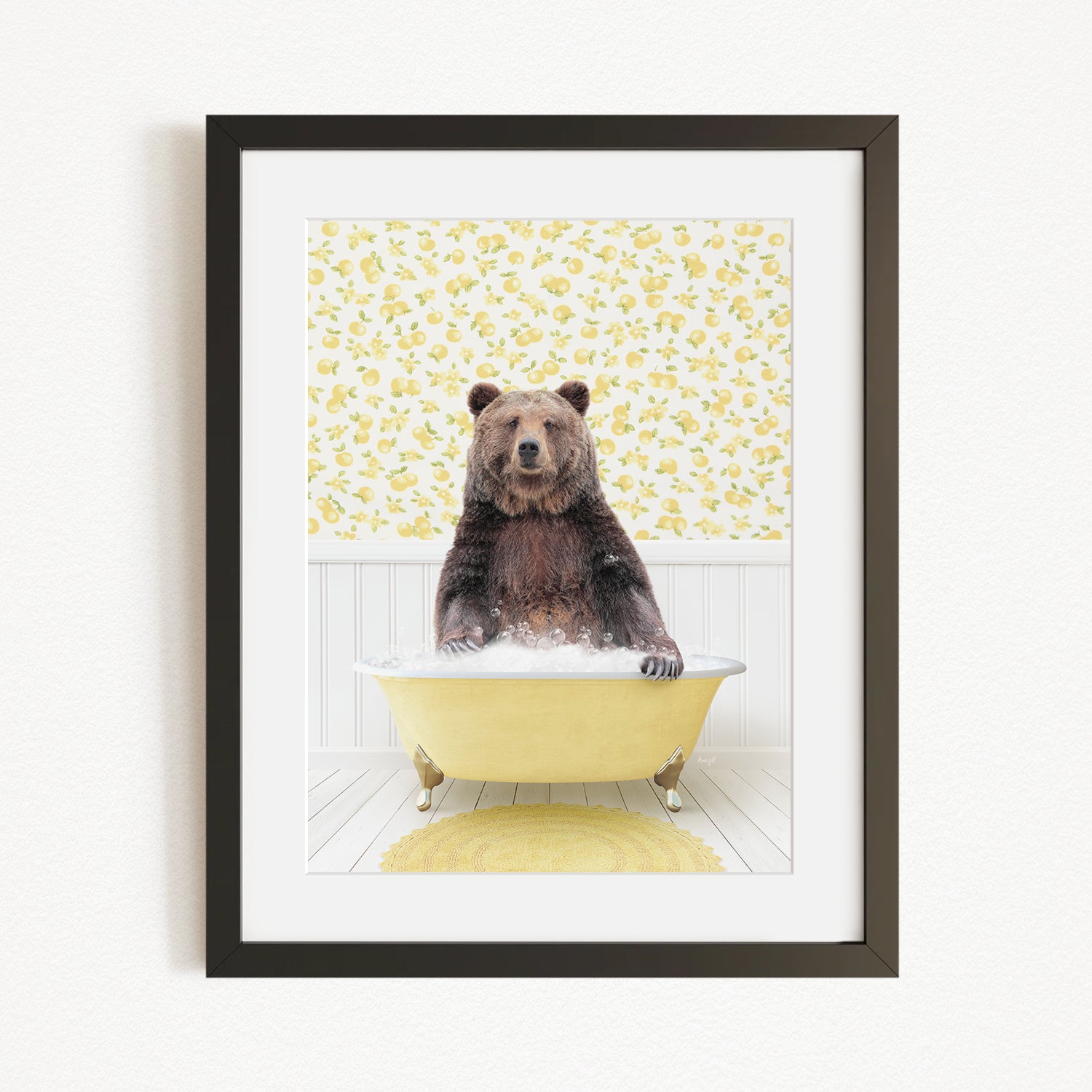 A brown bear sitting in a yellow bathtub filled with water, surrounded by a yellow floral pattern on the wall behind it.