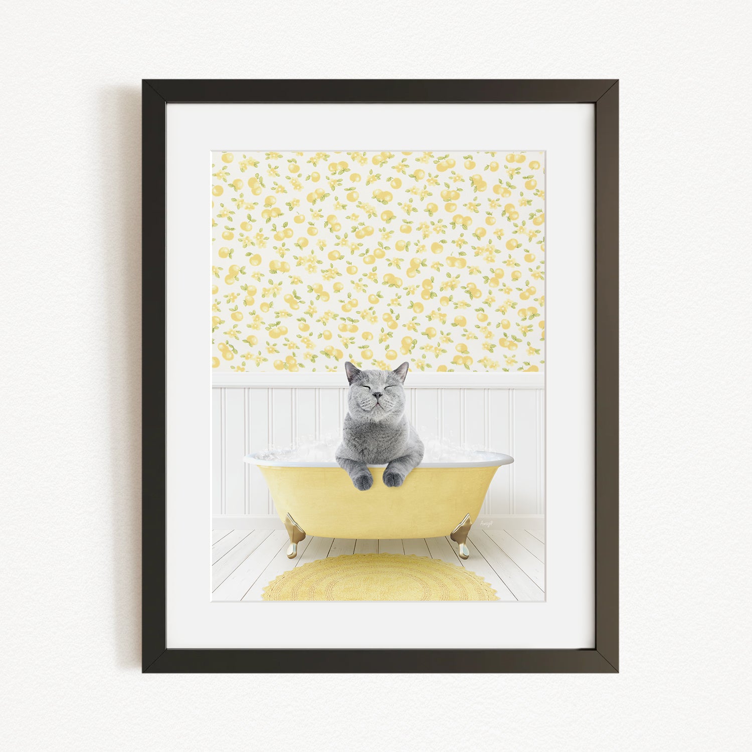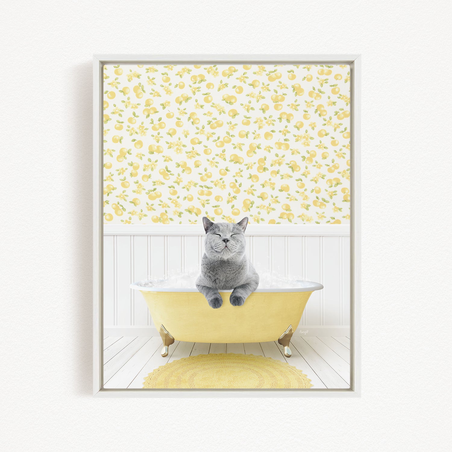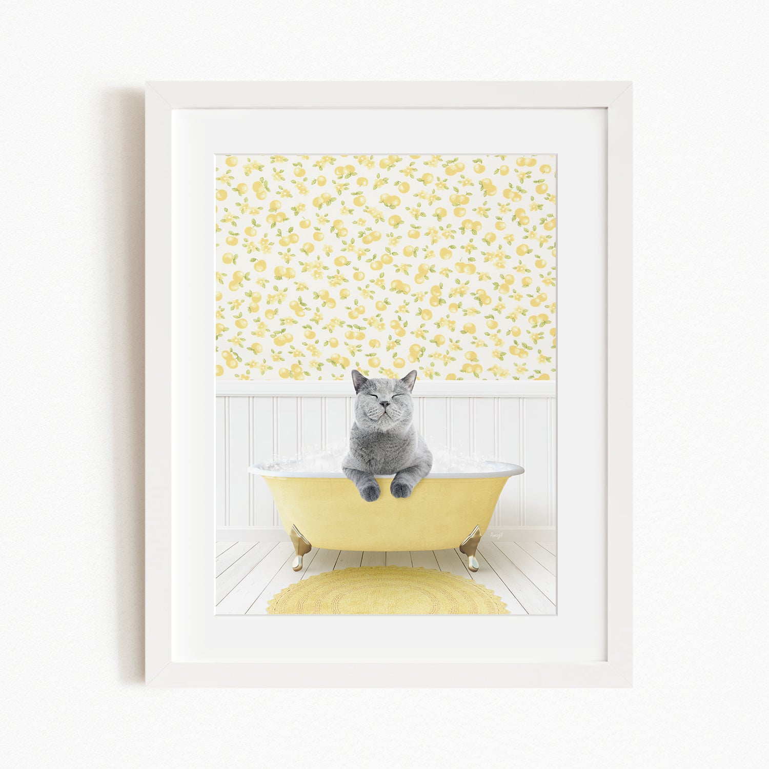 A gray cat sitting in a yellow bathtub, surrounded by a yellow and white floral pattern on the walls.