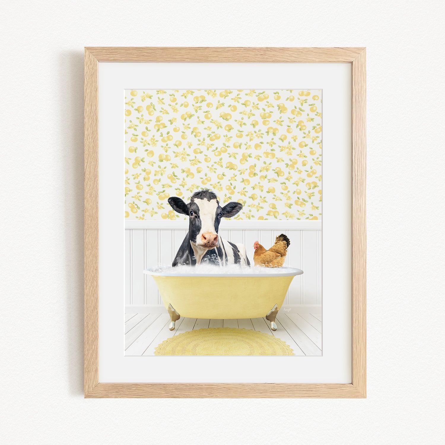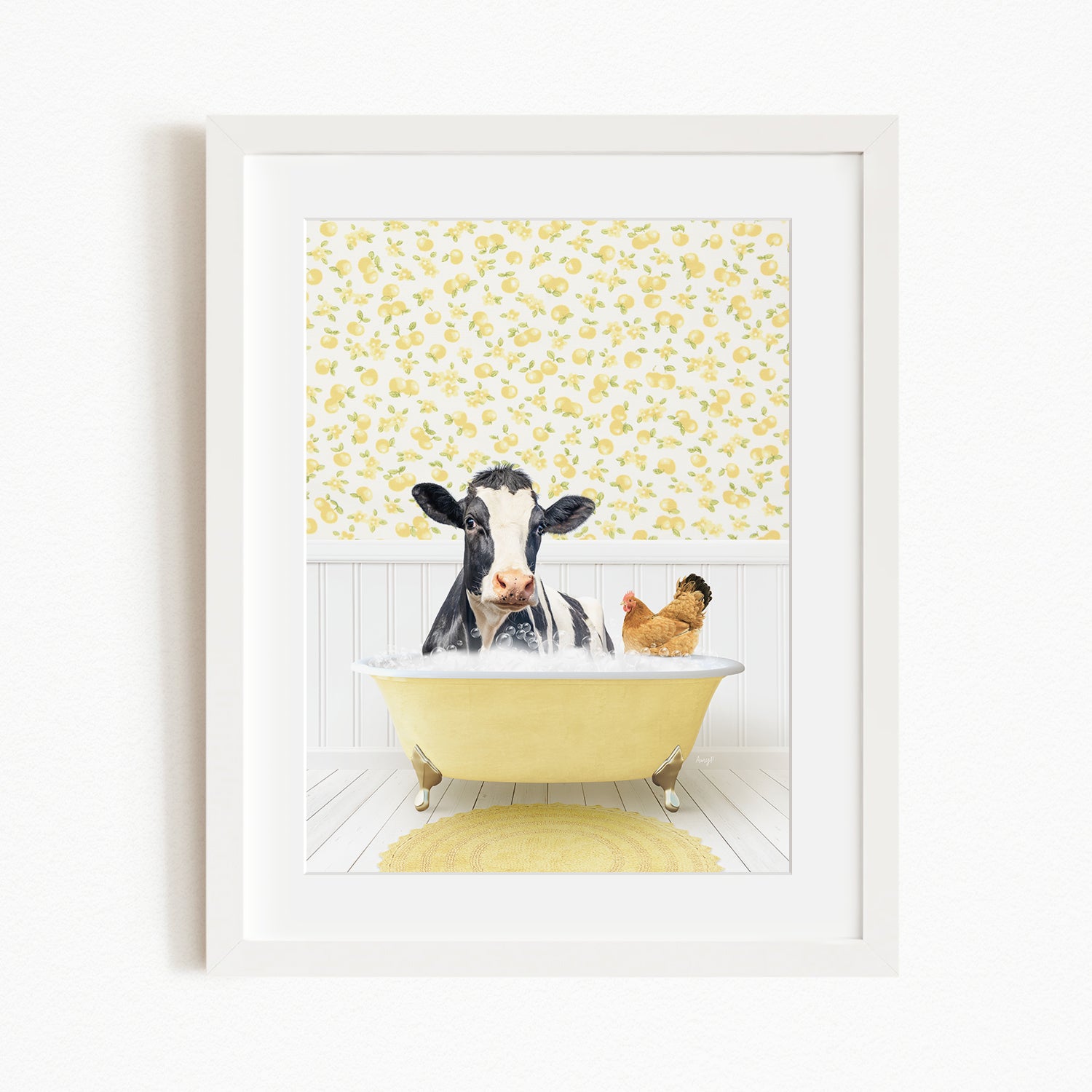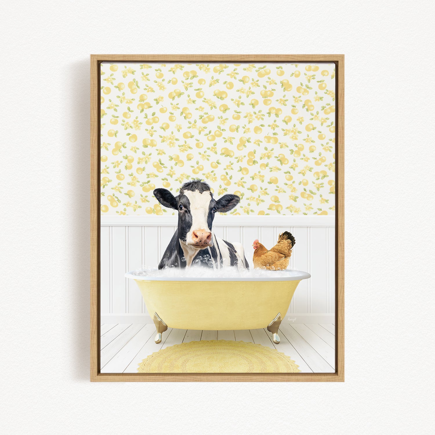 A framed image depicting a cow sitting in a yellow bathtub, with a chicken nearby, against a yellow and white floral background.