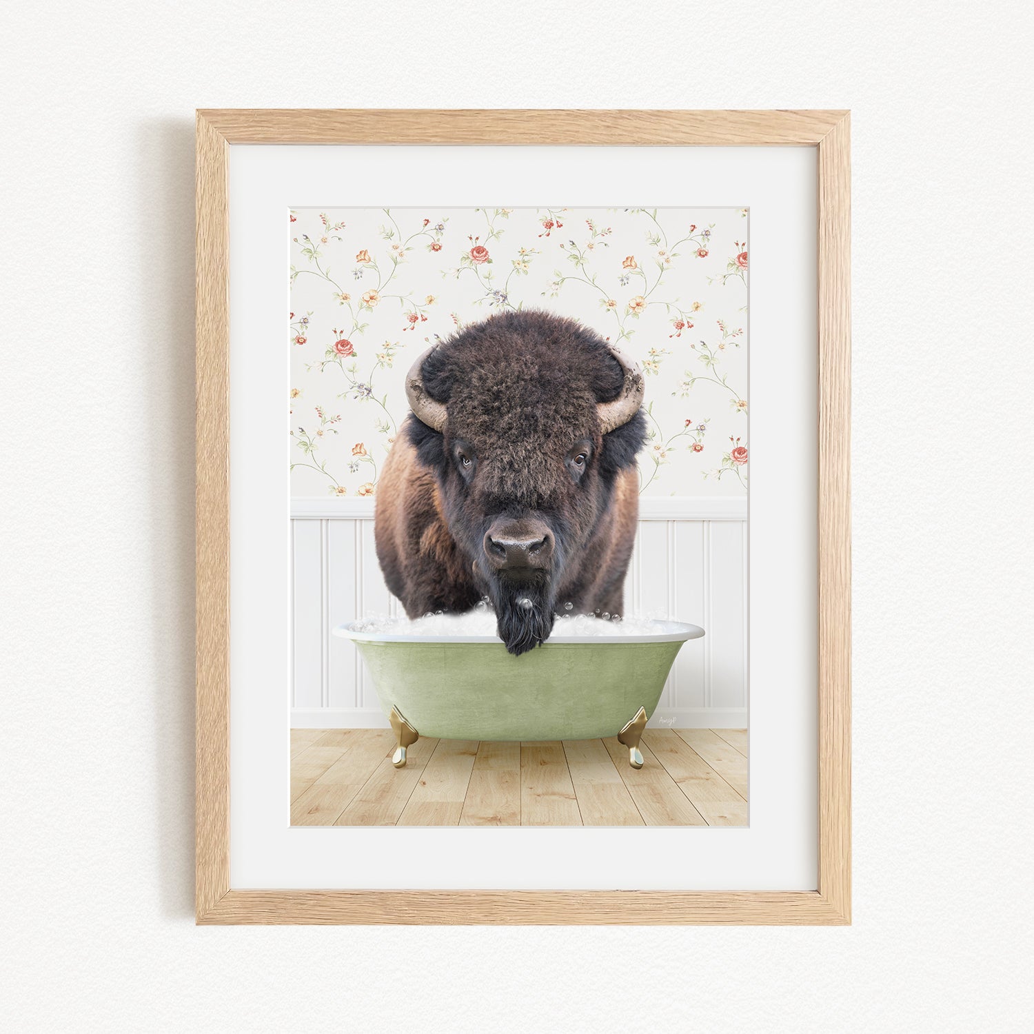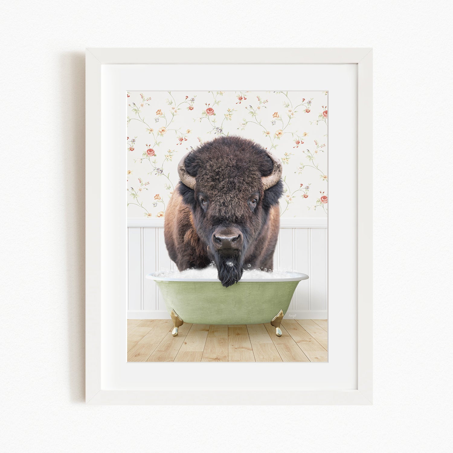 A bison with a long beard is sitting in a green bathtub, with a floral wallpaper in the background.