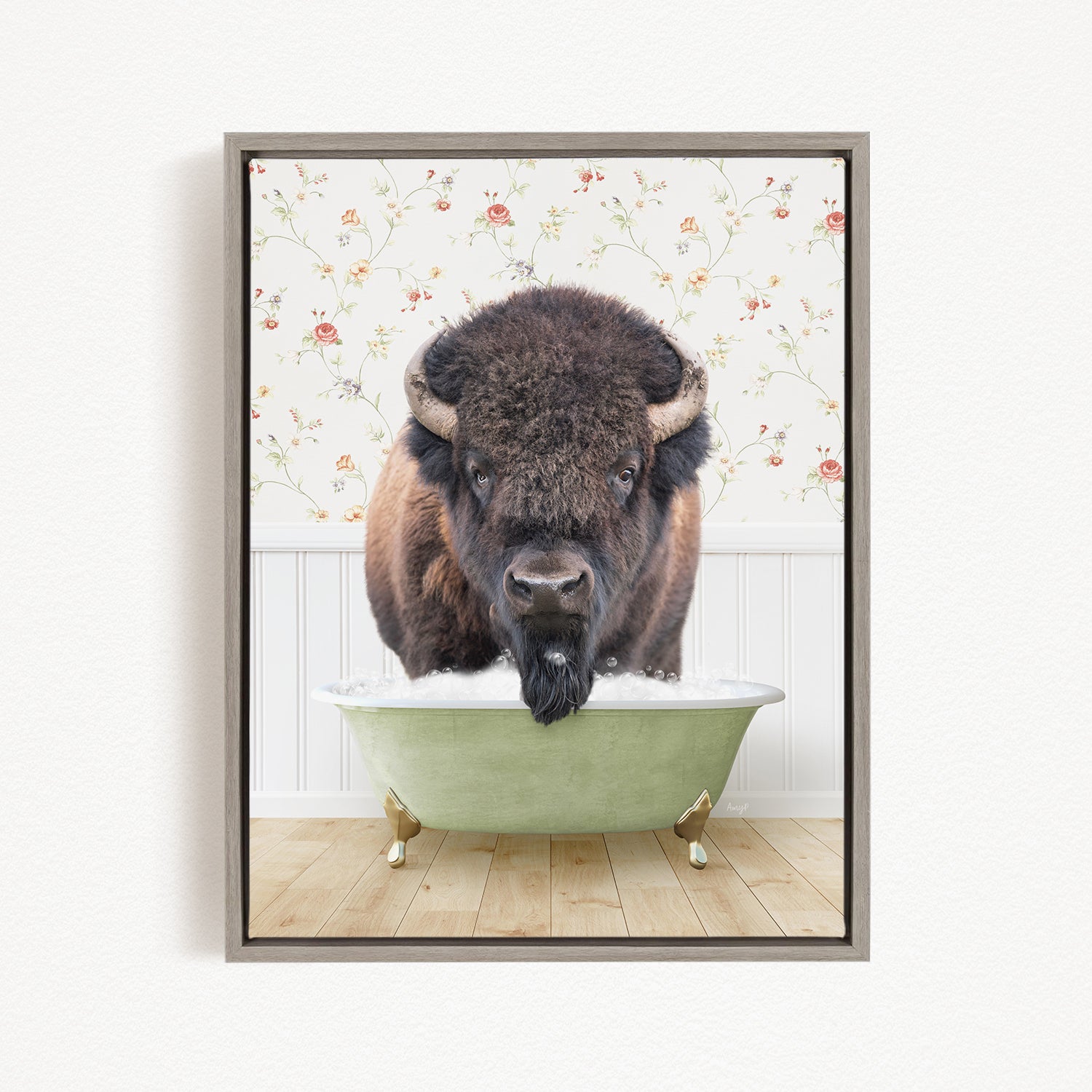 A buffalo with a long beard is standing in a green bathtub, with a floral wallpaper in the background.