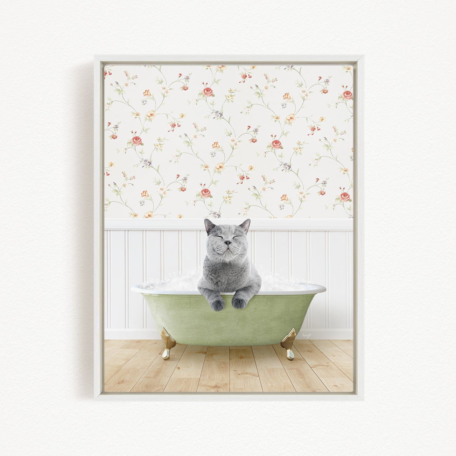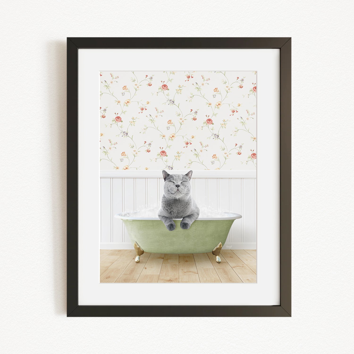 A gray cat sitting on a green bathtub, with a floral wallpaper in the background.