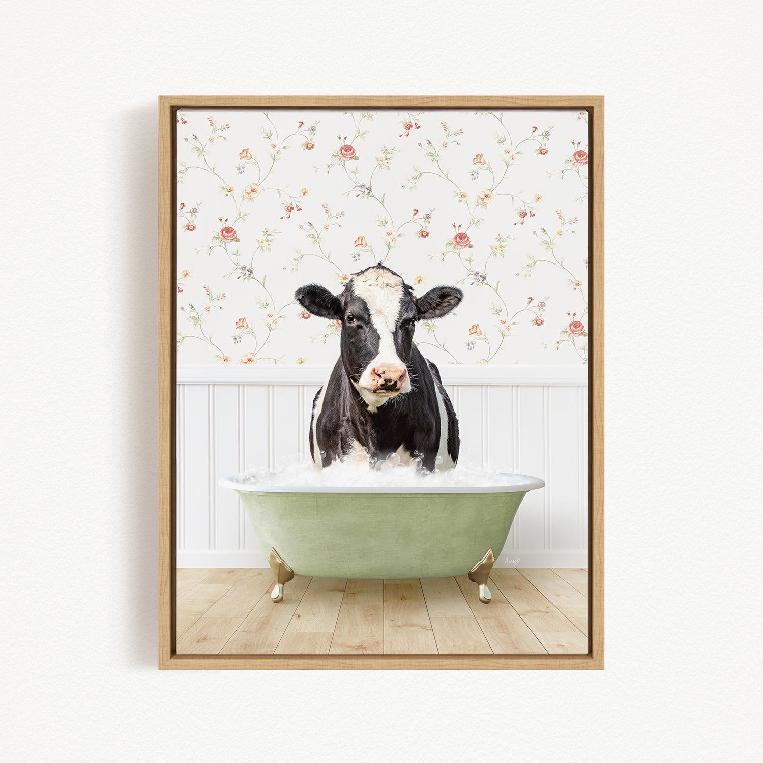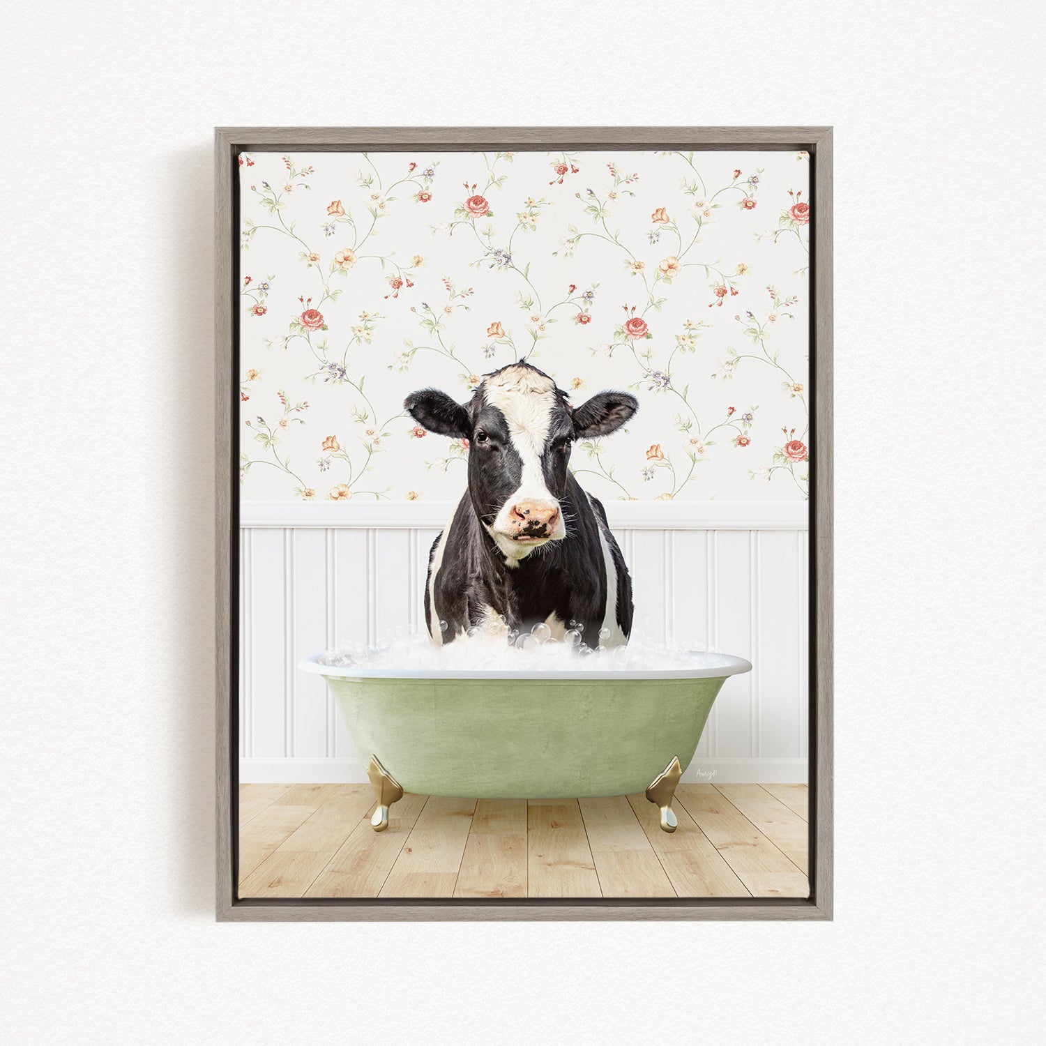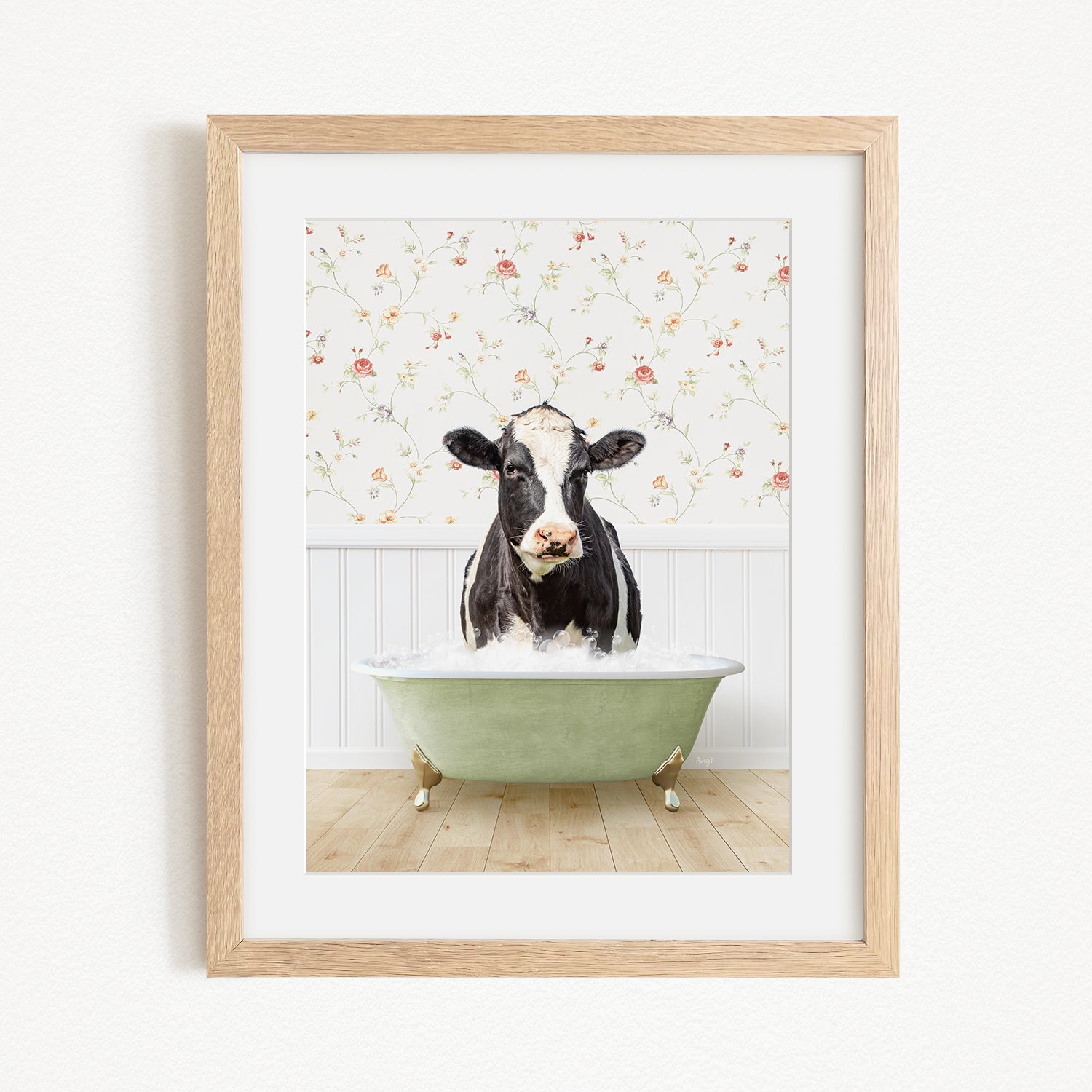 A black and white cow is sitting in a green bathtub filled with bubbles, with a floral wallpaper in the background.