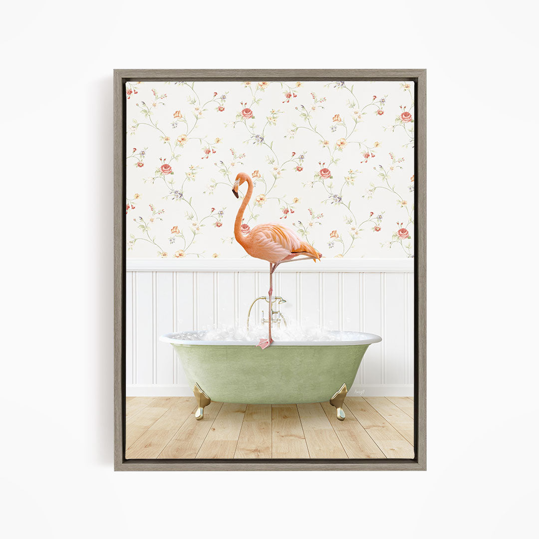 A pink flamingo stands on the edge of a green bathtub, with a floral wallpaper in the background.