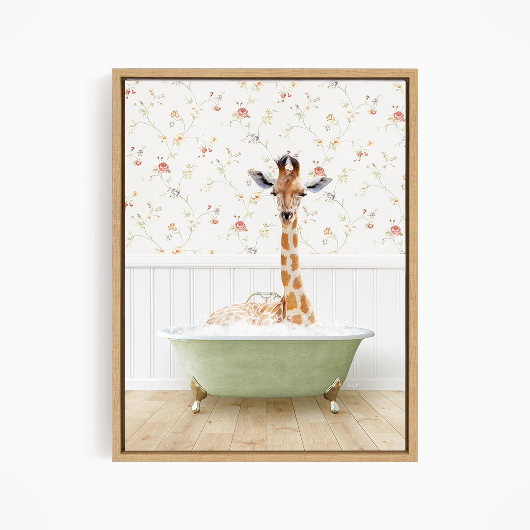 A giraffe is sitting in a green bathtub filled with bubbles, surrounded by a floral wallpaper.