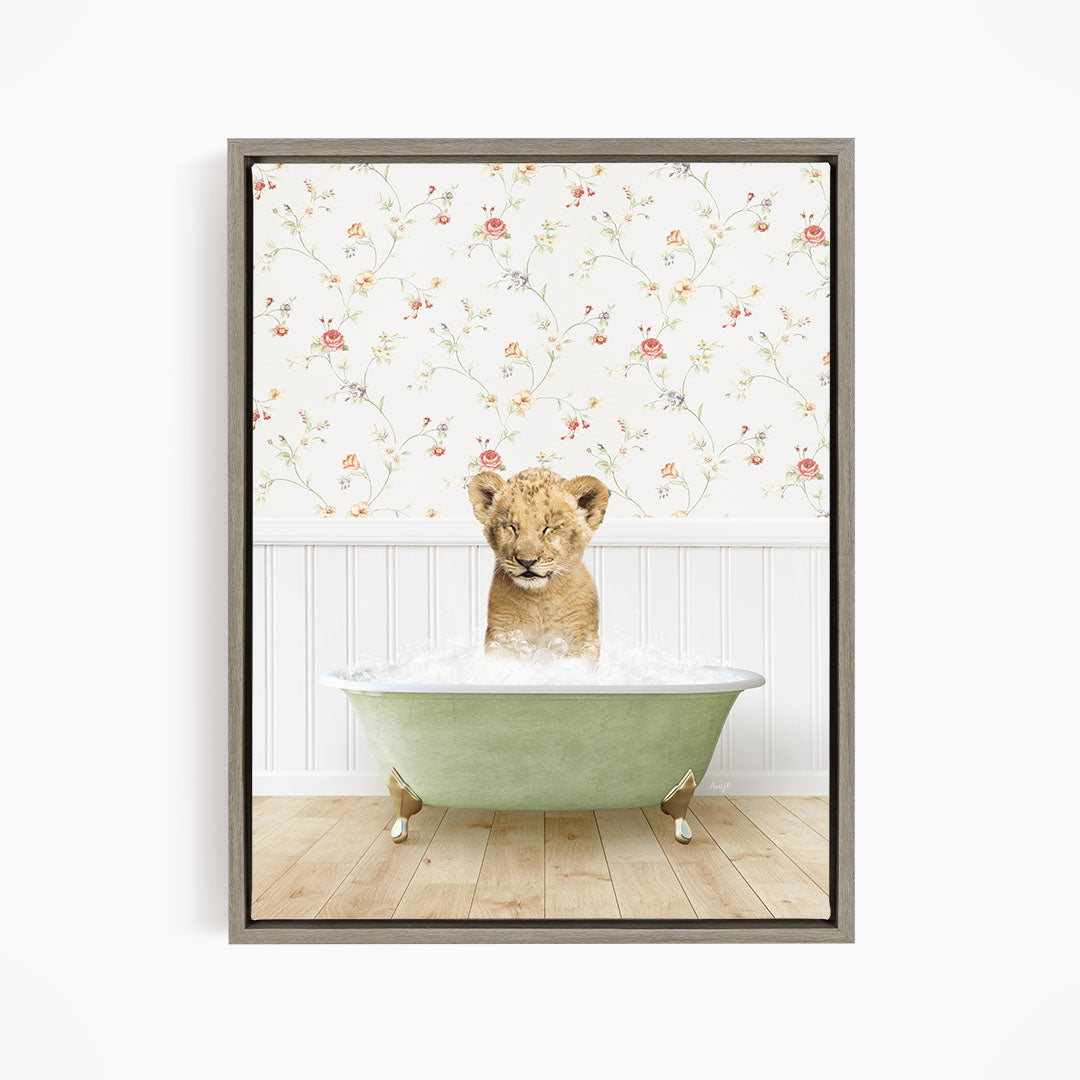 A young lion cub sitting in a green bathtub filled with water, surrounded by a floral wallpaper.