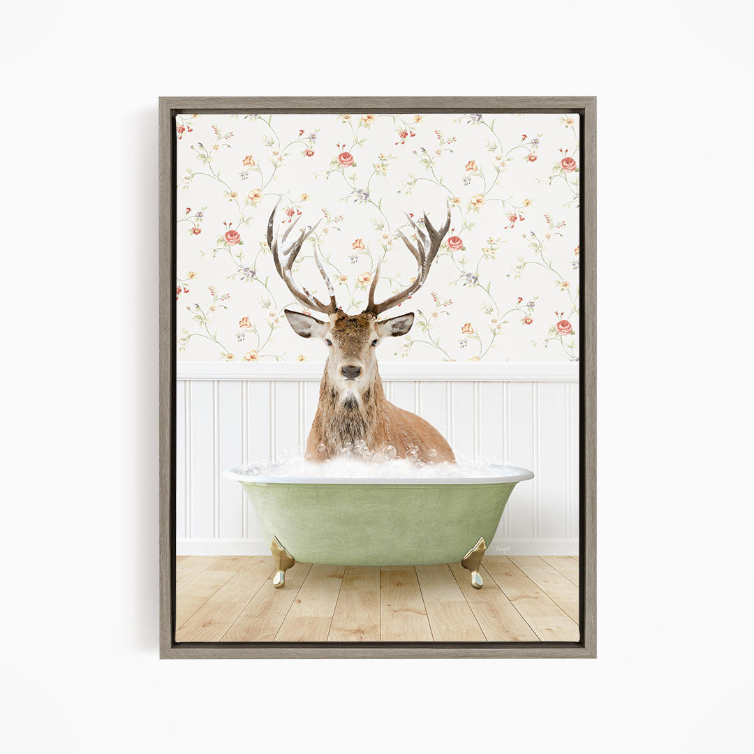 A deer with antlers is sitting in a green bathtub filled with bubbles, against a floral wallpaper backdrop.