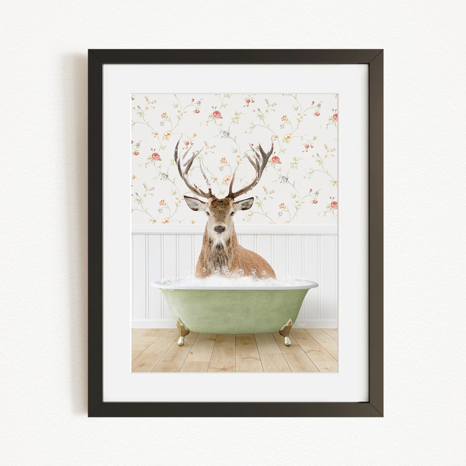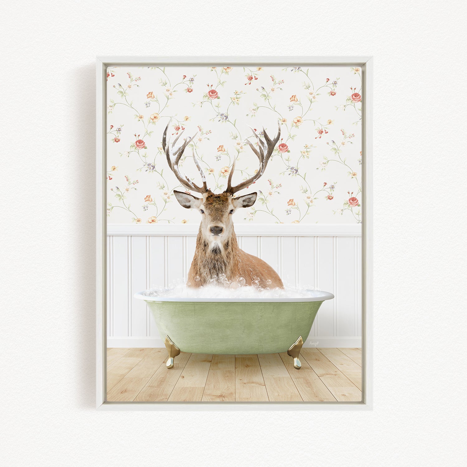 A deer with antlers is sitting in a green bathtub, surrounded by a floral wallpaper.