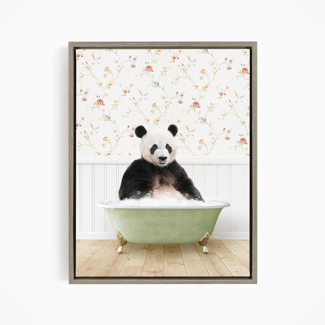 A panda bear sitting in a green bathtub filled with bubbles, surrounded by a floral wallpaper.
