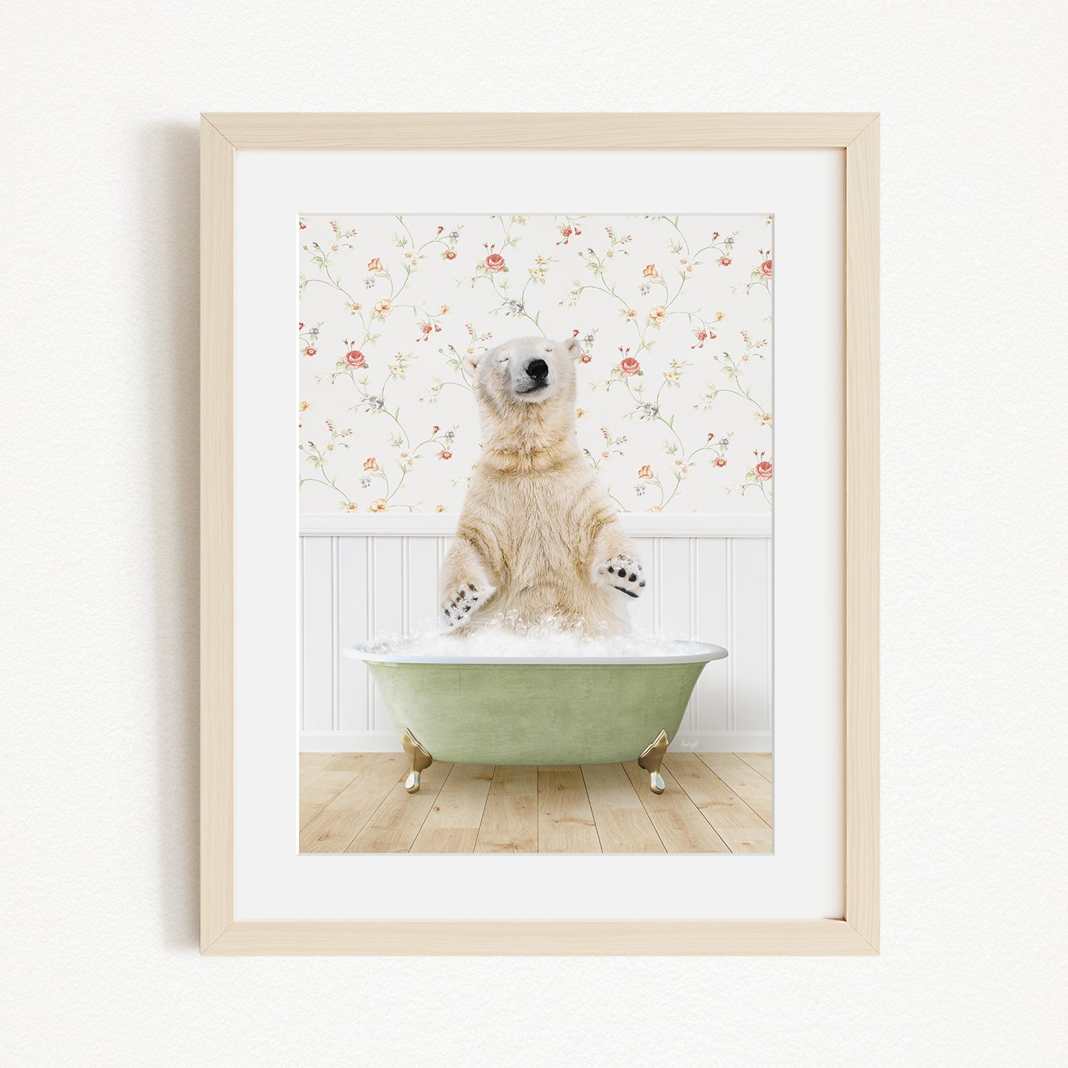 A polar bear sitting in a green bathtub filled with water, surrounded by a floral patterned wall.