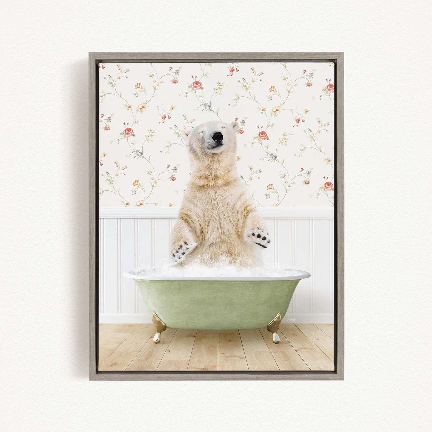 A polar bear standing in a green bathtub filled with water, with a floral wallpaper in the background.