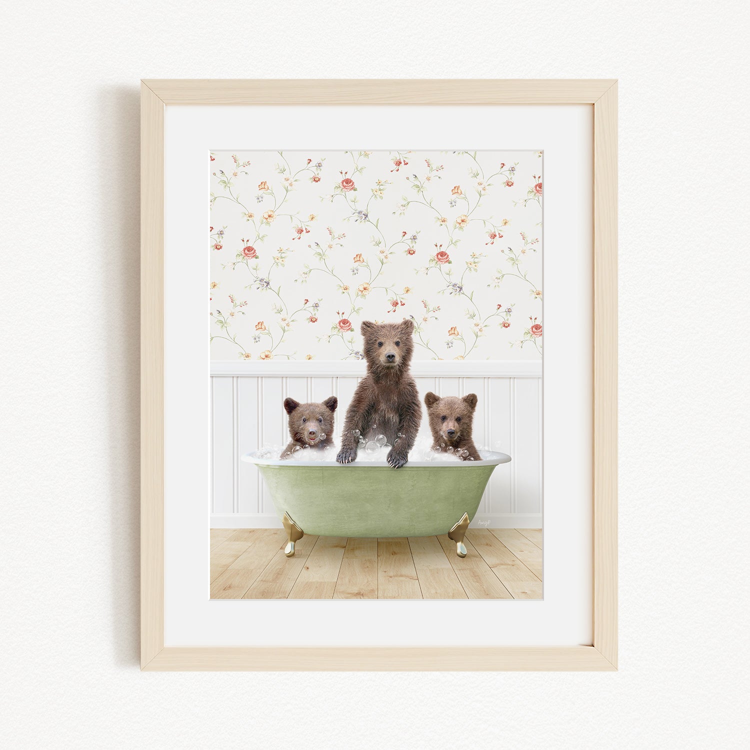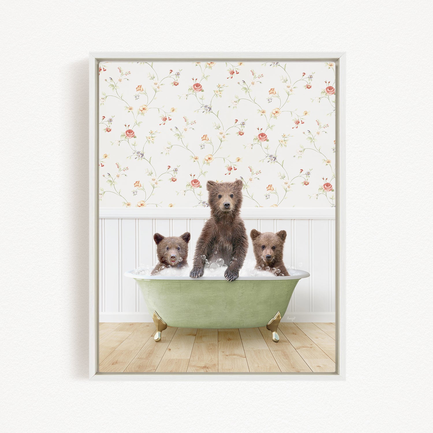 A framed image depicting three bears sitting in a green bathtub, with a floral wallpaper in the background.