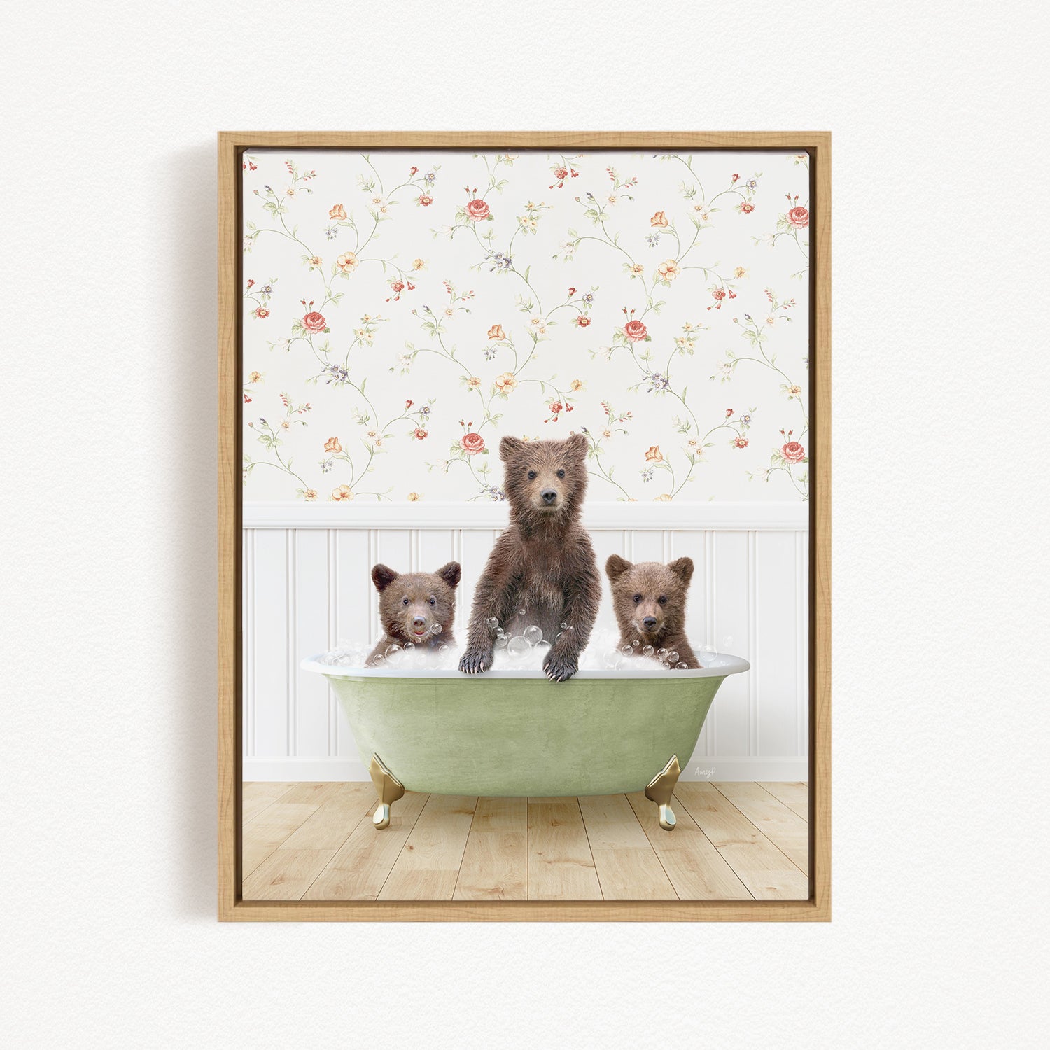 A framed image depicting three brown bears sitting in a green bathtub, with a floral wallpaper in the background.