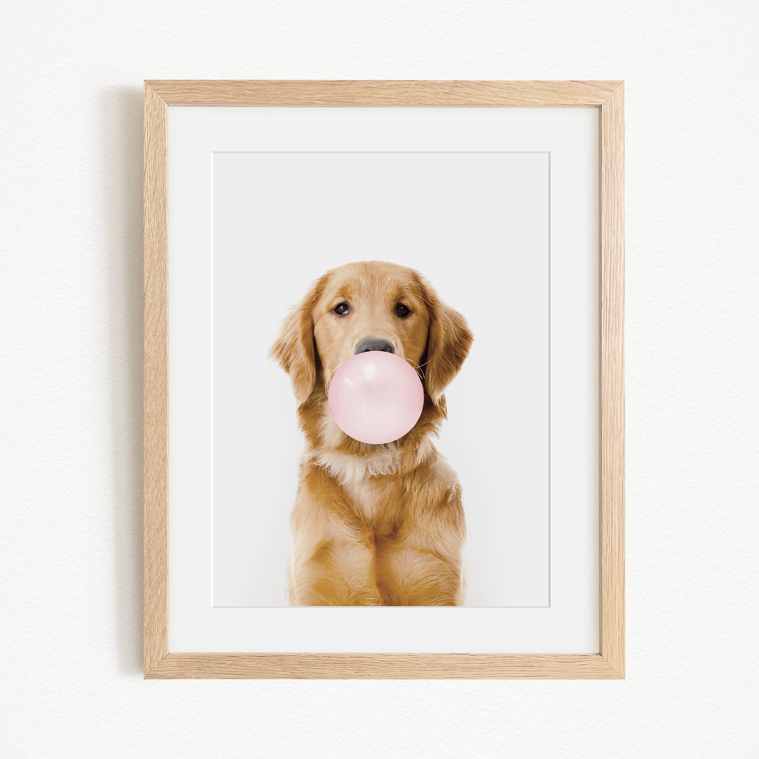 A golden retriever dog is sitting on a white wall, holding a pink bubble gum bubble in its mouth.