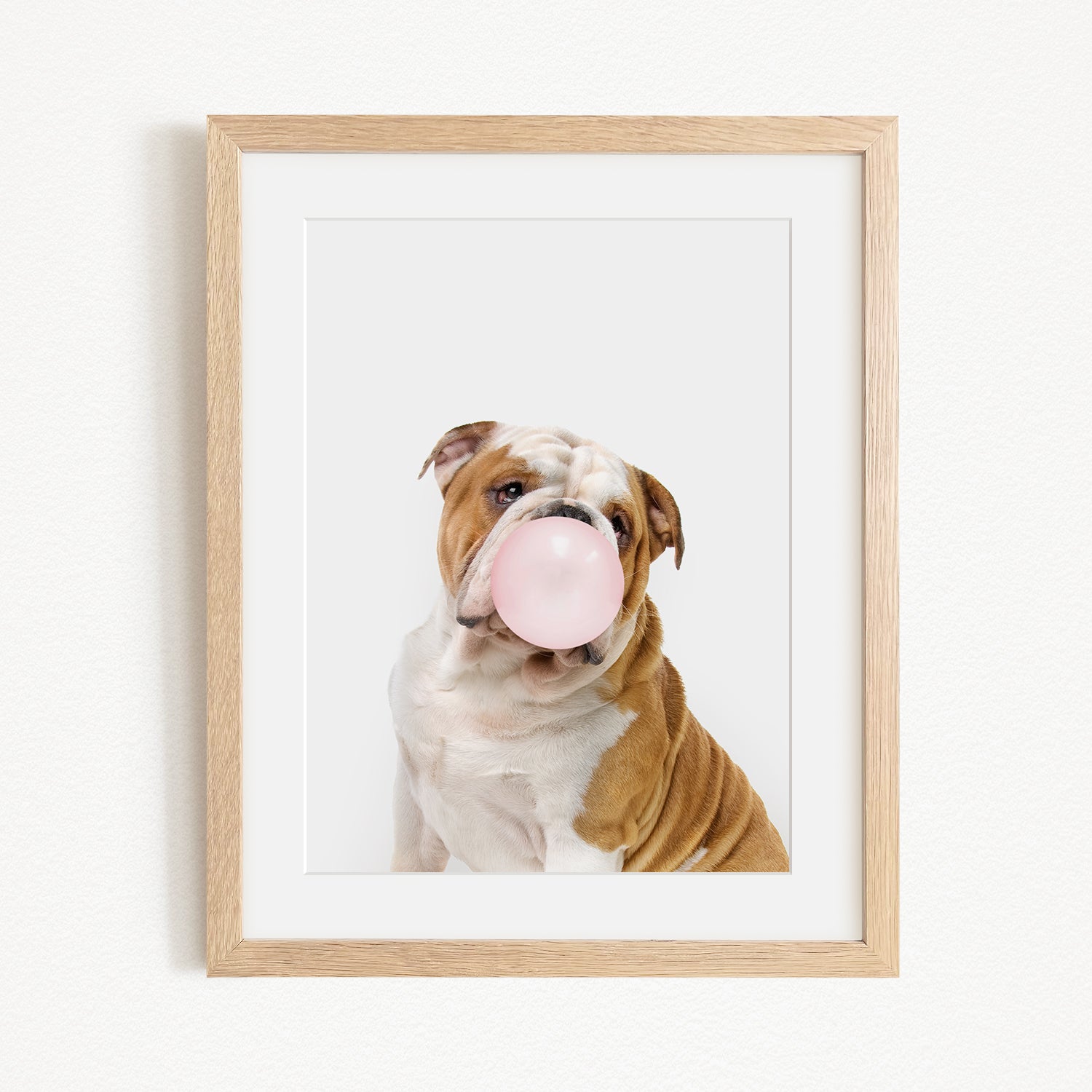 A brown and white bulldog is blowing a bubble with a pink bubble gum bubble.
