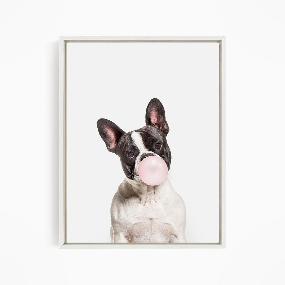 A black and white dog with a pink bubble gum bubble in its mouth, looking directly at the camera.