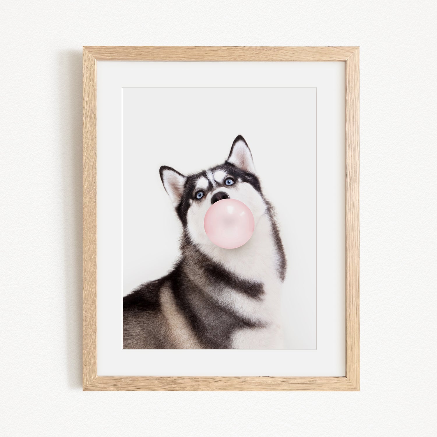 A black and white husky dog with blue eyes is blowing a bubble with a pink bubble gum bubble.