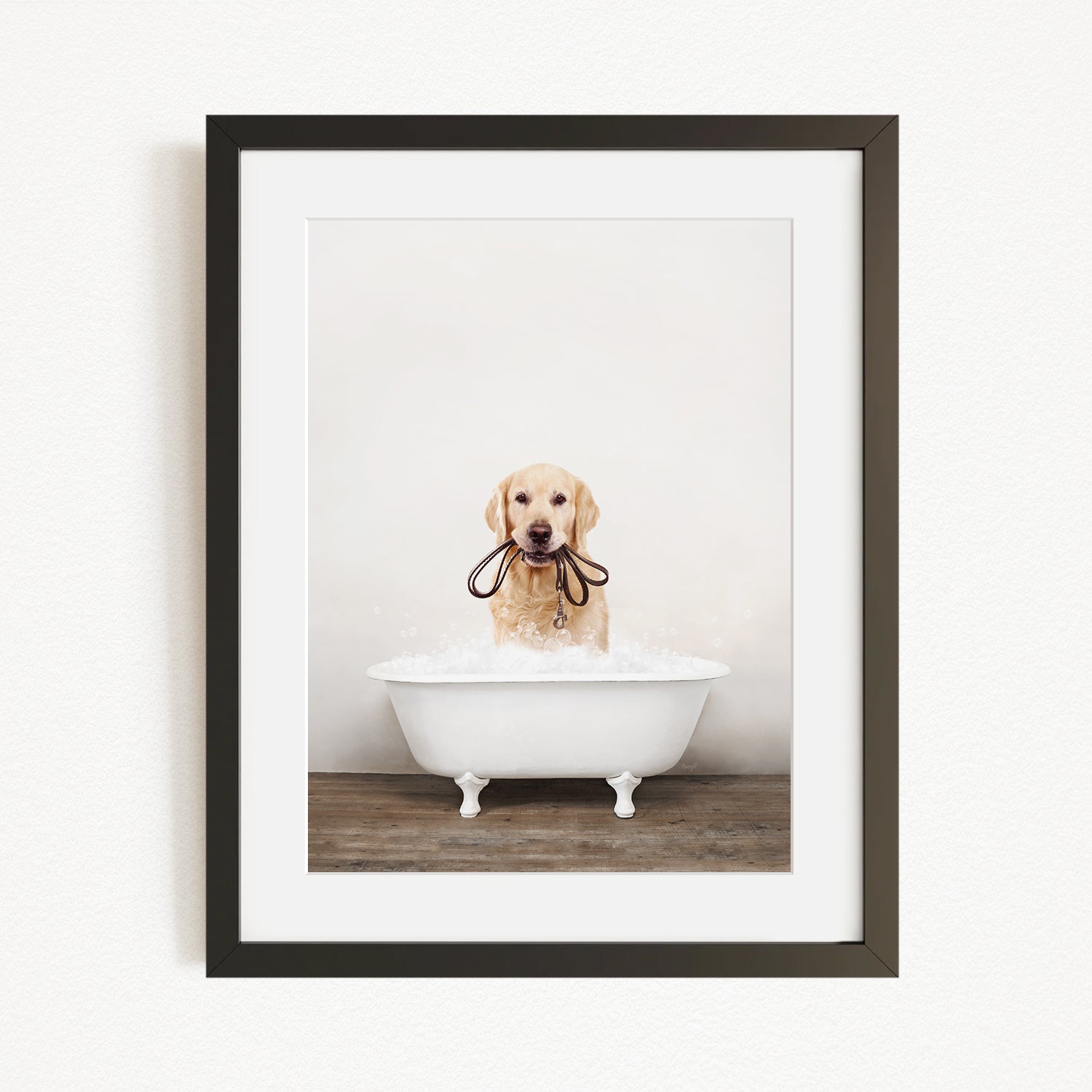 A golden retriever dog is sitting in a white bathtub, holding a leash in its mouth.
