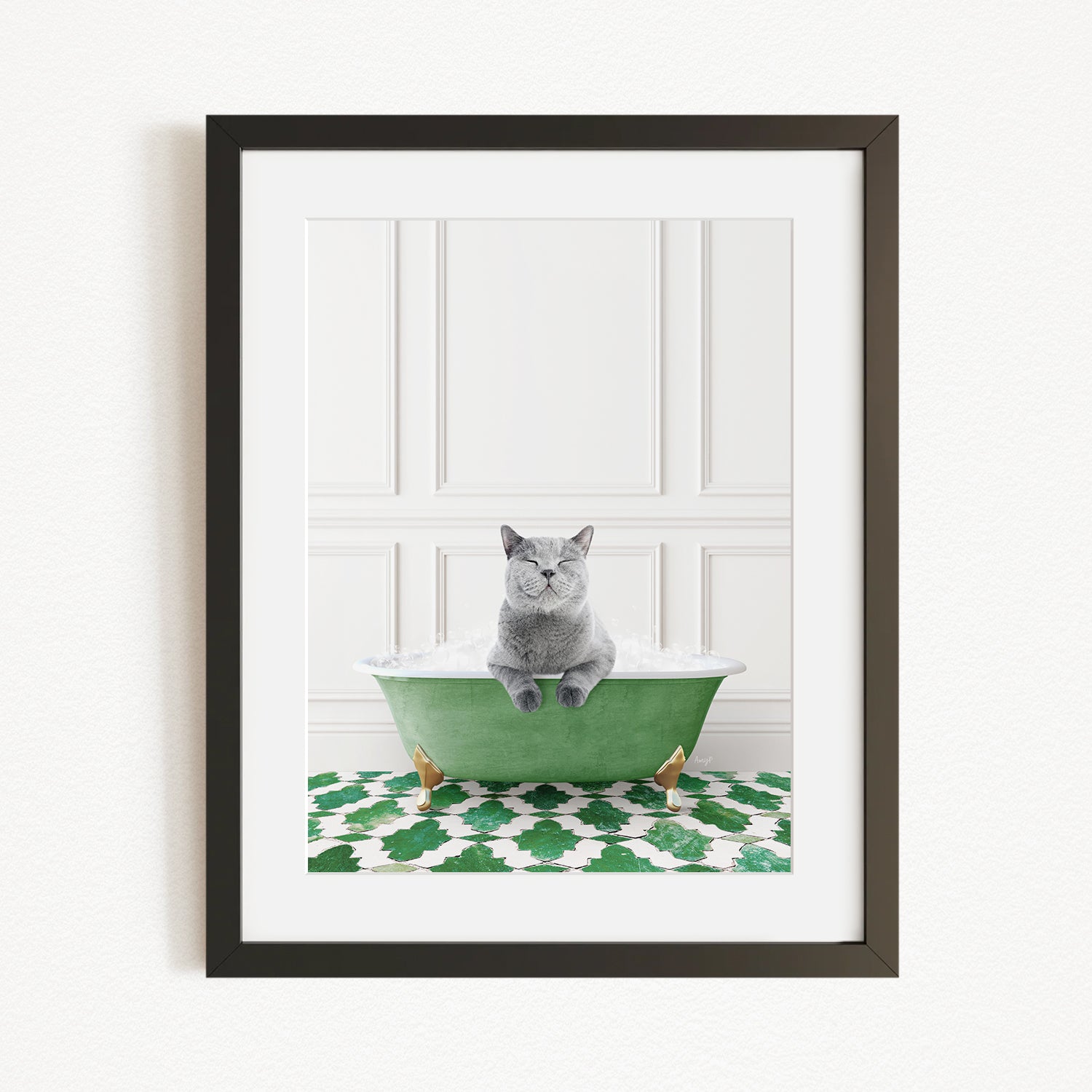 Cat in Eclectic Green Panel Wall Bath