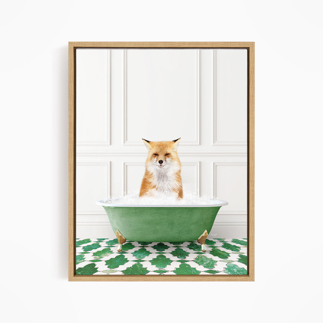A red fox sitting in a green bathtub filled with water, with a white wall and green and white patterned floor in the background.