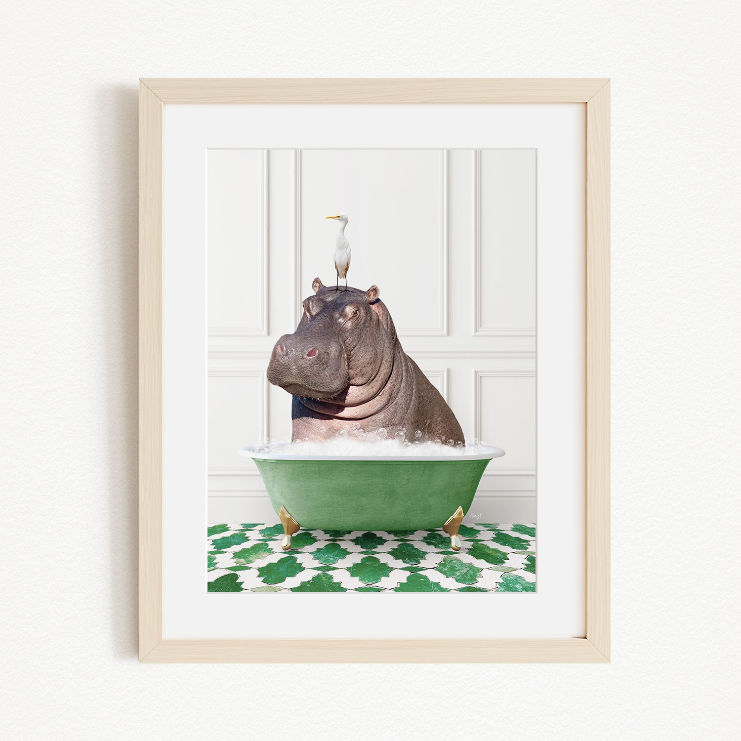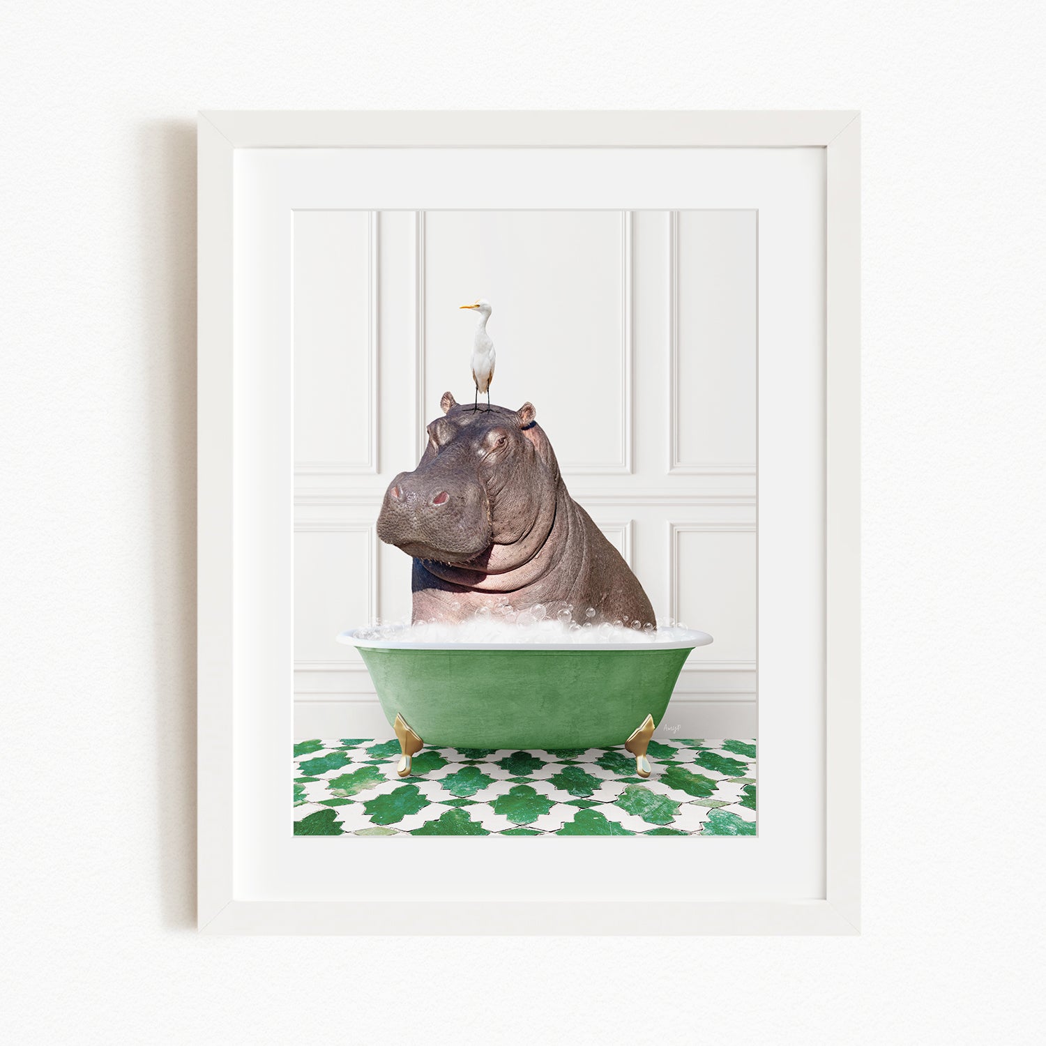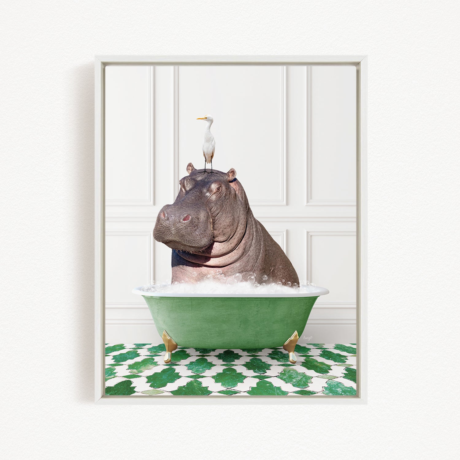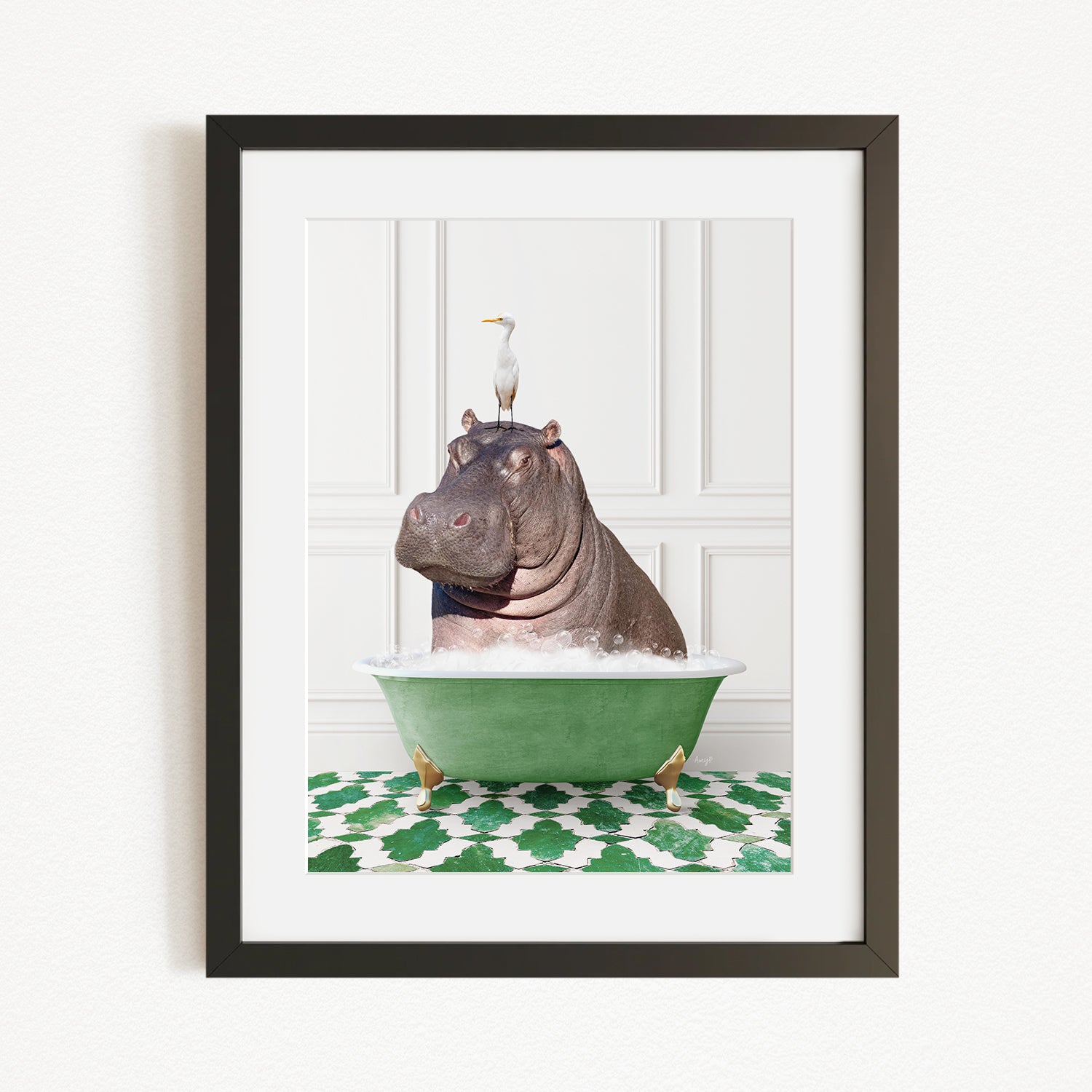 A framed image depicting a hippopotamus sitting in a green bathtub, with a bird perched on its head.
