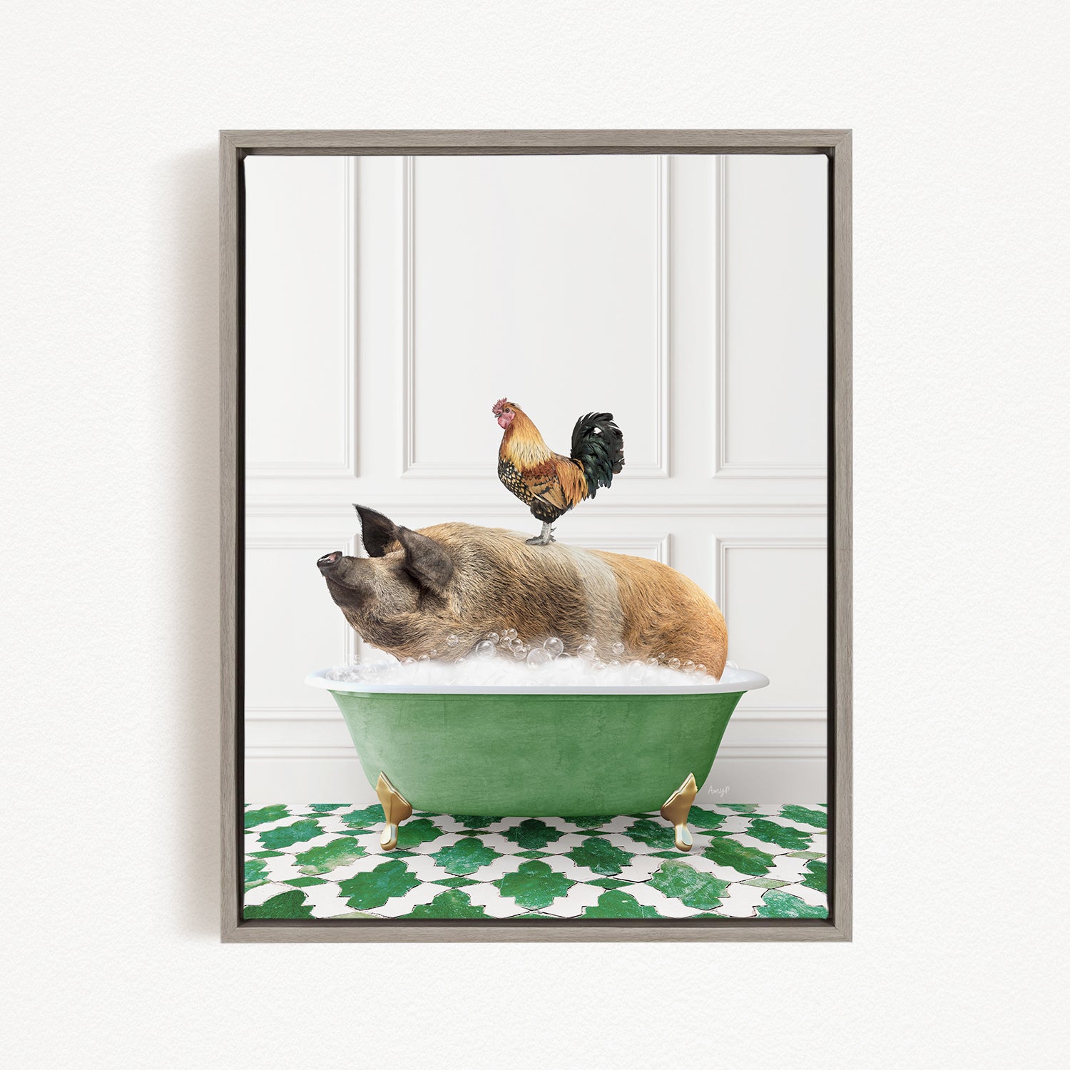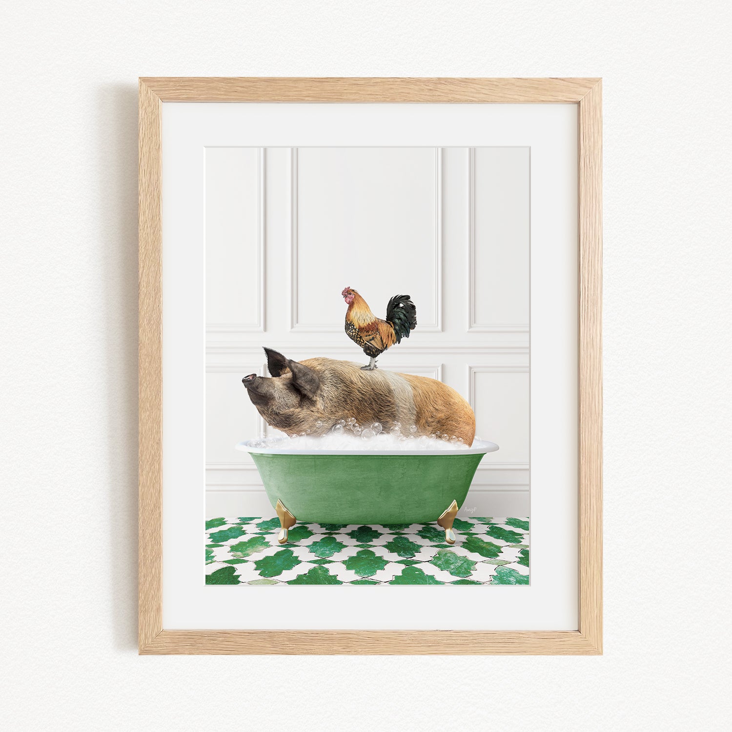 A rooster sits atop a pig in a green bathtub, surrounded by a green and white patterned floor.