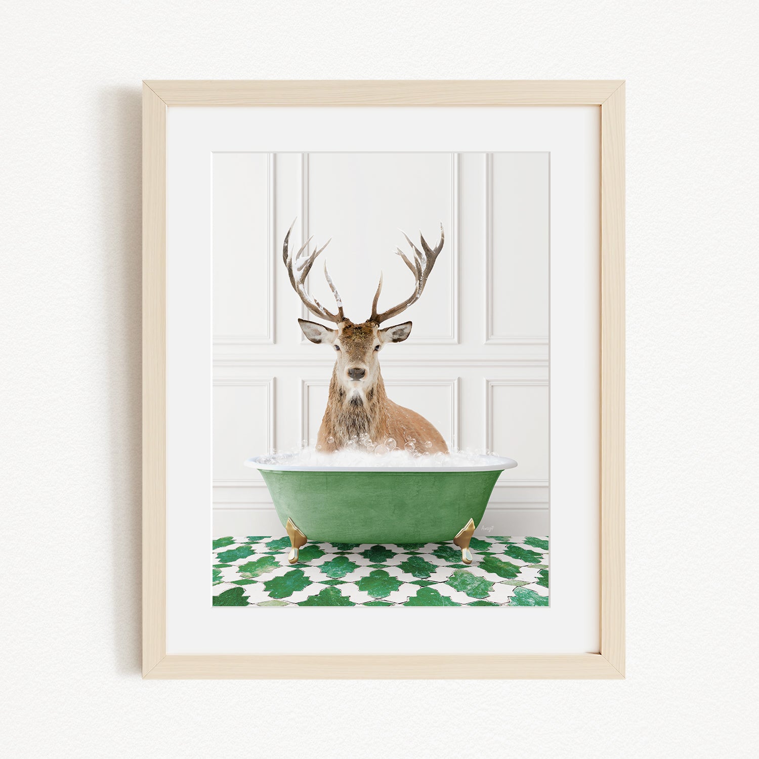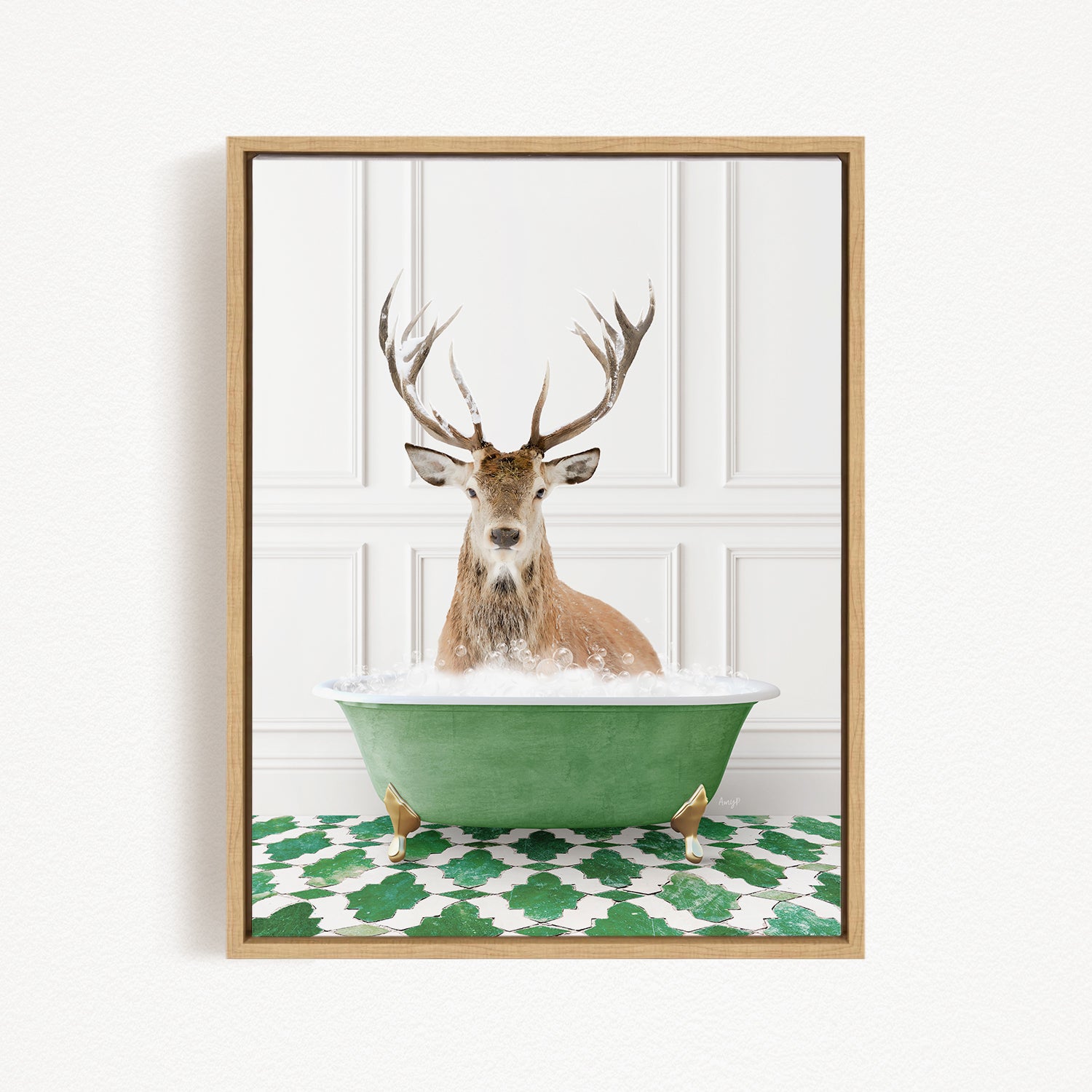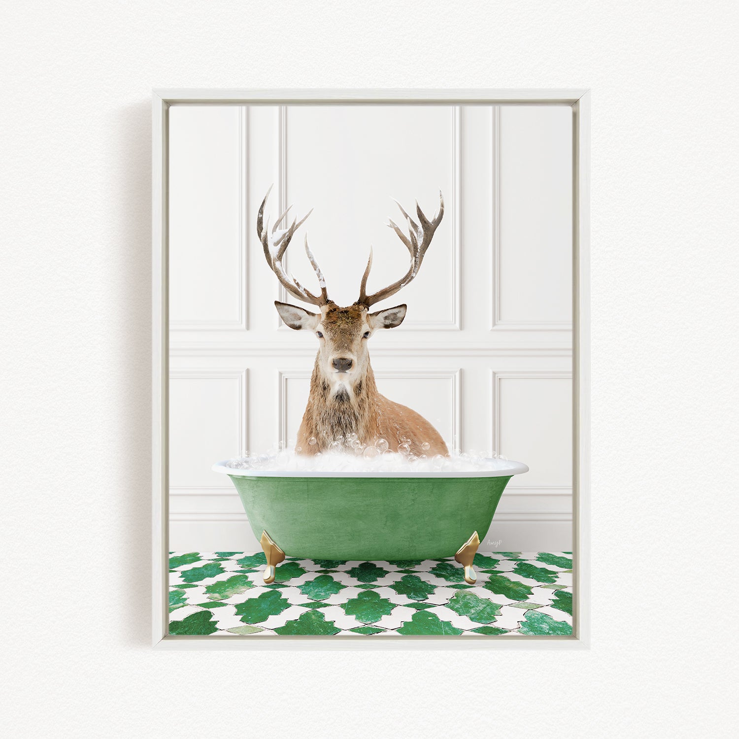 A deer with large antlers is sitting in a green bathtub filled with bubbles, creating a whimsical and humorous scene.
