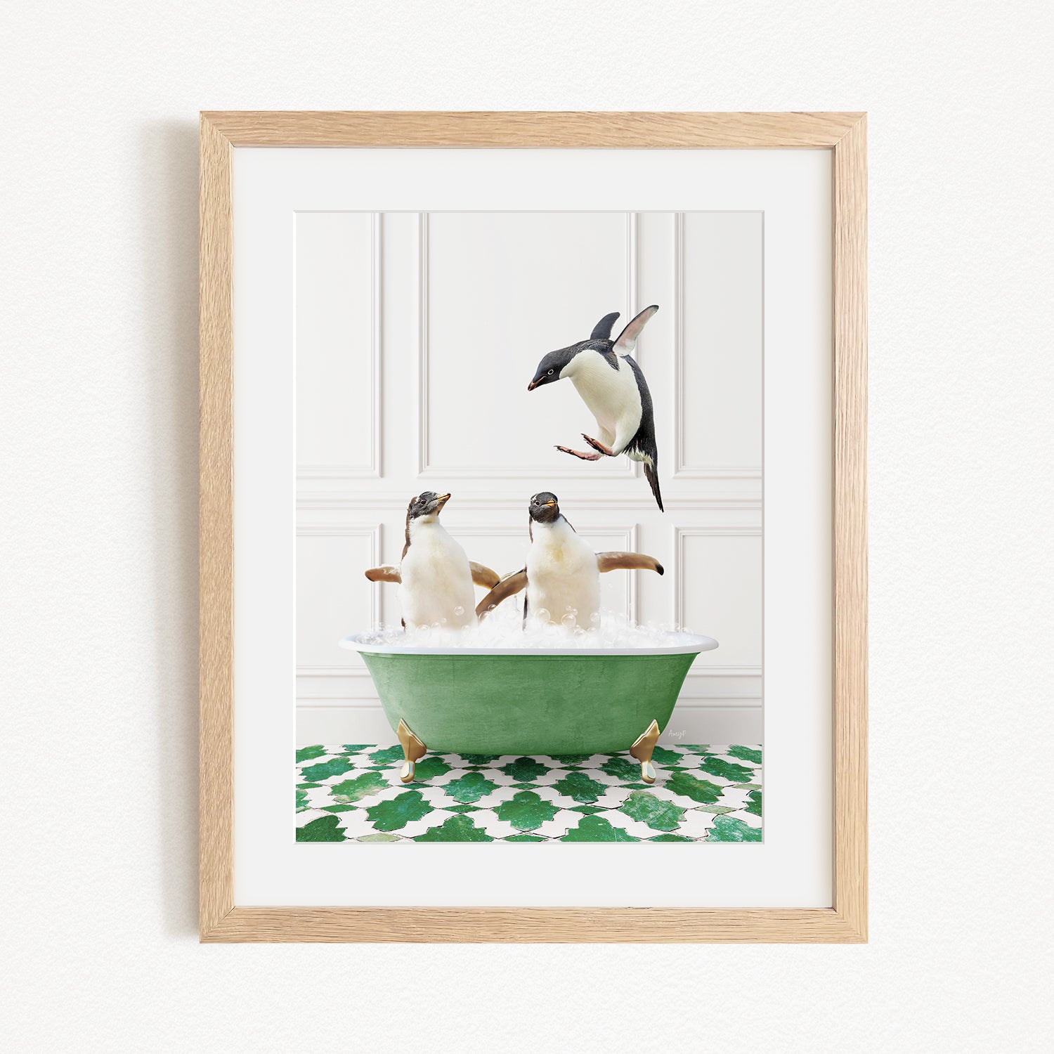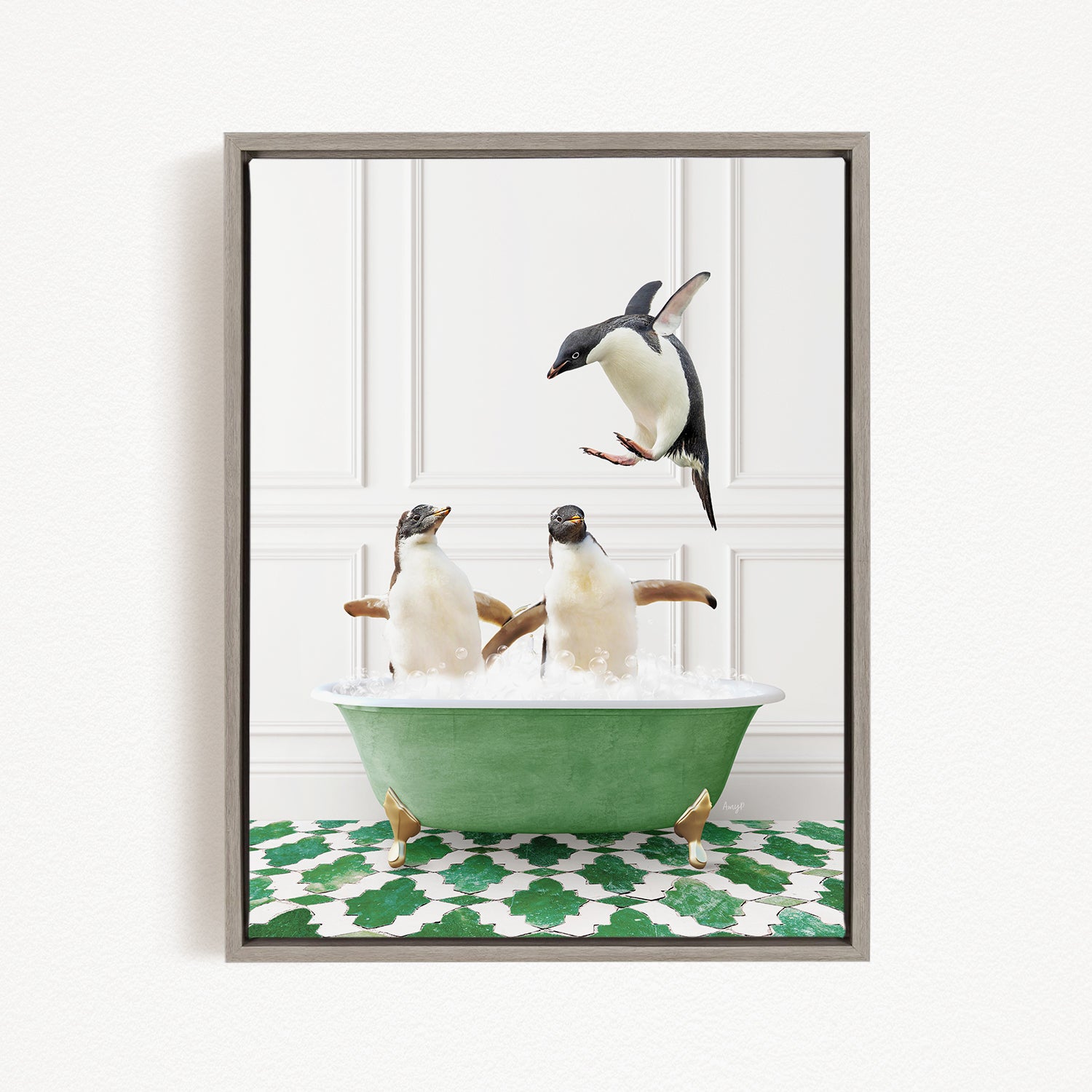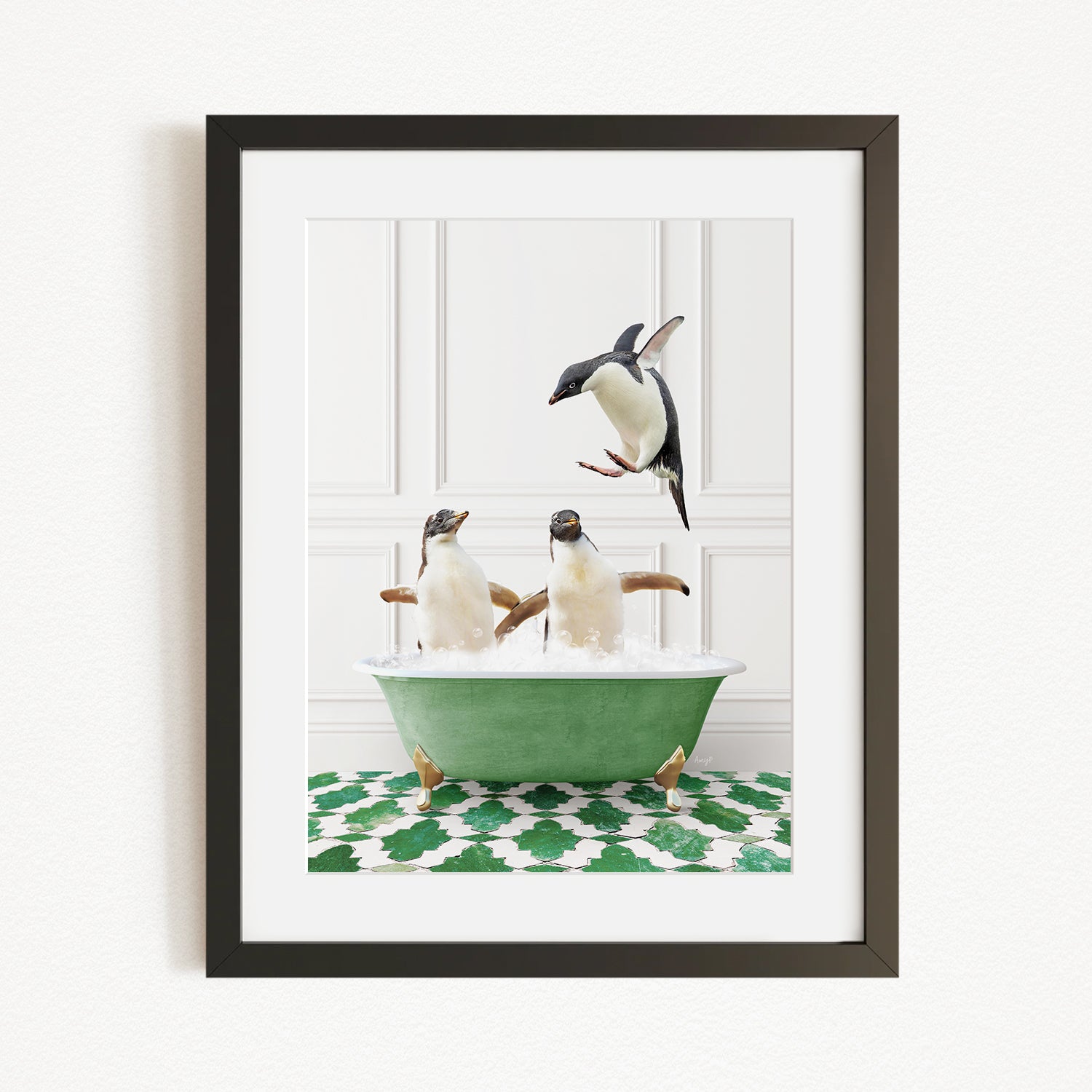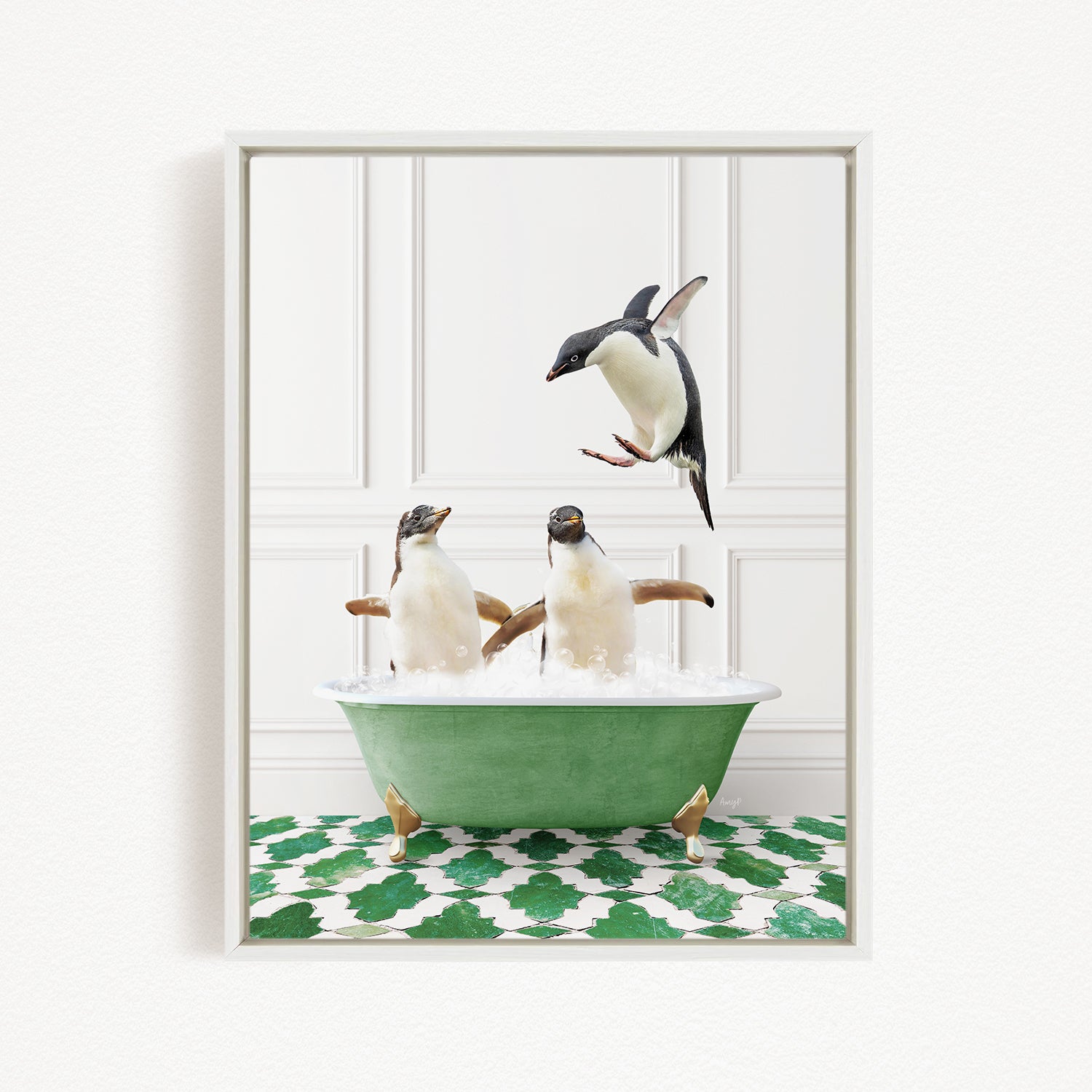 A framed image depicting three penguins in a green bathtub, with one penguin flying above the tub.
