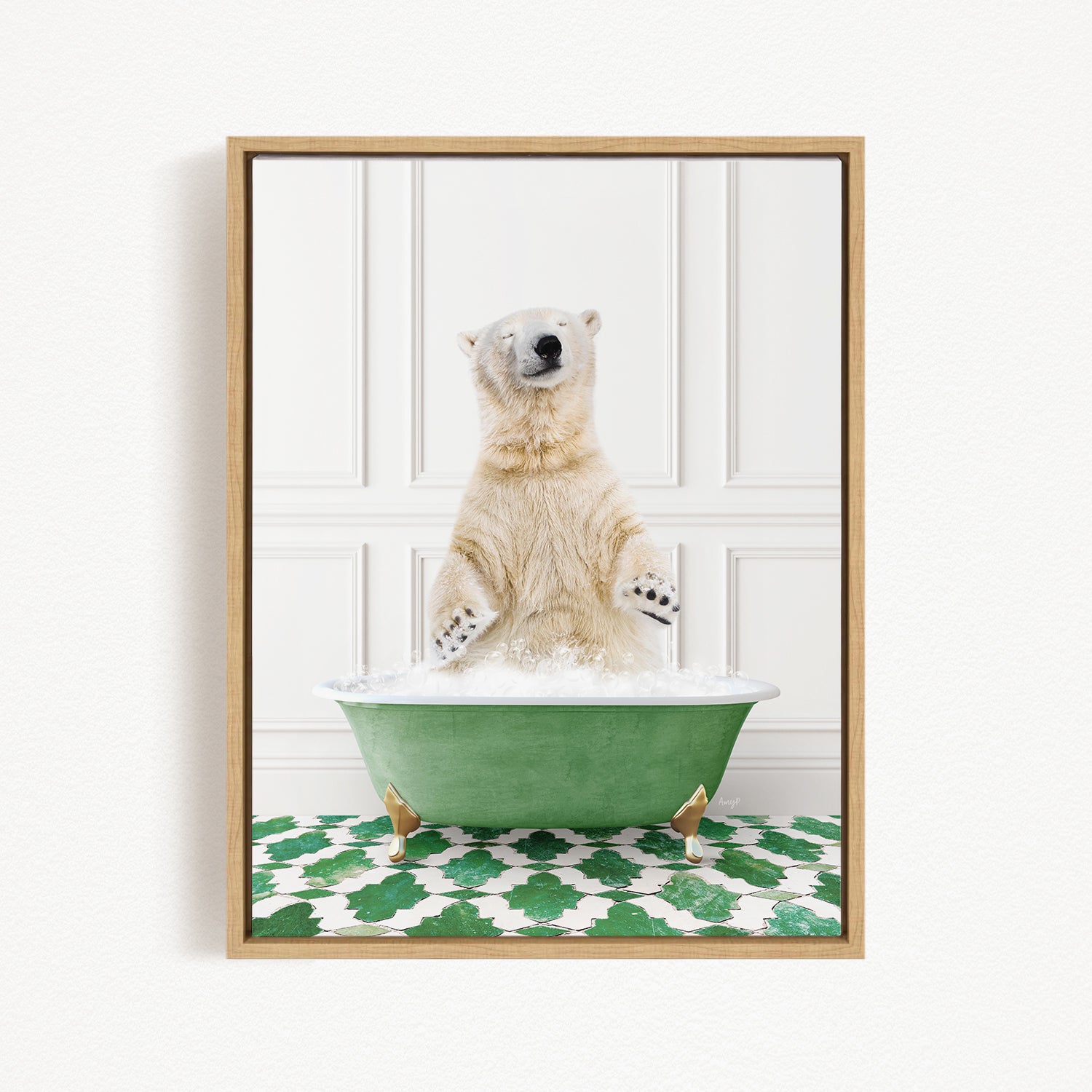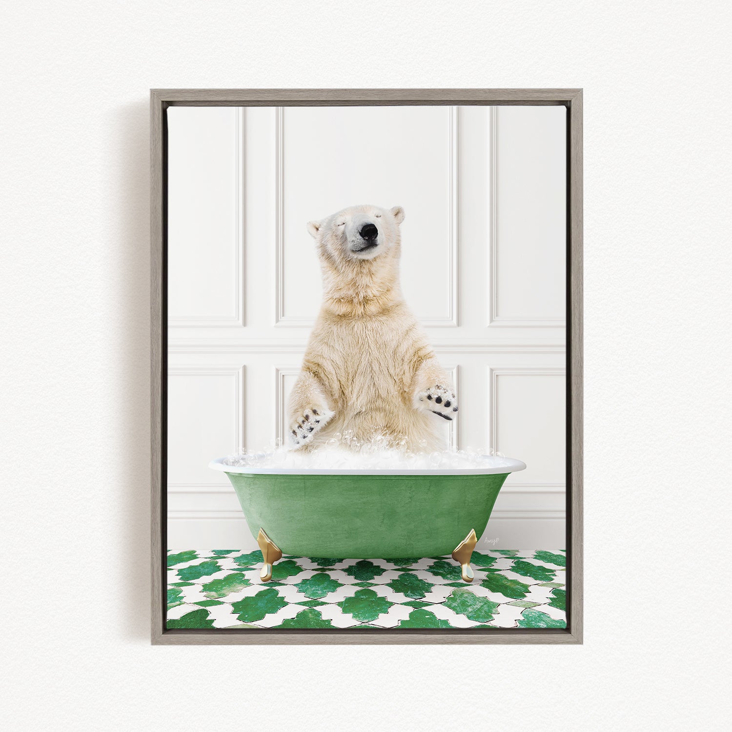 A polar bear sitting in a green bathtub filled with water, surrounded by a green and white patterned rug.