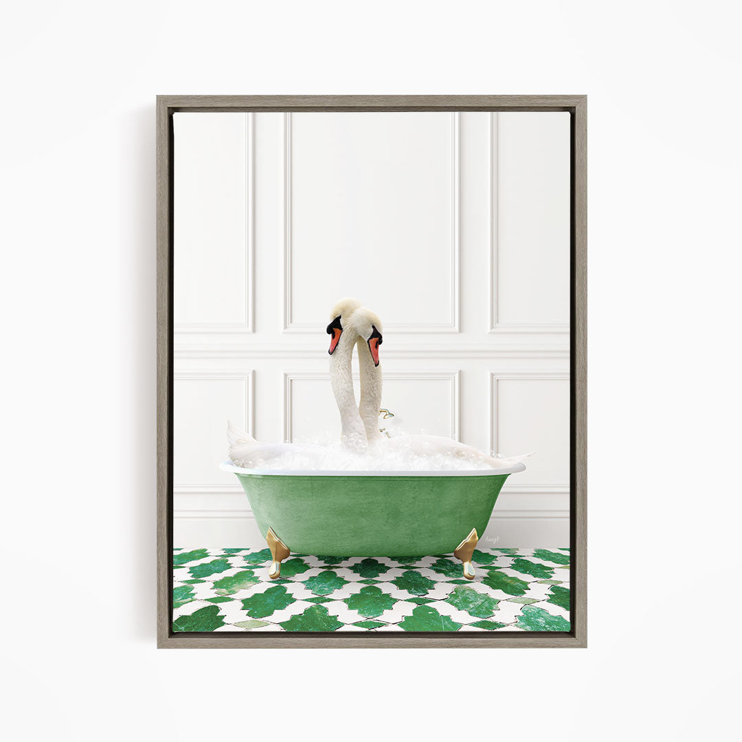 A pair of swans sitting in a green bathtub filled with bubbles, with a green and white patterned floor beneath them.