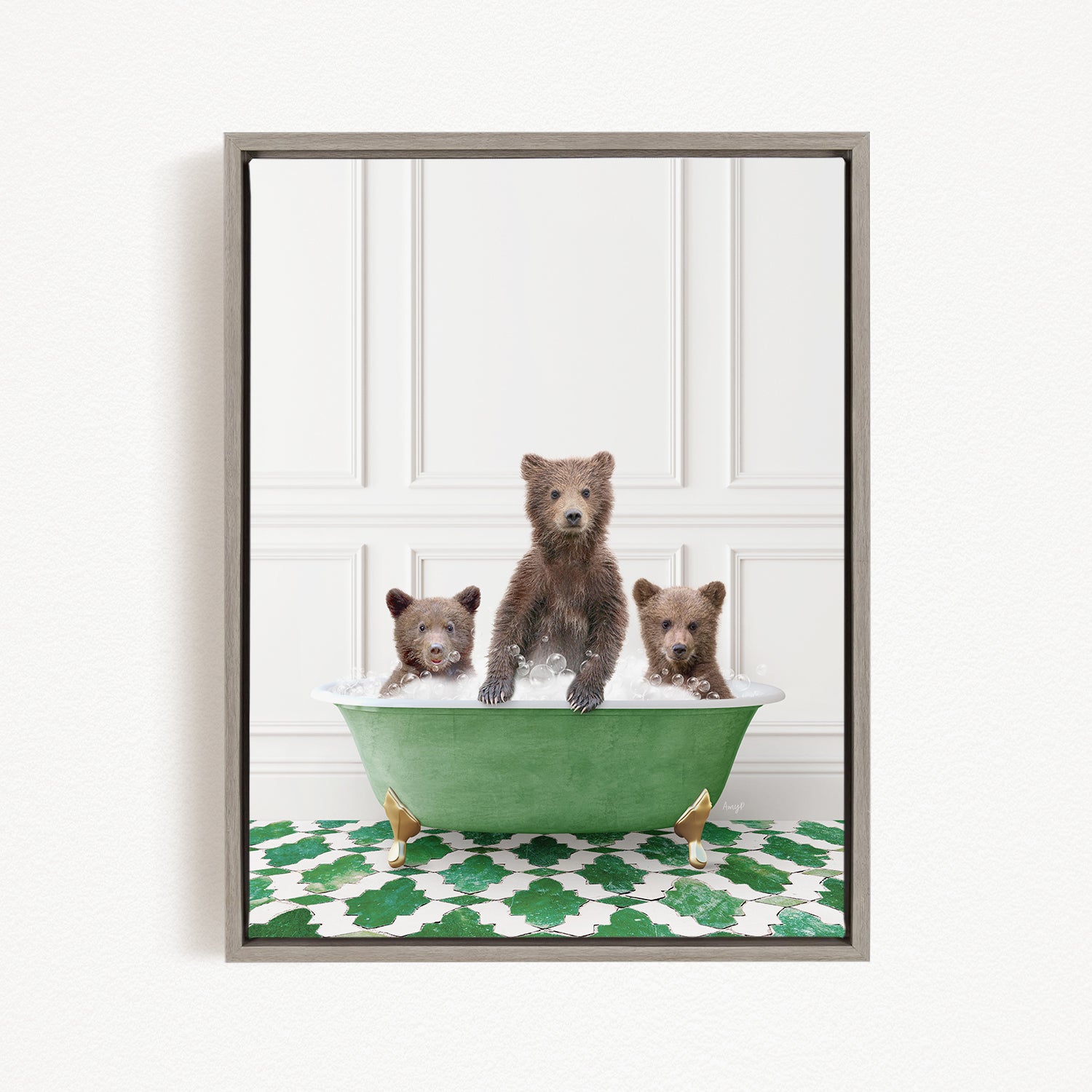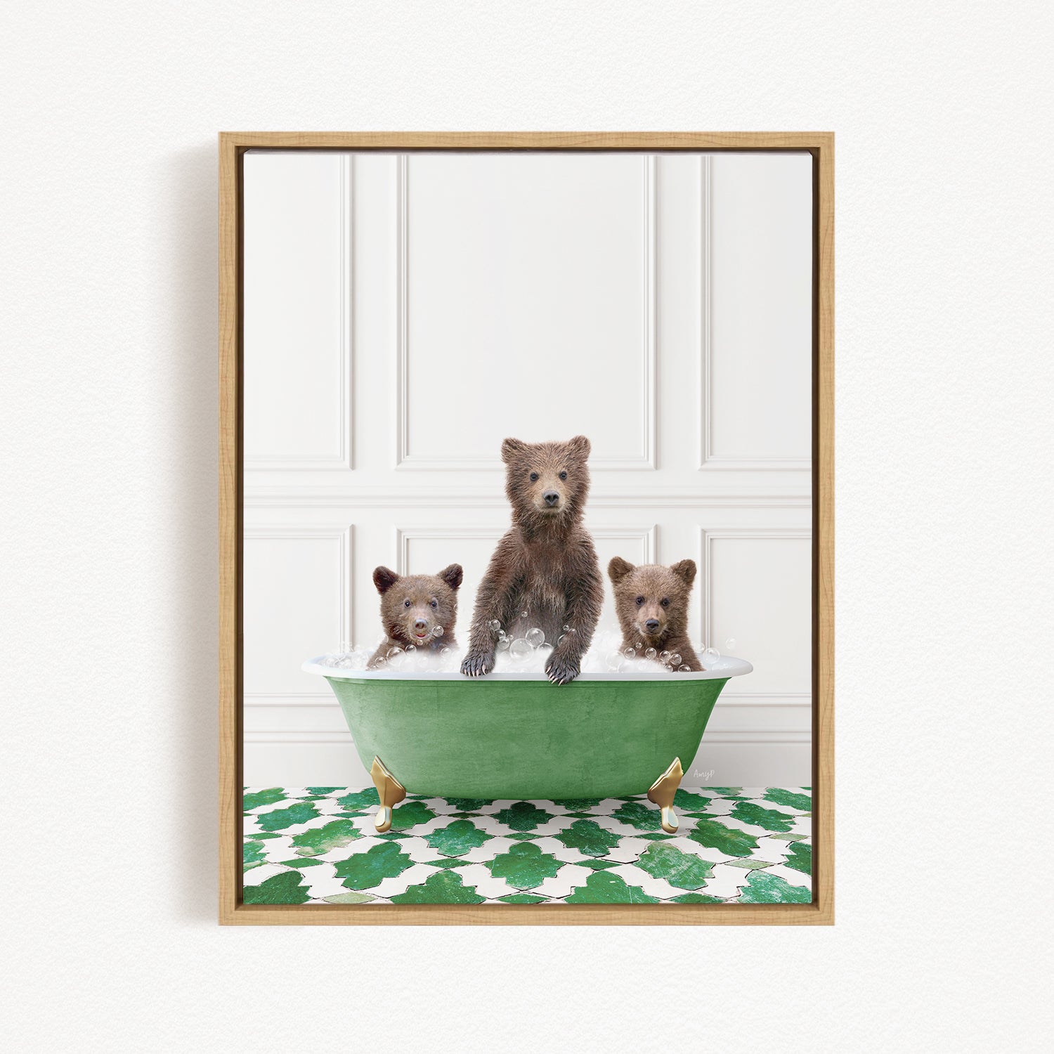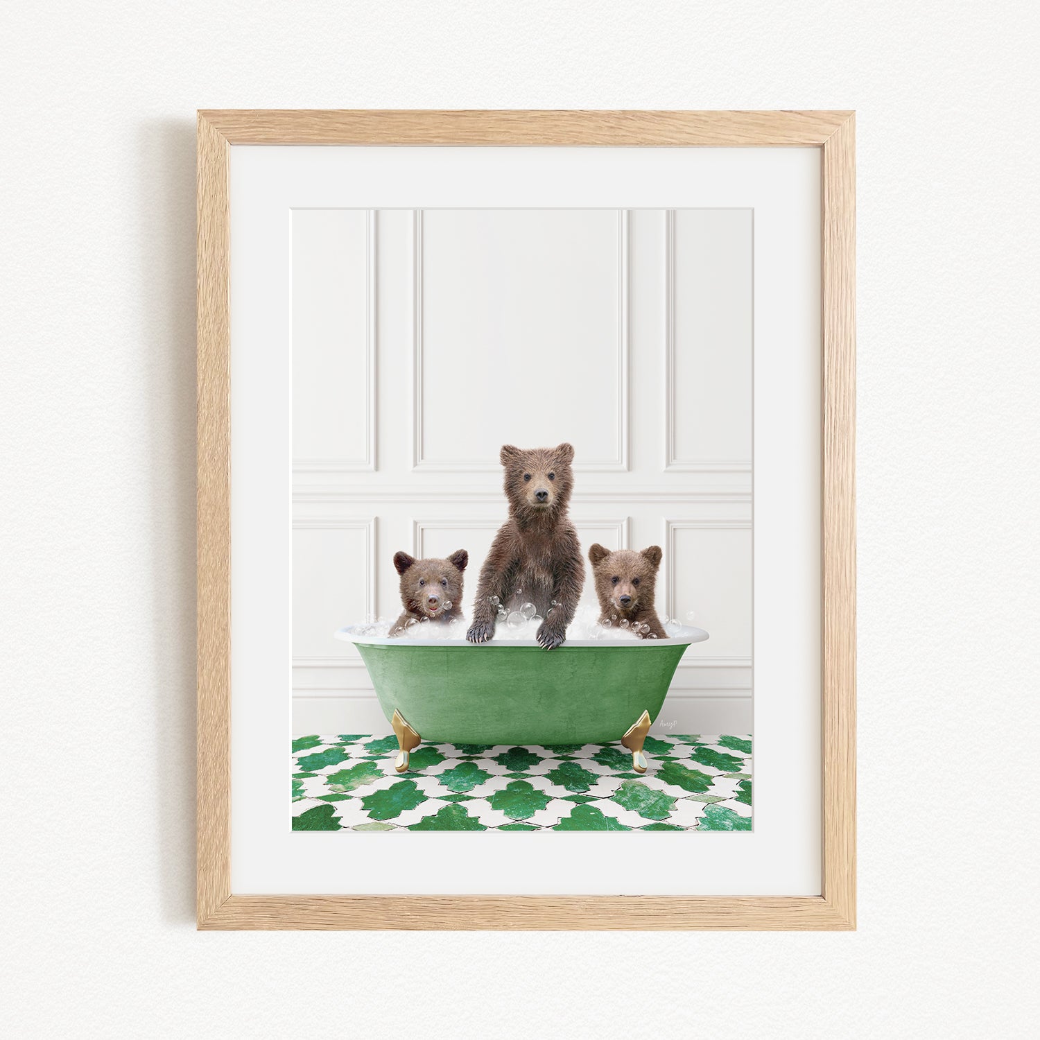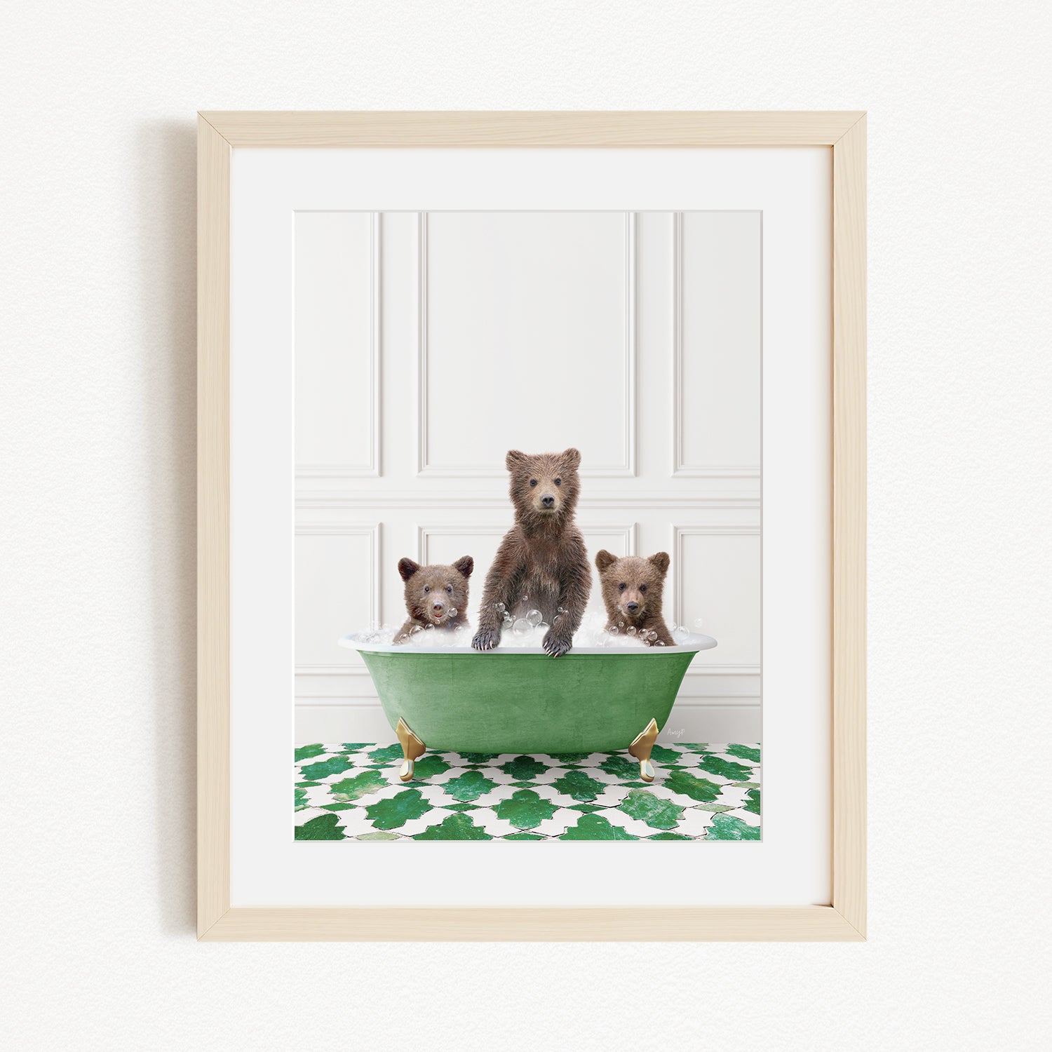 A framed image depicting three brown bears sitting in a green bathtub, with one bear sitting in the center and the other two bears sitting on either side.