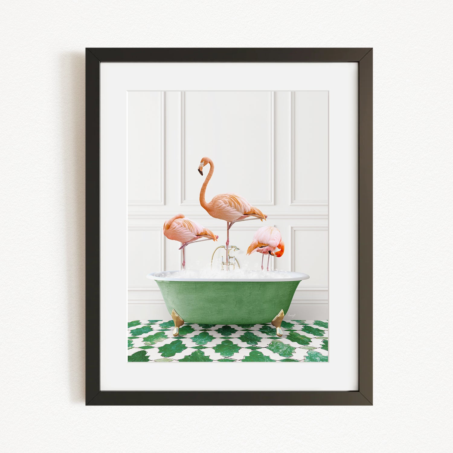 A framed image depicting three pink flamingos standing in a green bathtub on a patterned green and white rug.